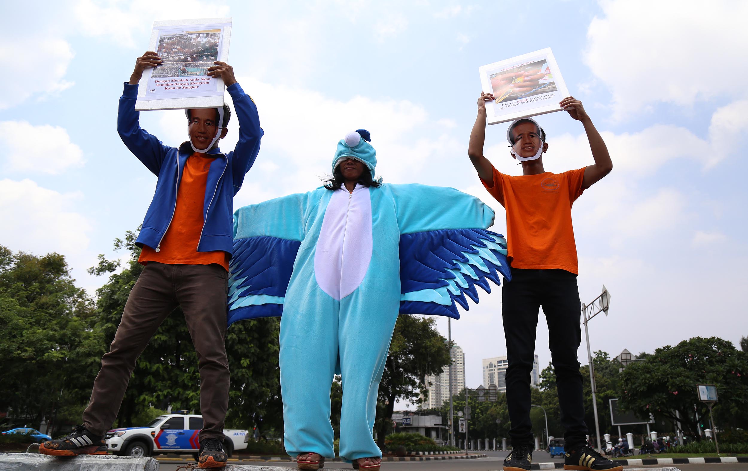 Puluhan massa yang tergabung dalam Yayasan Scorpion Indonesia melakukan aksi di sebrang Istana Merdeka, Jakarta, Rabu (27/1/2016). Burung-burung yang dibeli Presiden Jokowi merupakan burung yang diperdagangkan secara ilegal karena diambil langsung dari habitatnya dan dilakukan tanpa ijin. Aksi Presiden Jokowi yang memborong burung di pasar-pasar satwa liar justru dinilai merupakan bentuk dukungannya terhadap perdagangan ilegal satwa liar.