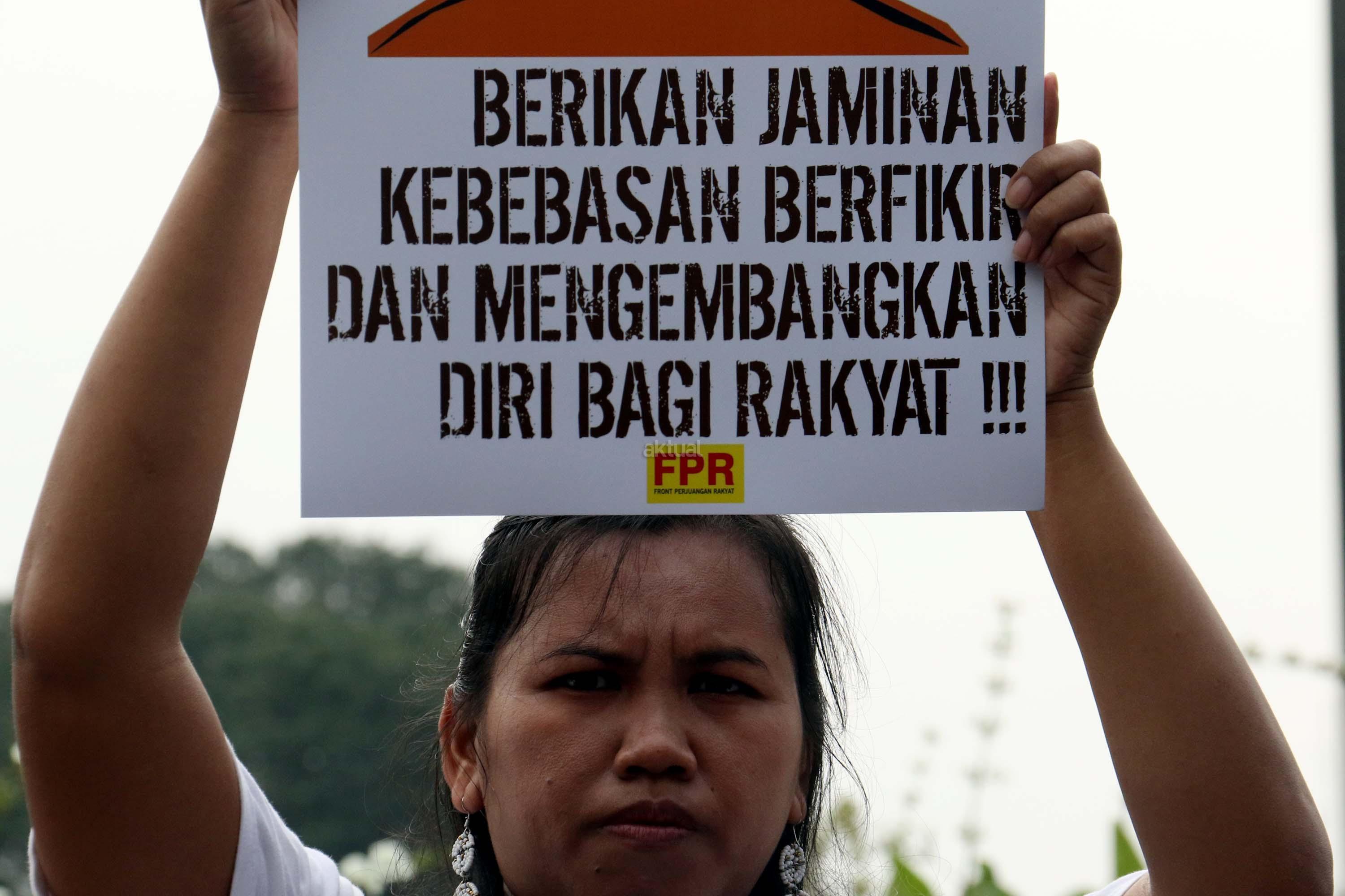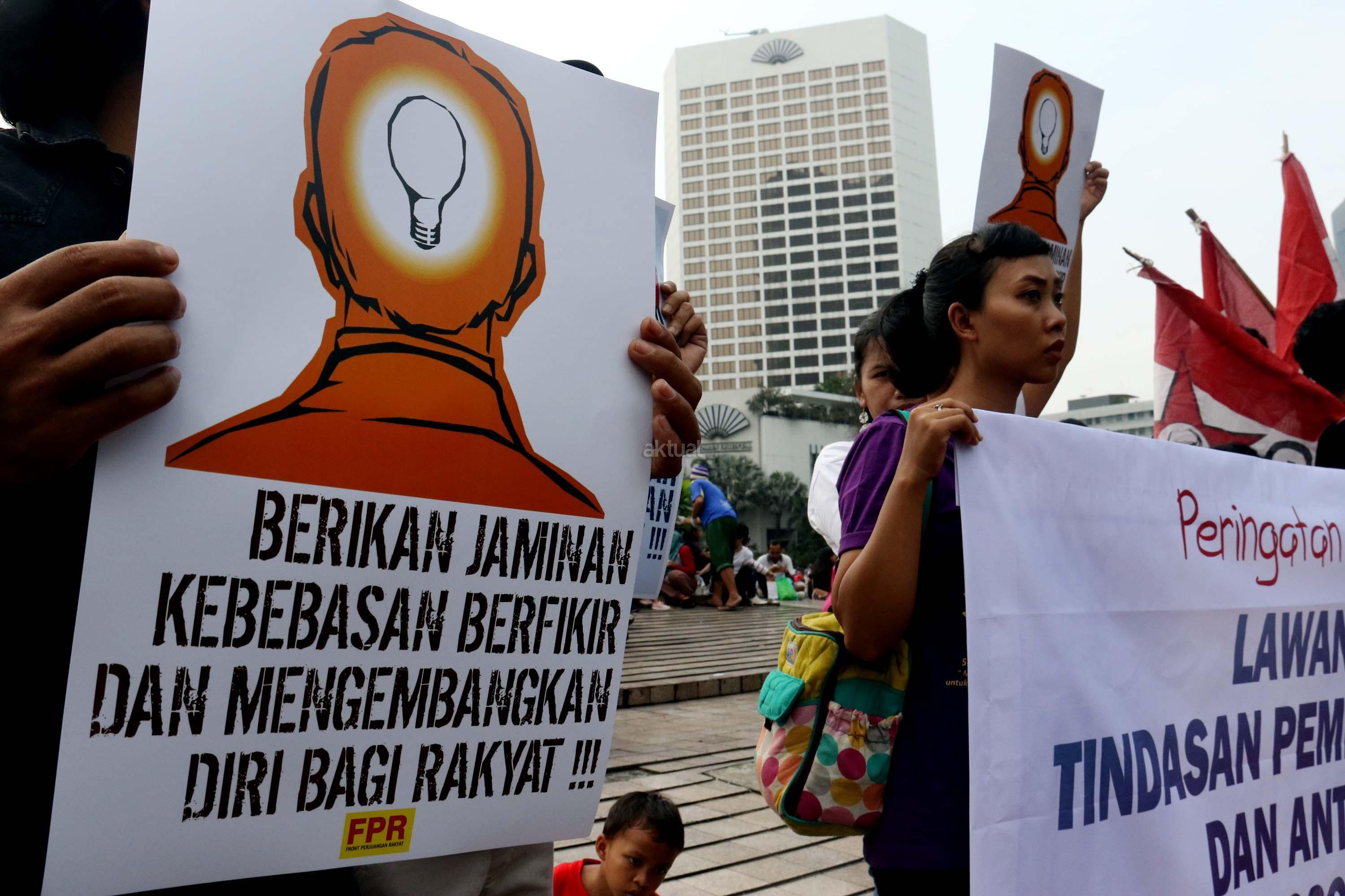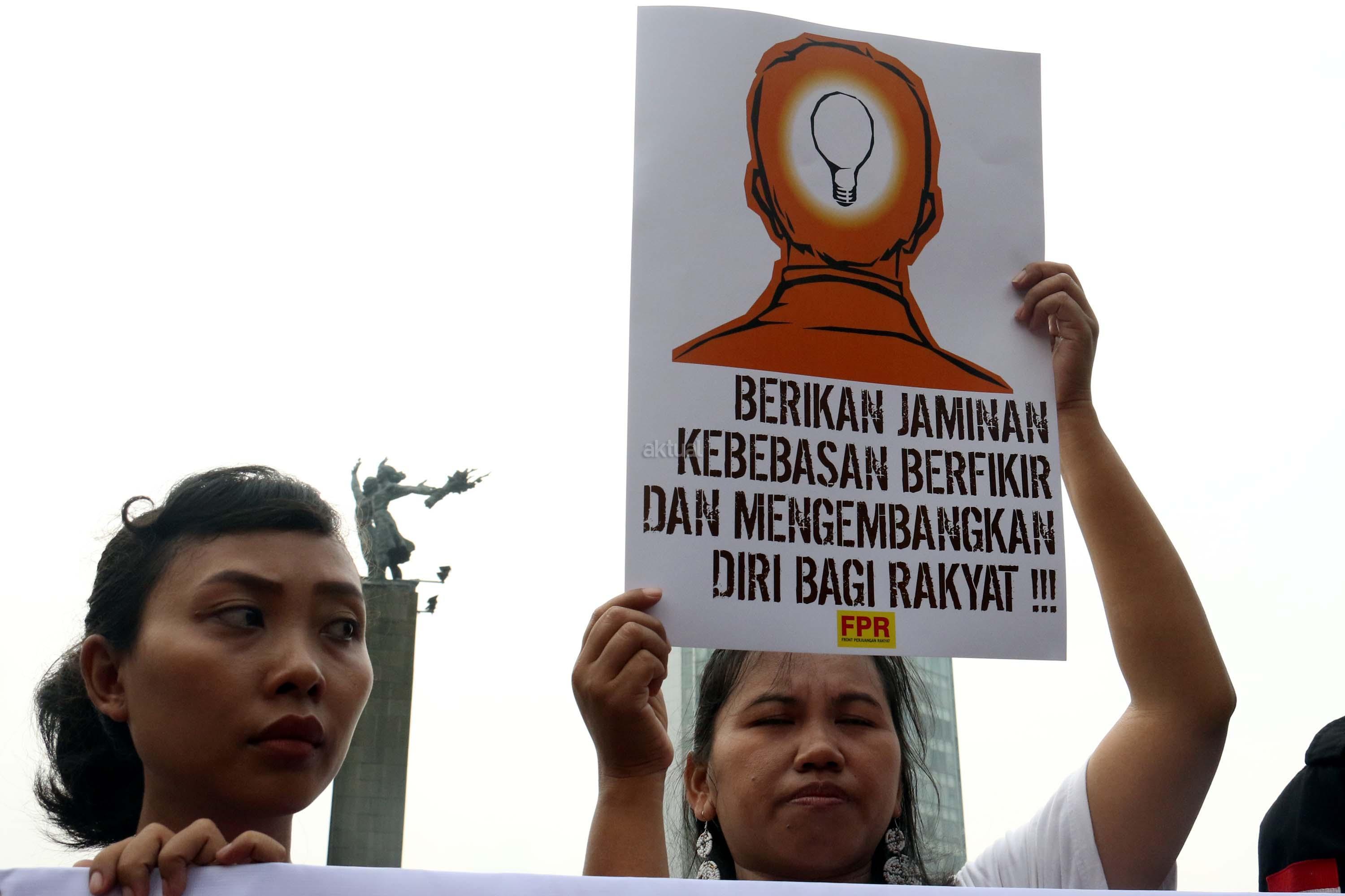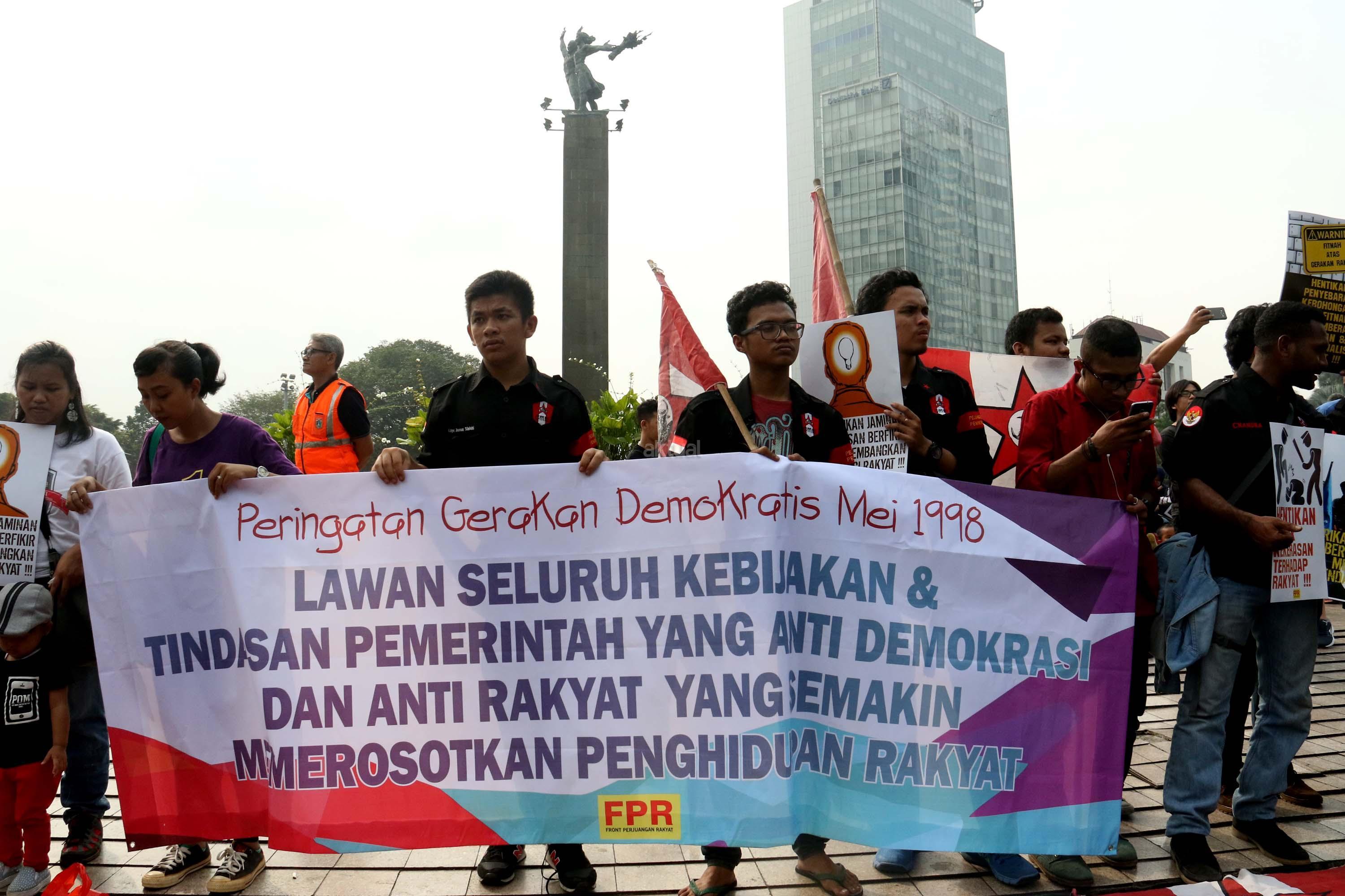 Dalam aksinya Front Perjuangan Rakyat (FPR) untuk memperingati 19 tahun Reformasi dan menolak keputusan pemerintah secara sepihak akan membubarkan organisasi dengan tudahan radikalisme dan membahayakan NKRI, cabut seluruh Perda yang membatasi kebebasan berpendapat di muka umum. AKTUAL/Munzir