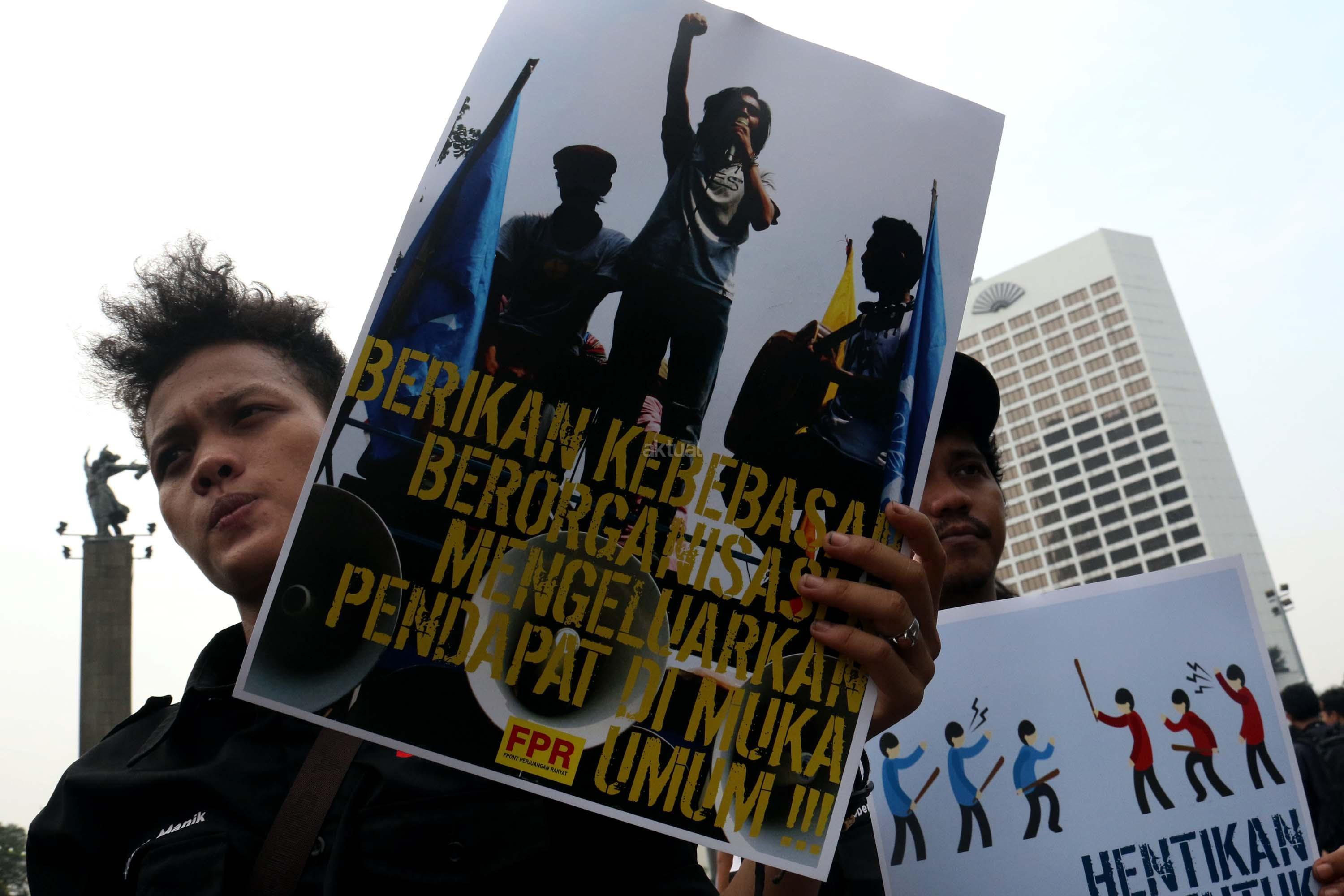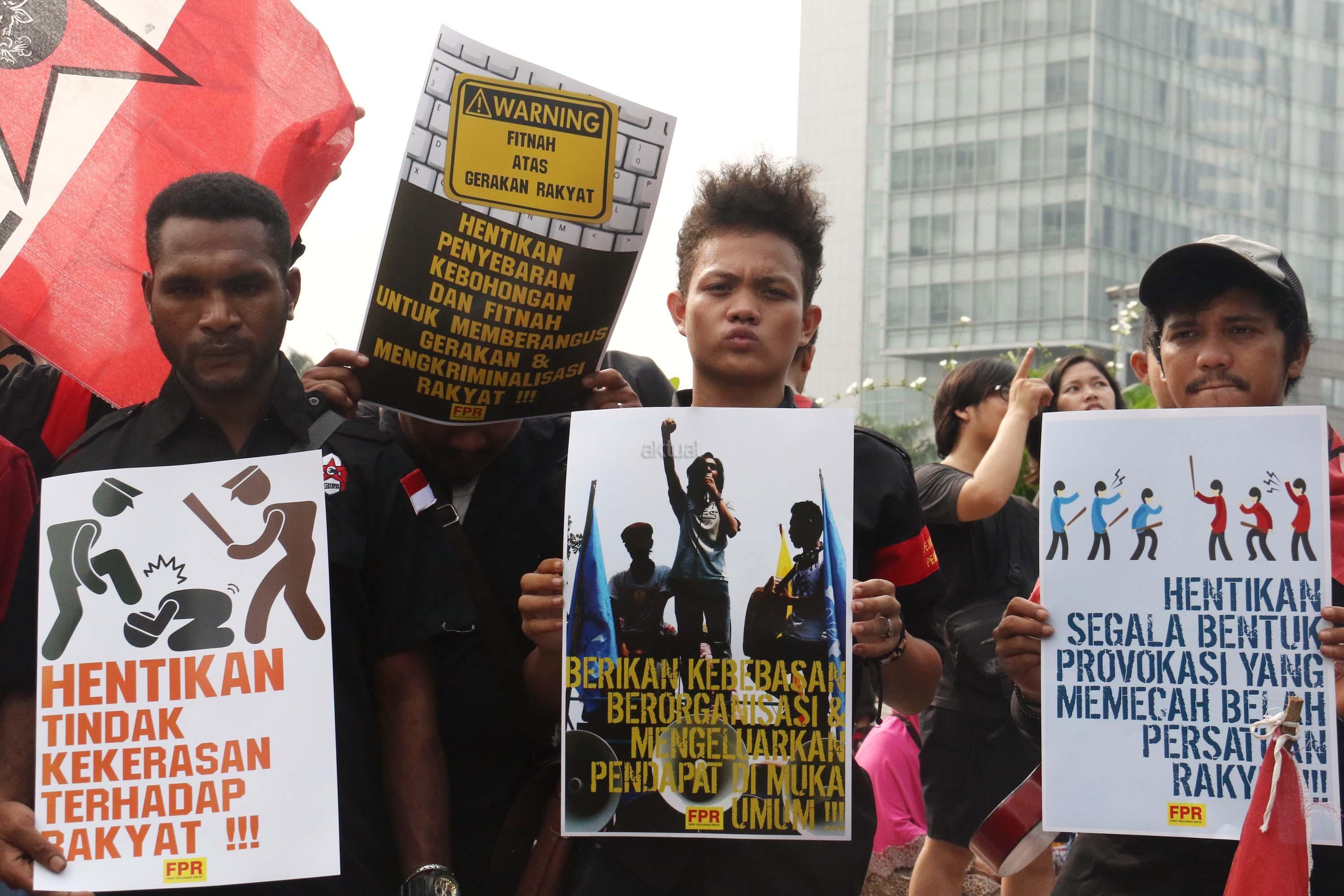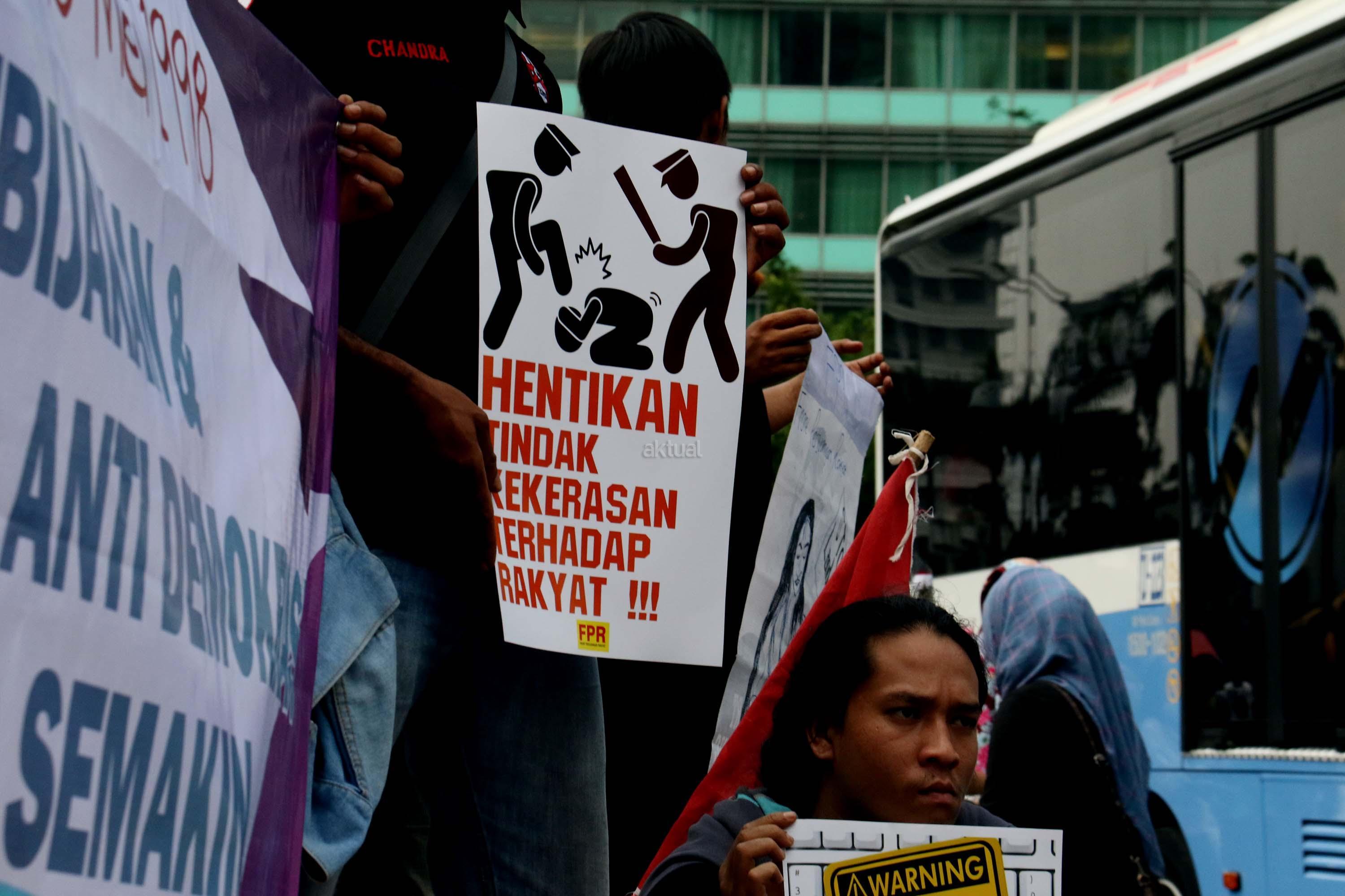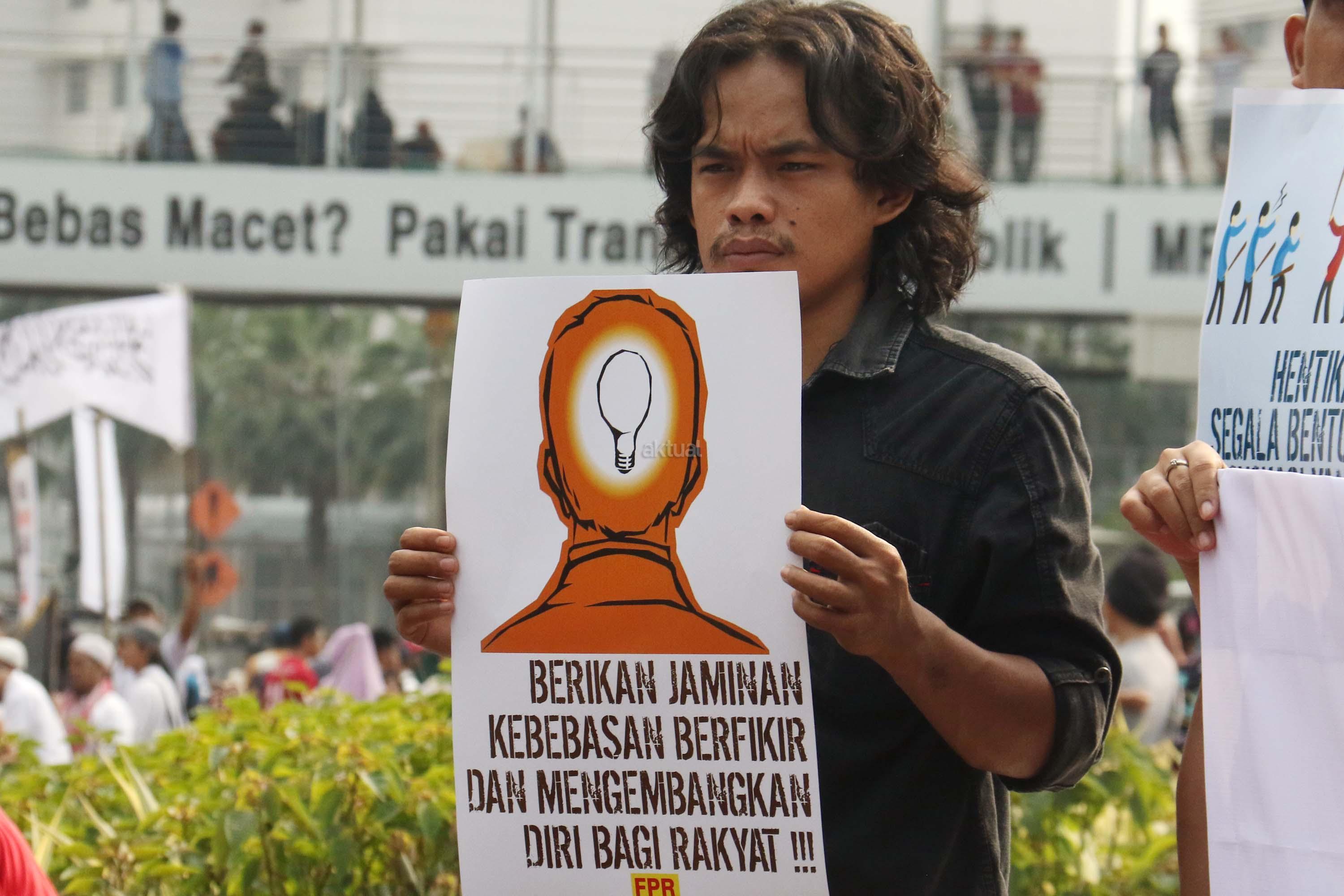 Dalam aksinya Front Perjuangan Rakyat (FPR) untuk memperingati 19 tahun Reformasi dan menolak keputusan pemerintah secara sepihak akan membubarkan organisasi dengan tudahan radikalisme dan membahayakan NKRI, cabut seluruh Perda yang membatasi kebebasan berpendapat di muka umum. AKTUAL/Munzir