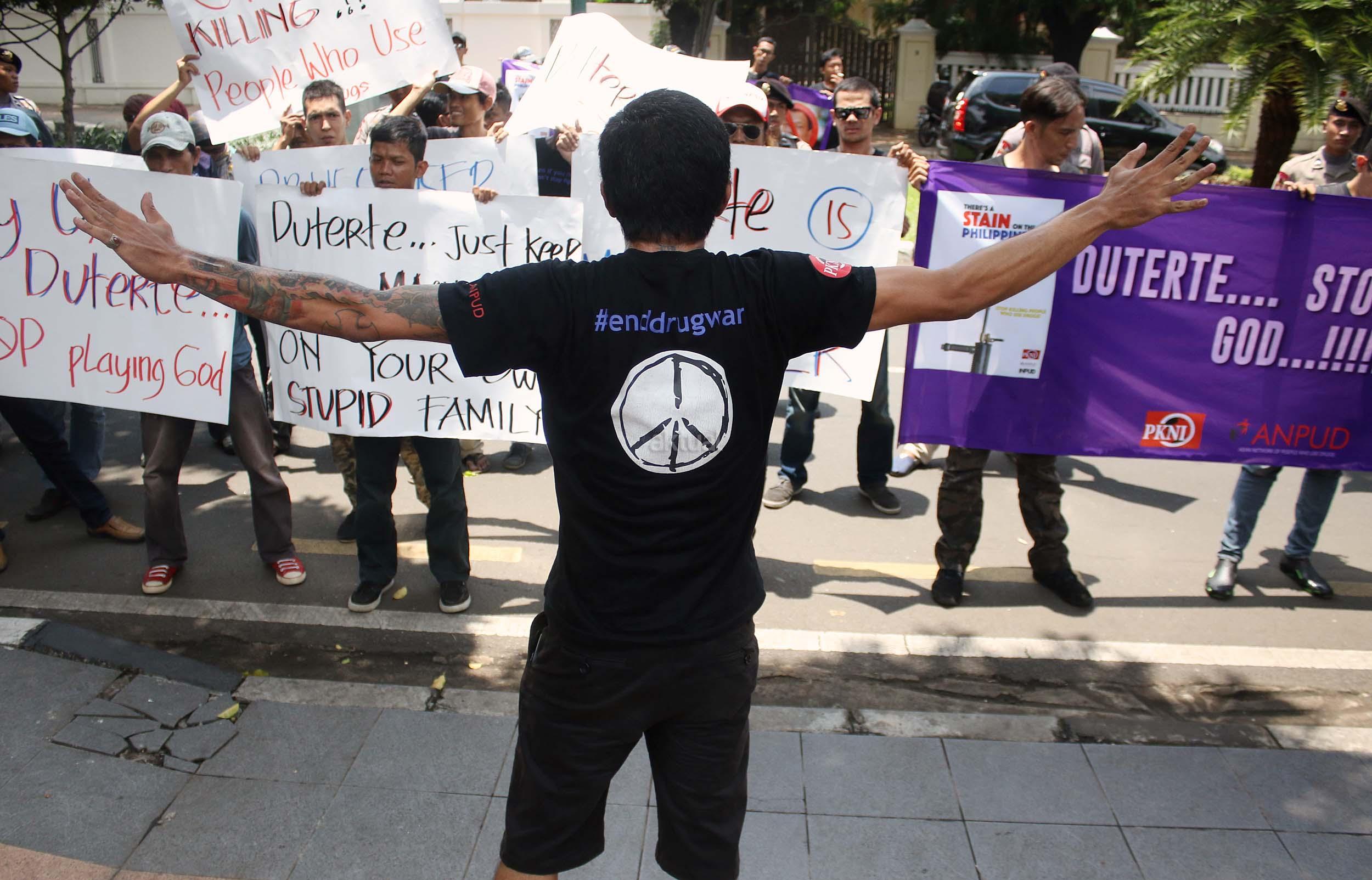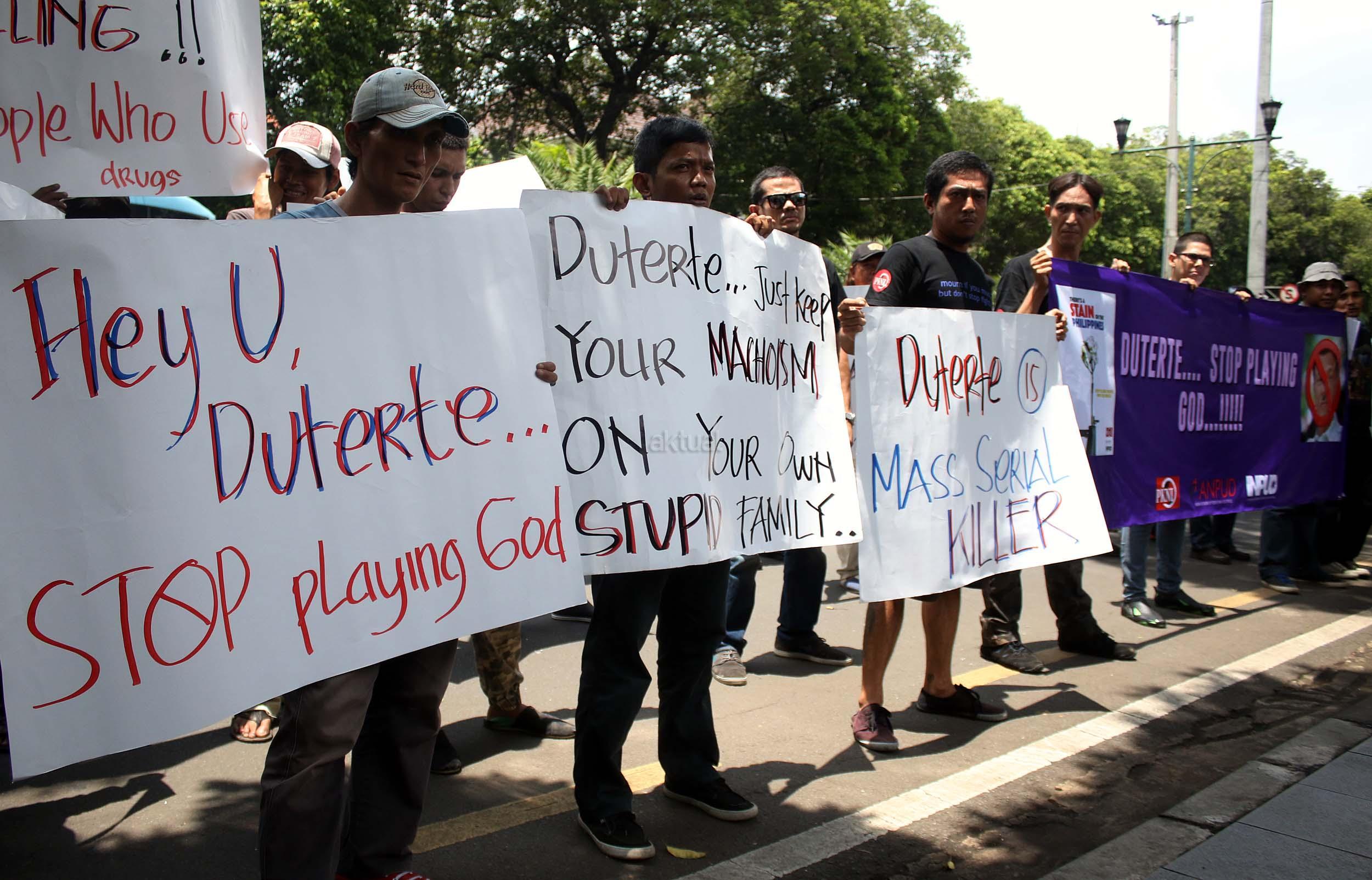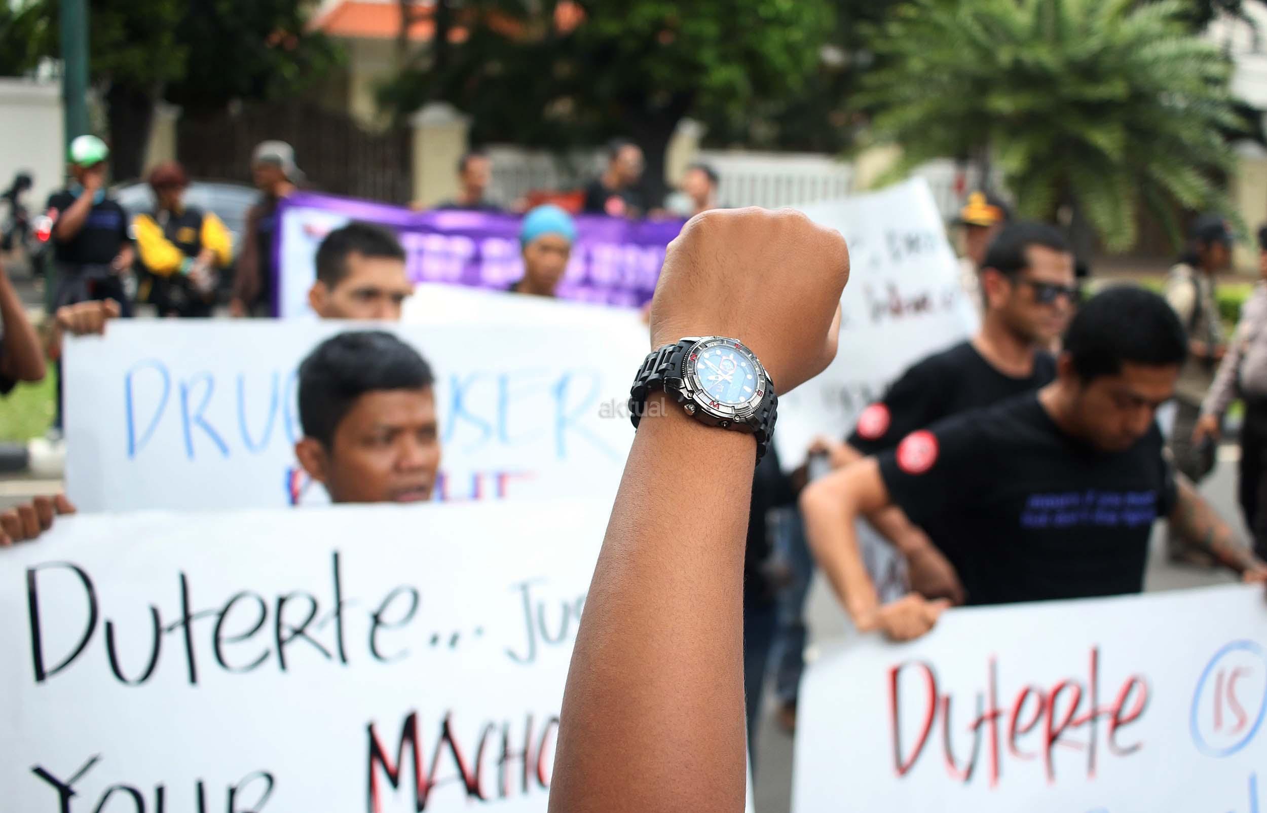Sejumlah massa yang tergabung dalam Persaudaraan Korban Napza Indonesia (PKNI) melakukan aksi unjuk rasa didepan Kedutaan Besar Filipina, Jakarta, Selasa (11/10/2016). Dalam aksinya Persaudaraan Korban Napza Indonesia (PKNI) mengecam tindakan pembunuhan diluar proses hukum (extrajudiciak killing) terhadap para korban Napza atas nama perang terhadap narkotika seperti yang dilukakan oleh Presiden Filipina Redrigo Duterte.
