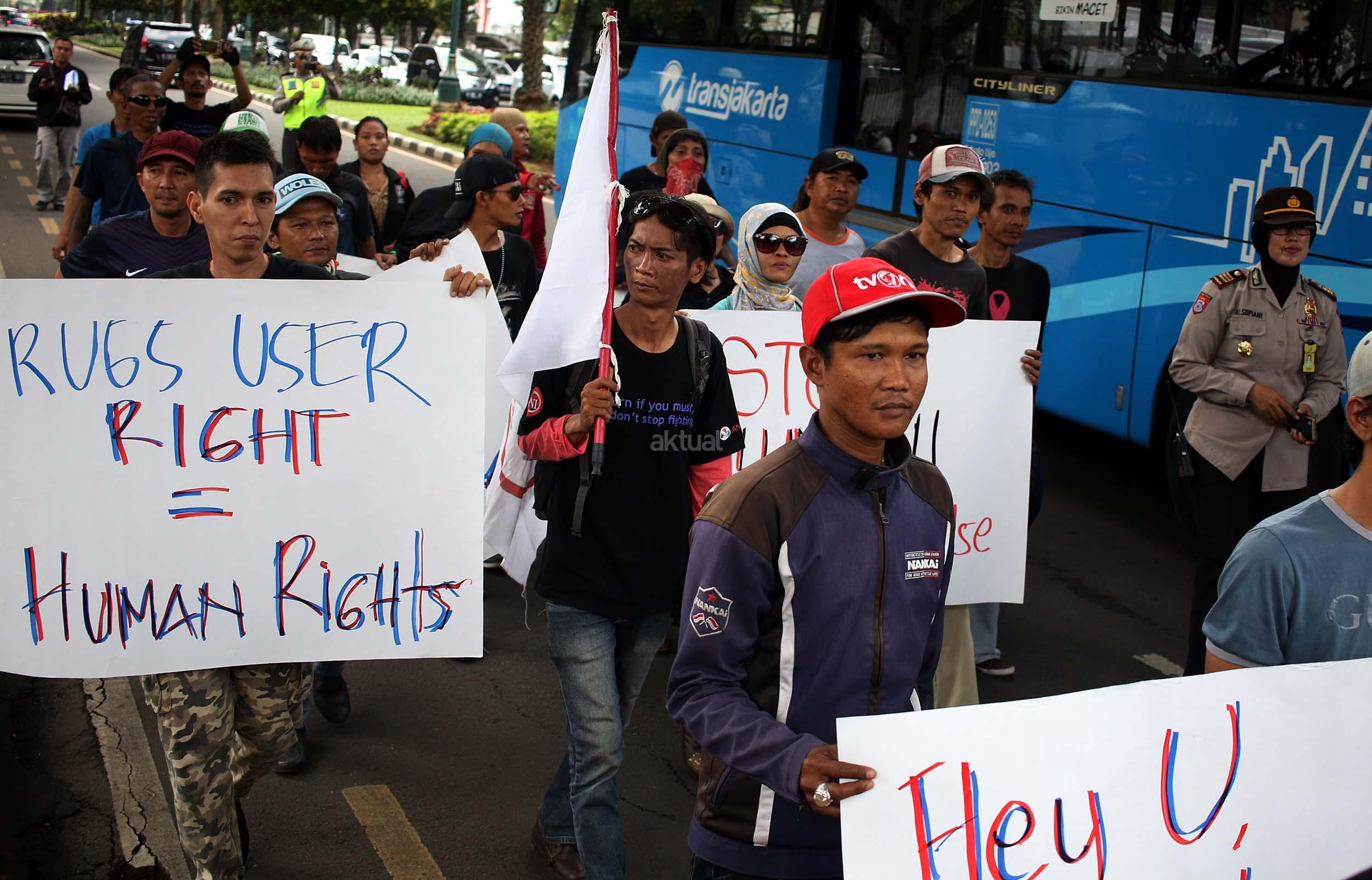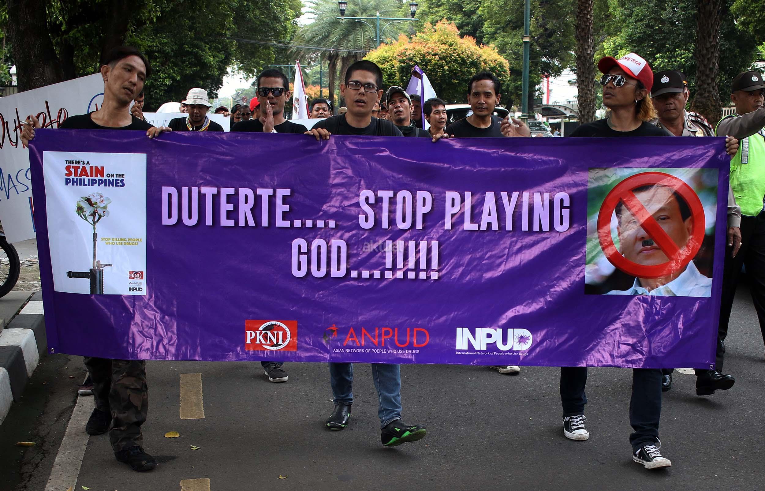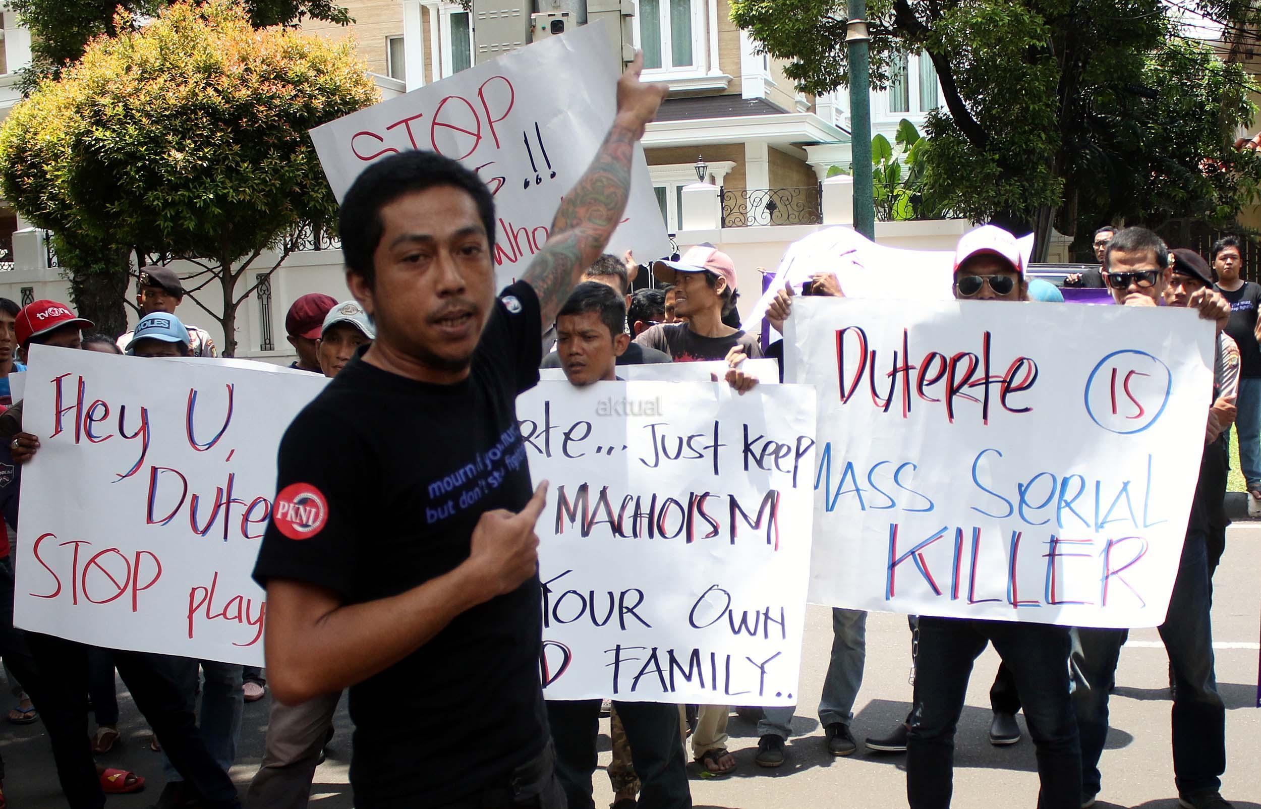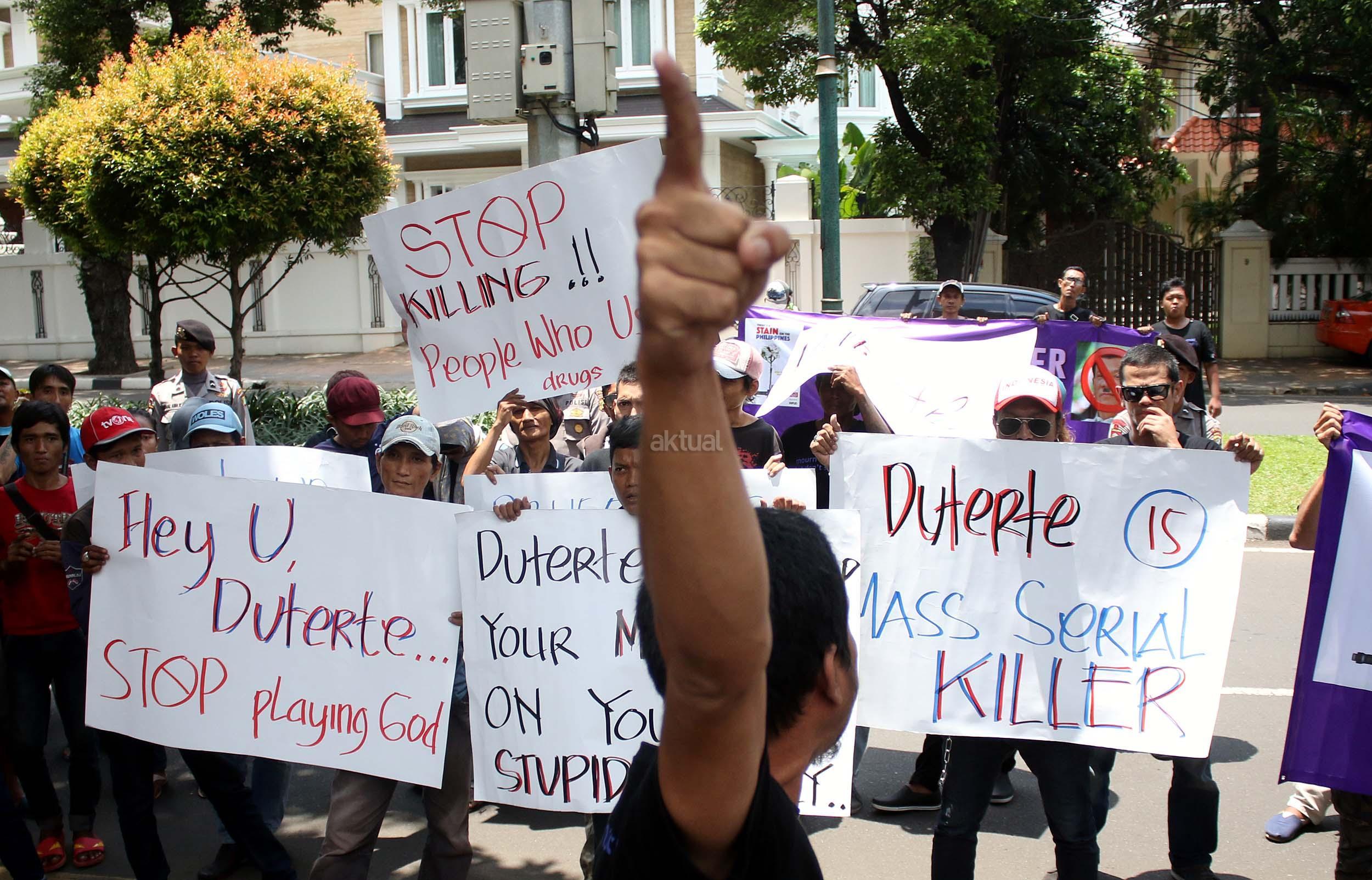 Sejumlah massa yang tergabung dalam Persaudaraan Korban Napza Indonesia (PKNI) melakukan aksi unjuk rasa didepan Kedutaan Besar Filipina, Jakarta, Selasa (11/10/2016). Dalam aksinya Persaudaraan Korban Napza Indonesia (PKNI) mengecam tindakan pembunuhan diluar proses hukum (extrajudiciak killing) terhadap para korban Napza atas nama perang terhadap narkotika seperti yang dilukakan oleh Presiden Filipina Redrigo Duterte.