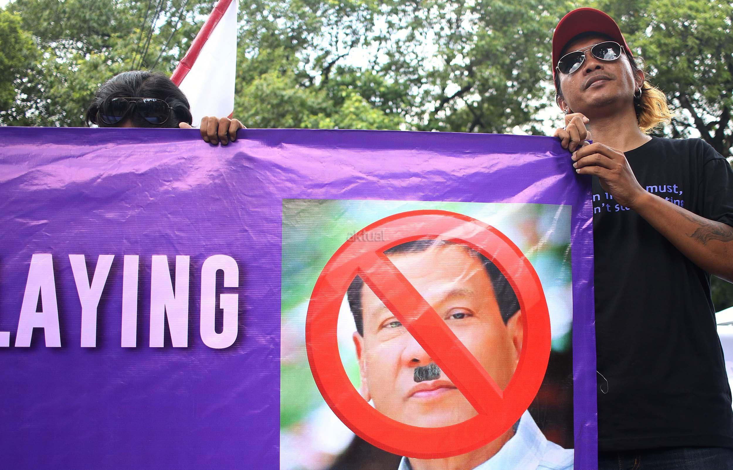 Dalam aksinya Persaudaraan Korban Napza Indonesia (PKNI) mengecam tindakan pembunuhan diluar proses hukum (extrajudiciak killing) terhadap para korban Napza atas nama perang terhadap narkotika seperti yang dilukakan oleh Presiden Filipina Redrigo Duterte. Aktual/Munzir