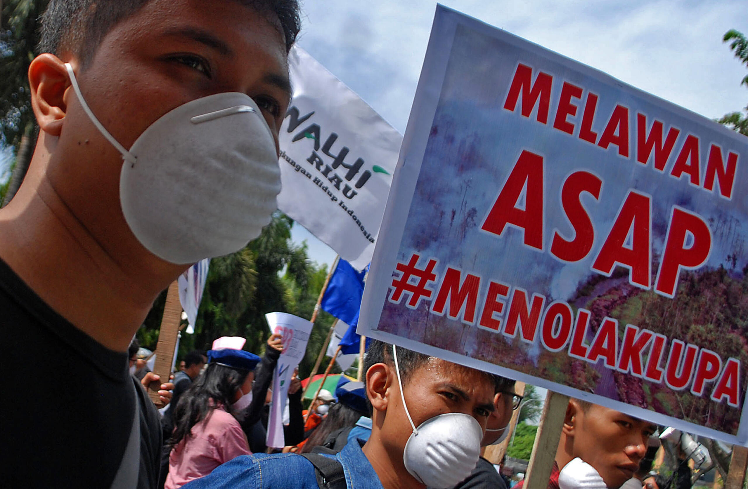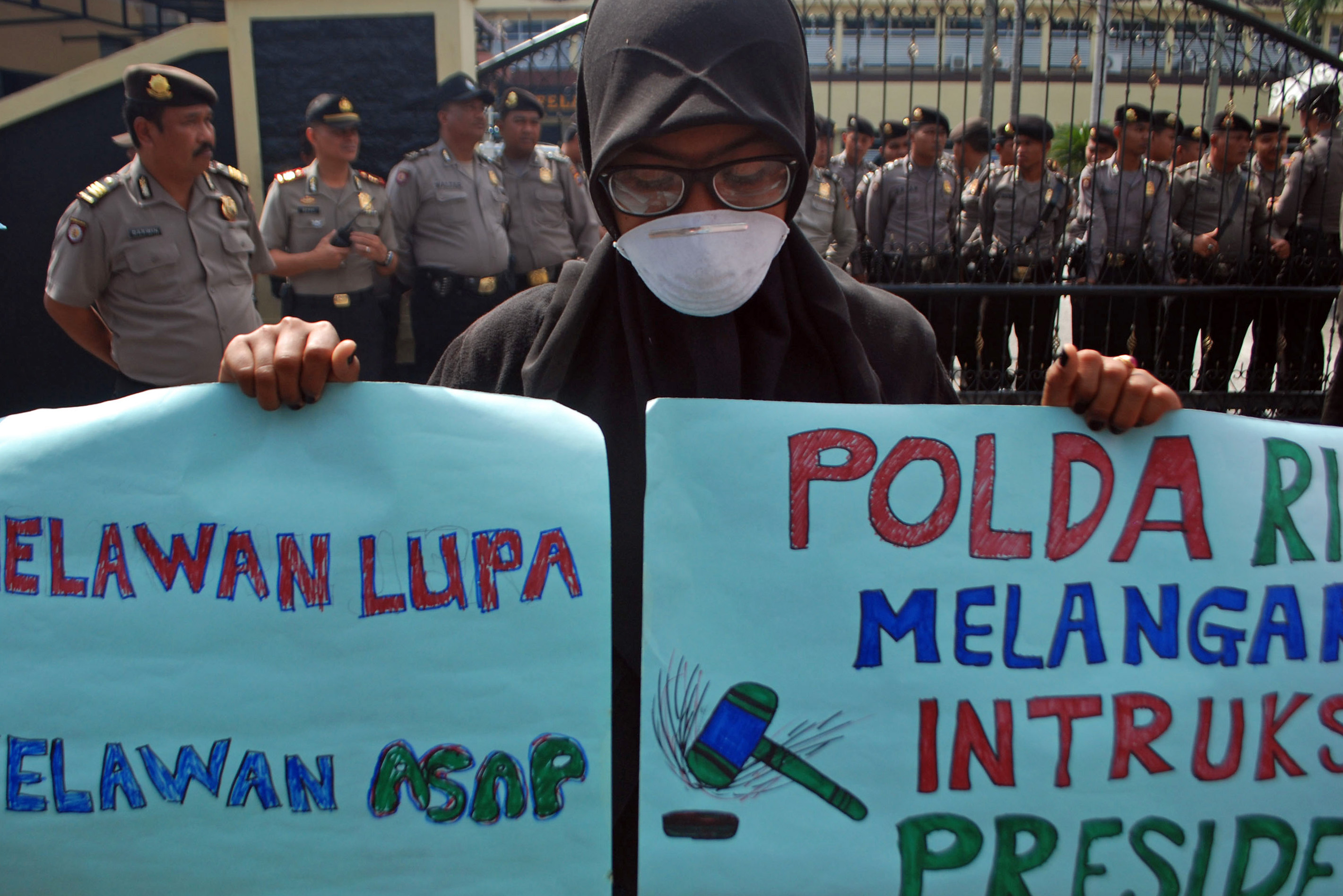 Anggota Satgas Rakyat Riau Tolak SP3 berunjuk rasa di depan Mapolda Riau di Pekanbaru, Riau, Senin (25/7). Dalam orasinya mereka menolak penerbitan Surat Perintah Penghentian Penyidikan (SP3) oleh Polda Riau terhadap 15 korporasi yang sebelumnya ditetapkan sebagai tersangka kasus kebakaran hutan dan lahan (Karhutla) tahun 2015. ANTARA FOTO/Rony Muharrman/foc/16.