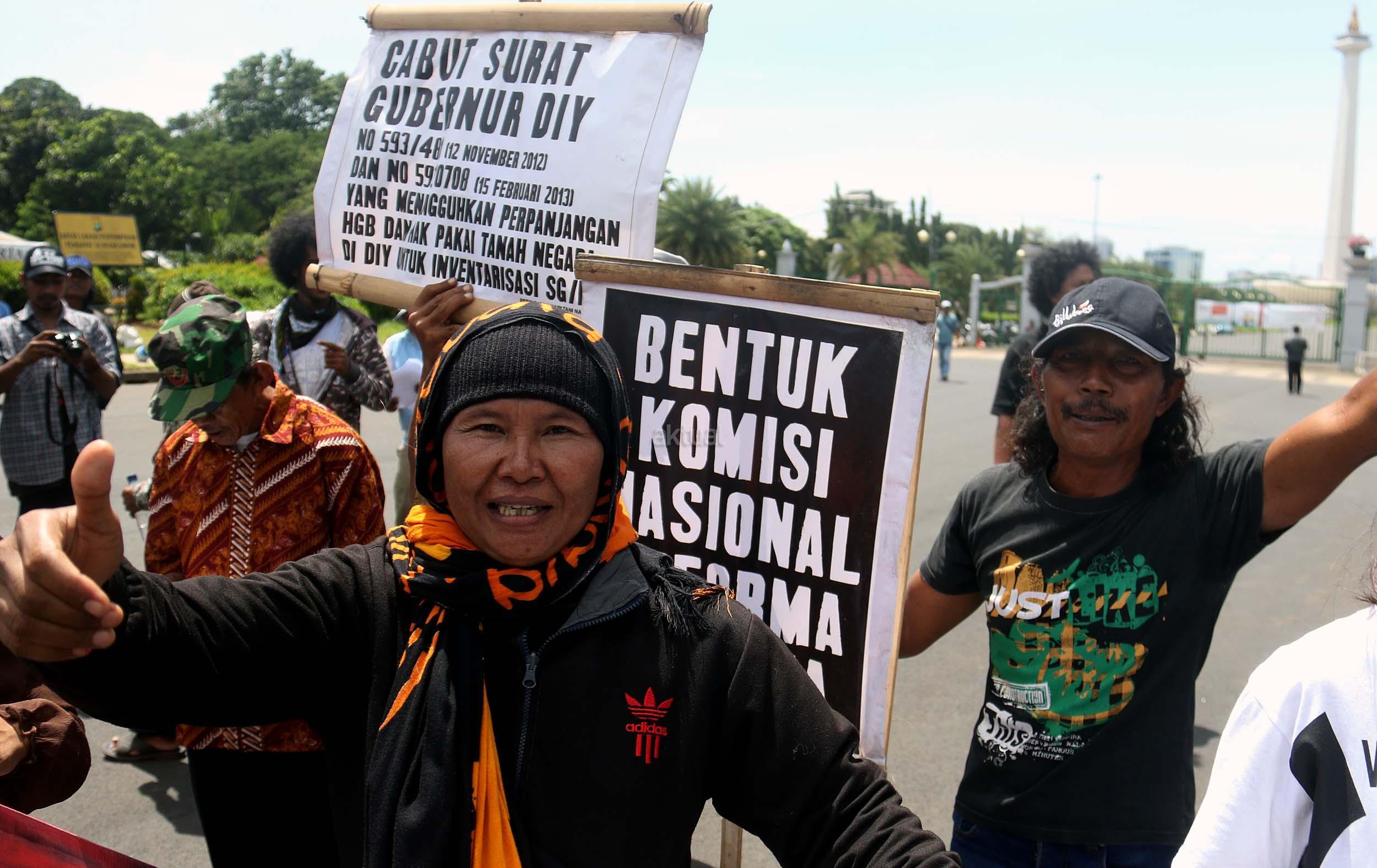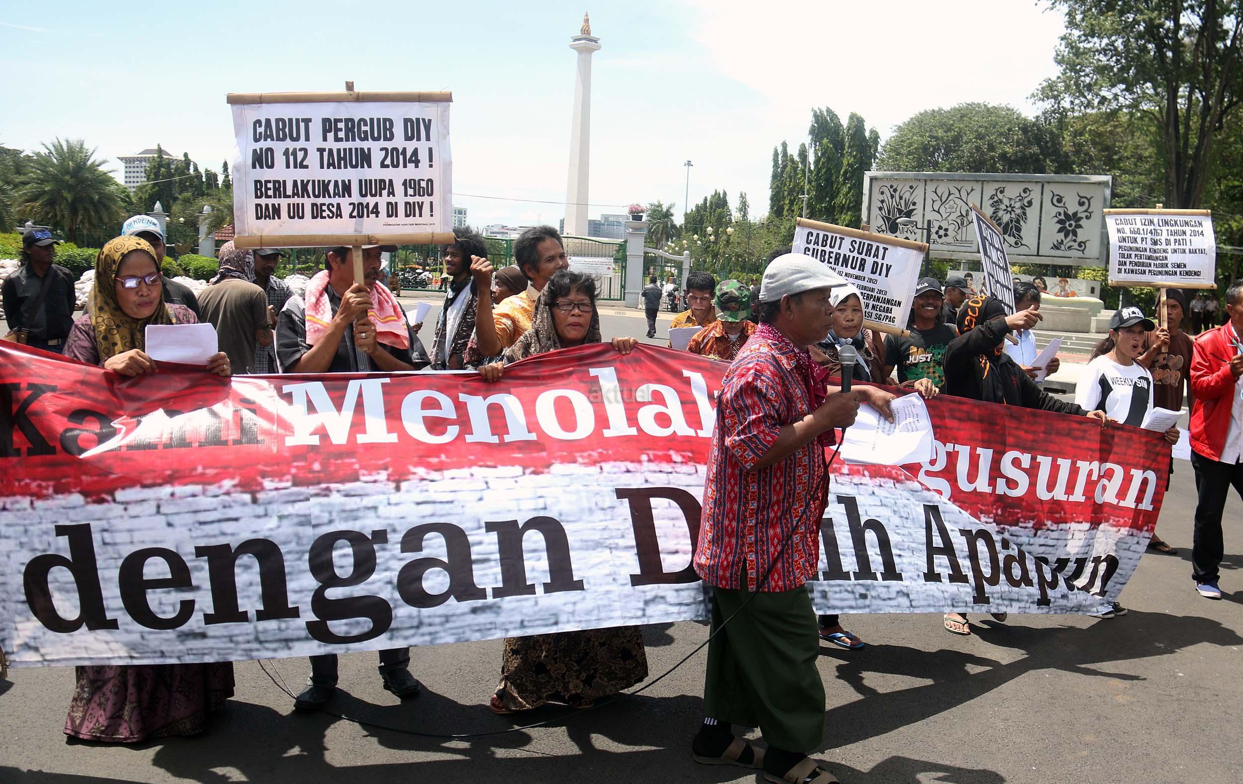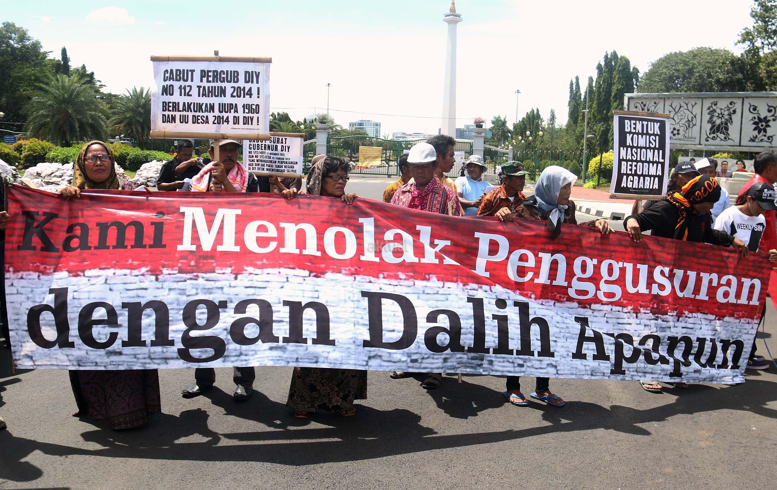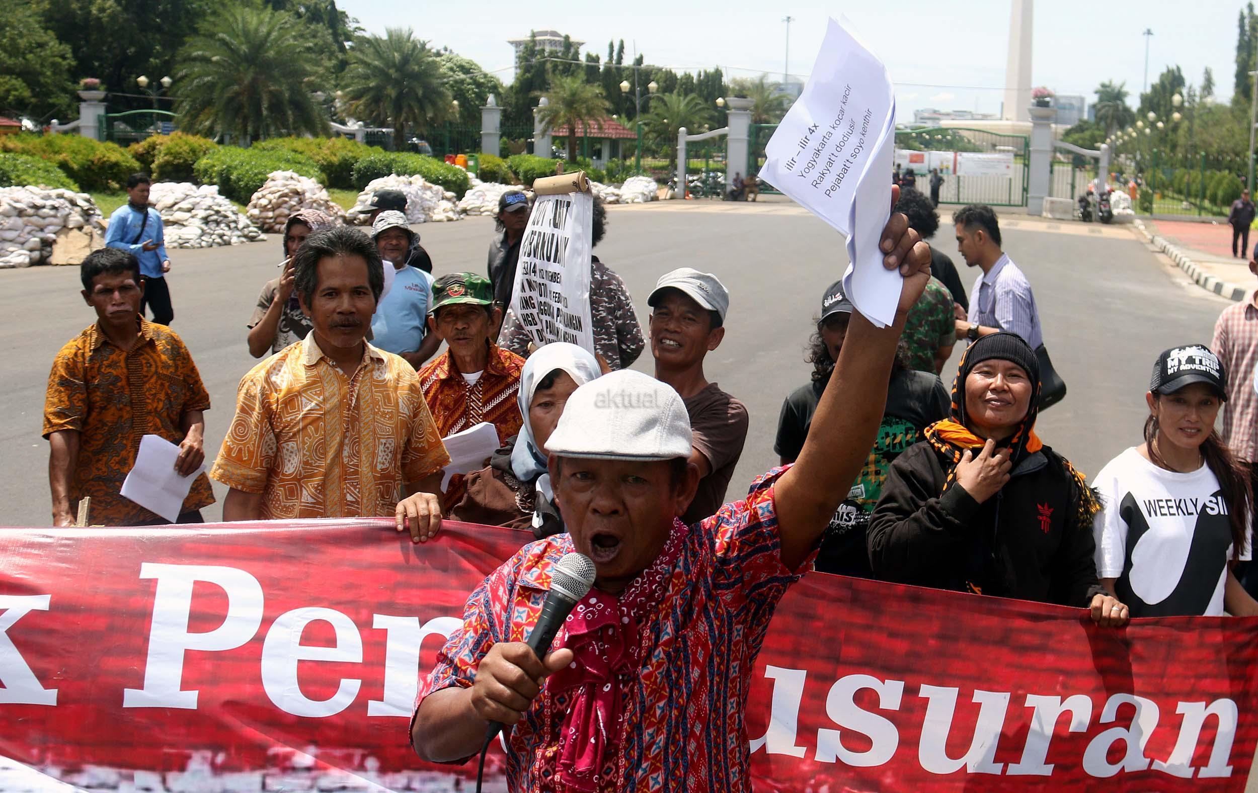 Puluhan warga yang tergabung dalam Komite Perjuangan Agraria Masyarakat Terdampak Yogyakarta (KOPRA) melakukan aksi di depan Istana Merdeka, Jakarta, Senin (26/9/2016). Dalam aksinya KOPRA menolak bentuk perampasan tanah rakyat dibawah legitimasi Undang-undang ke Istimewaan (UUK) dan laksanakan Reforma Agraria.