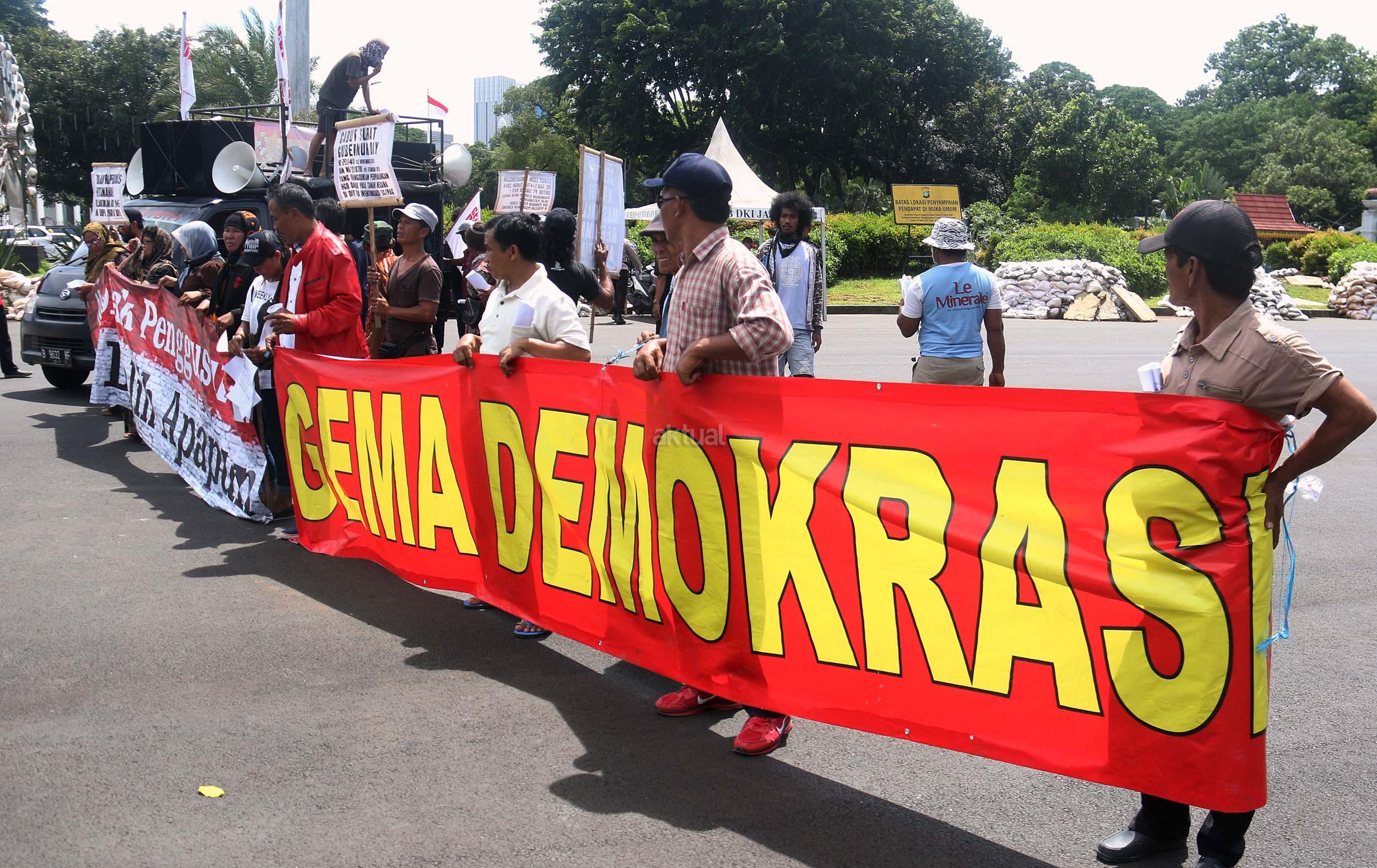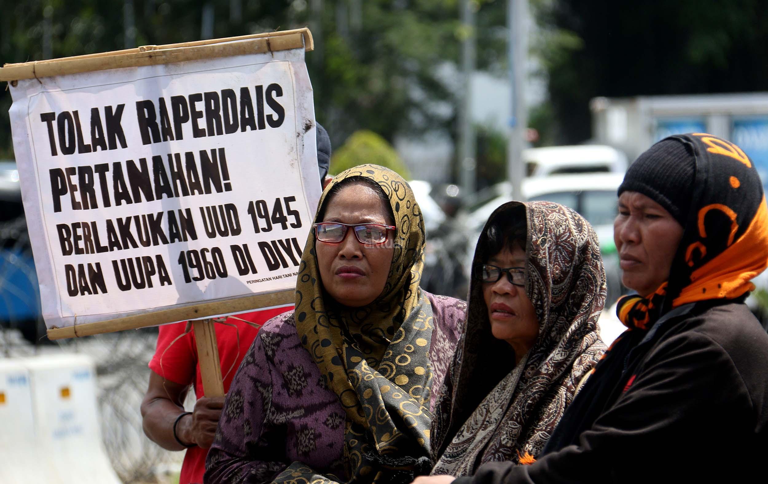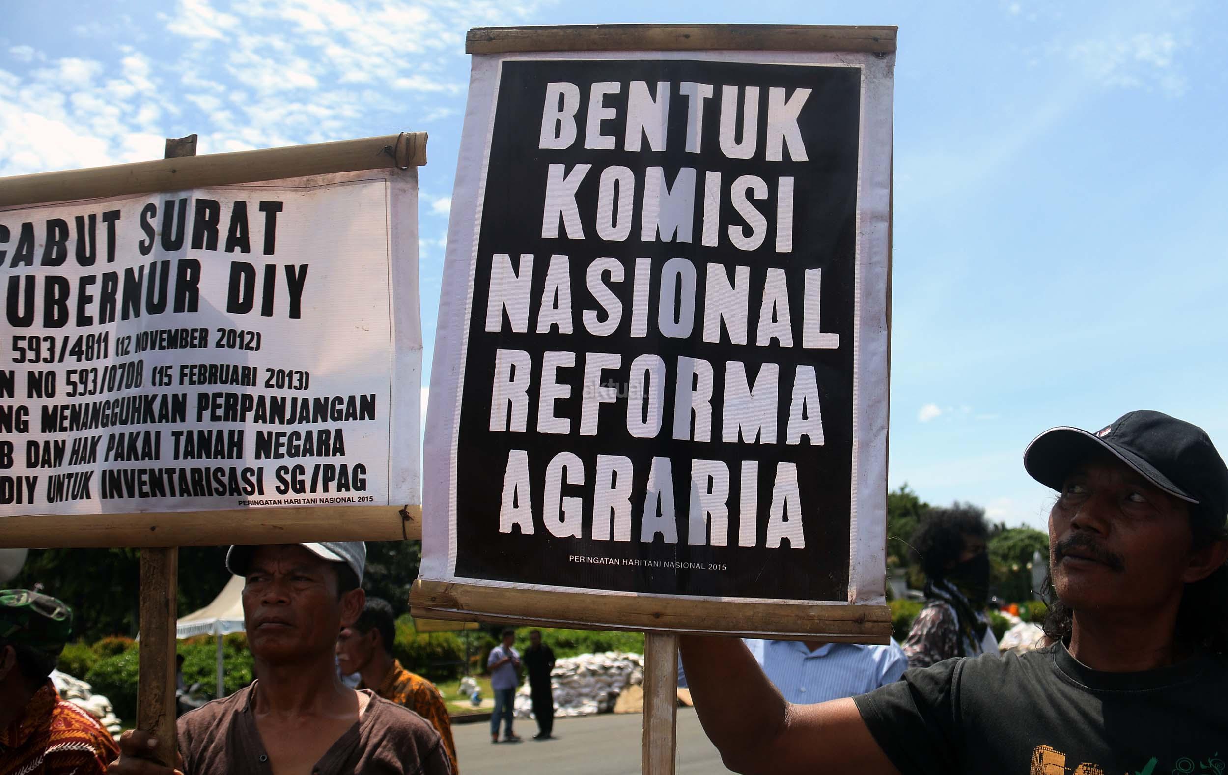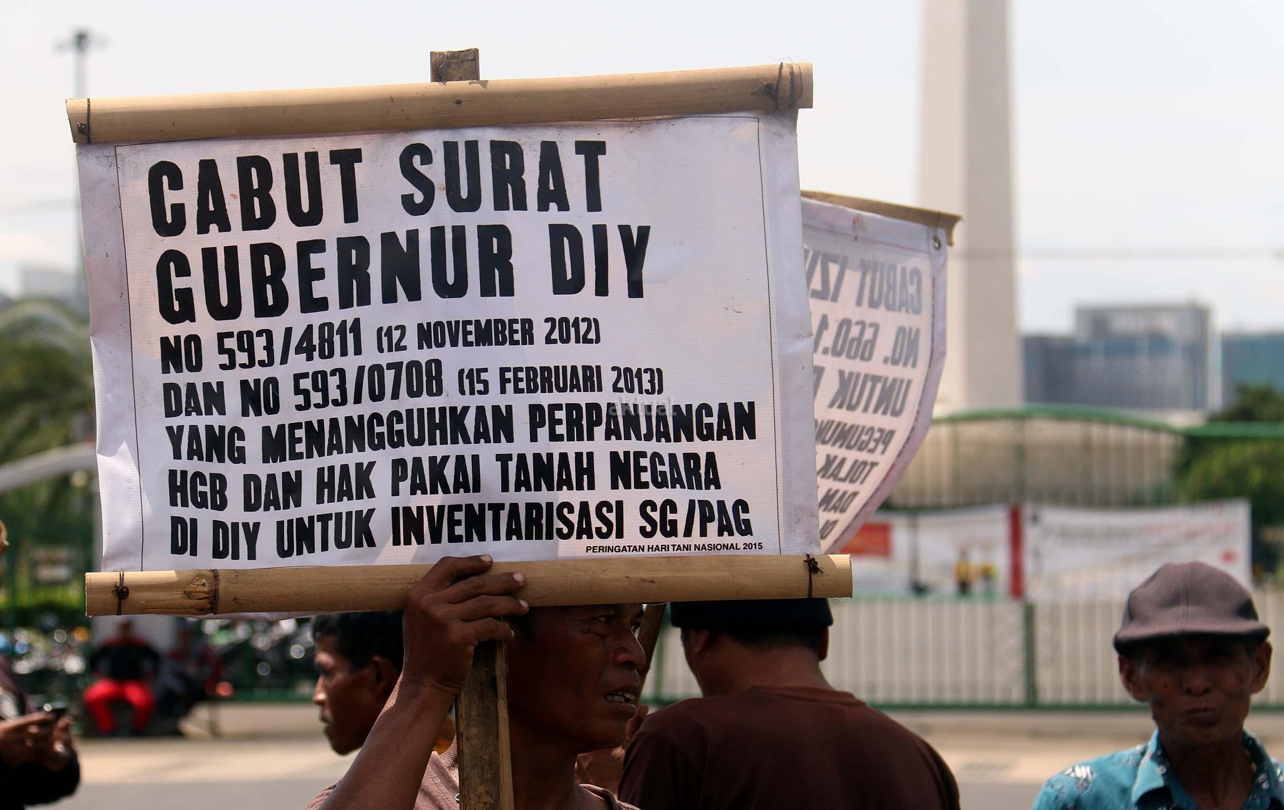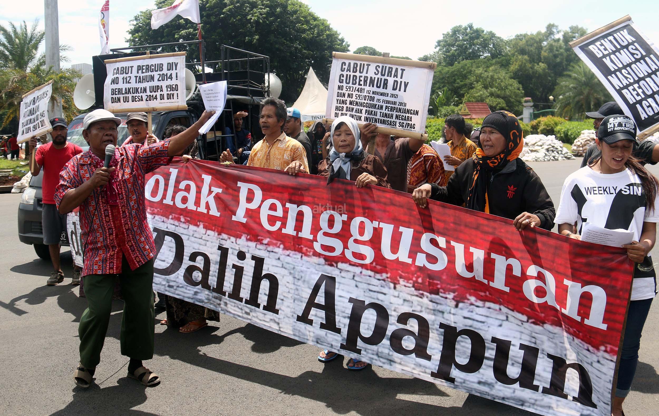 Puluhan warga yang tergabung dalam Komite Perjuangan Agraria Masyarakat Terdampak Yogyakarta (KOPRA) melakukan aksi di depan Istana Merdeka, Jakarta, Senin (26/9/2016). Dalam aksinya KOPRA menolak bentuk perampasan tanah rakyat dibawah legitimasi Undang-undang ke Istimewaan (UUK) dan laksanakan Reforma Agraria.
