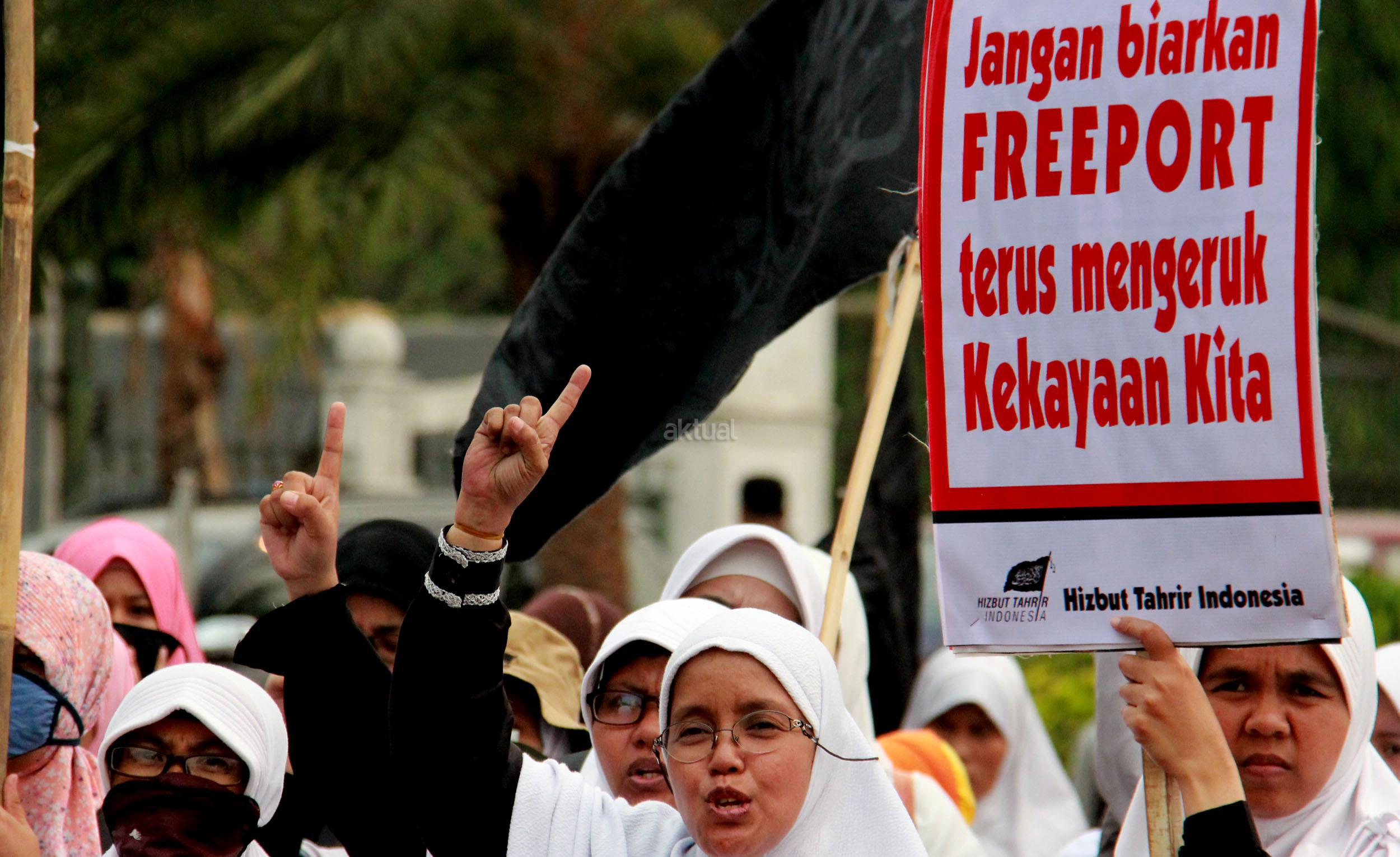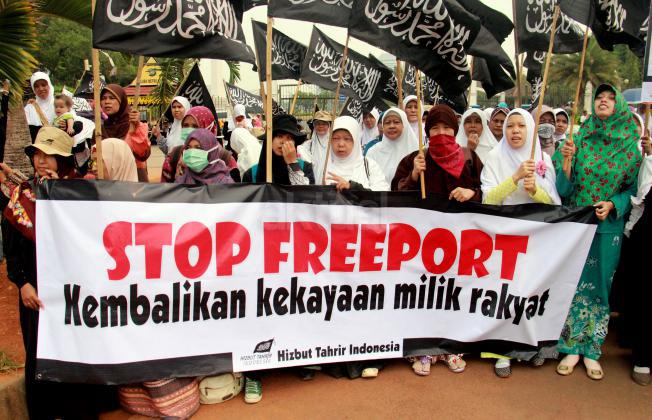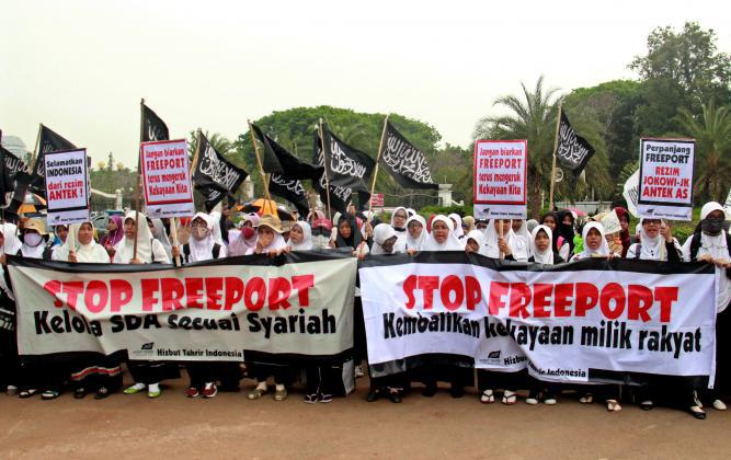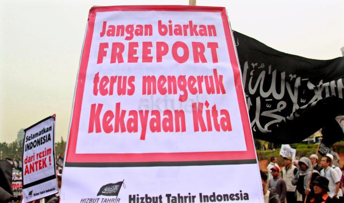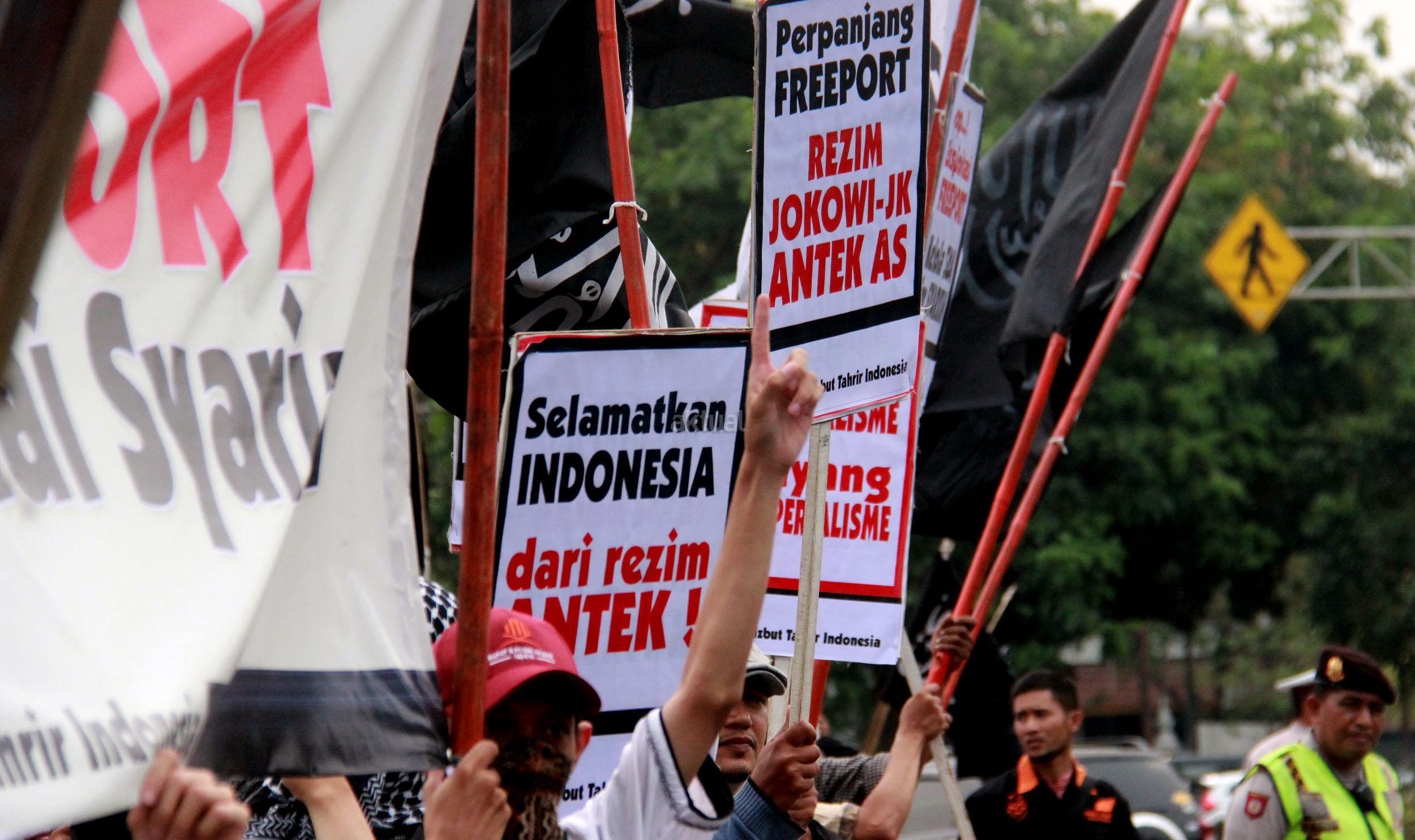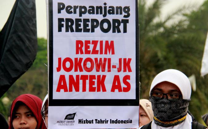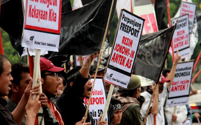 Dalam aksinya massa Hizbut Tahrir Indonesia menolak rencana perpanjangan kontrak karya (KK) PT Freeport Indonesia terkait dengan keberangkatan Presiden Joko Widodo (Jokowi) ke Amerika Serikat (AS).