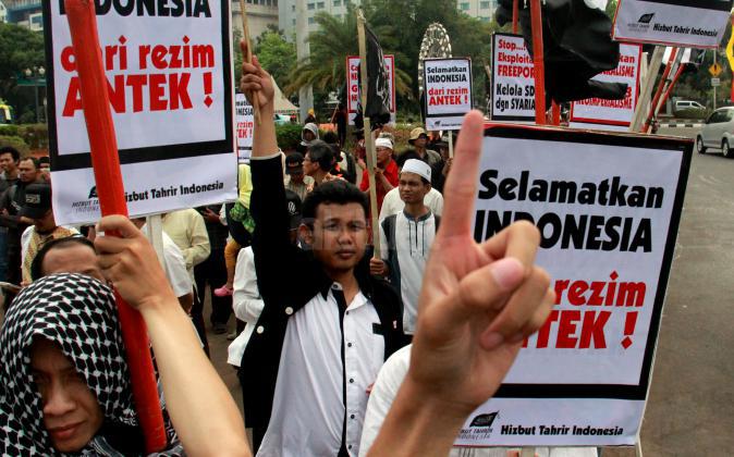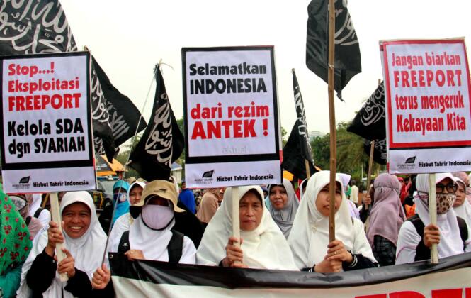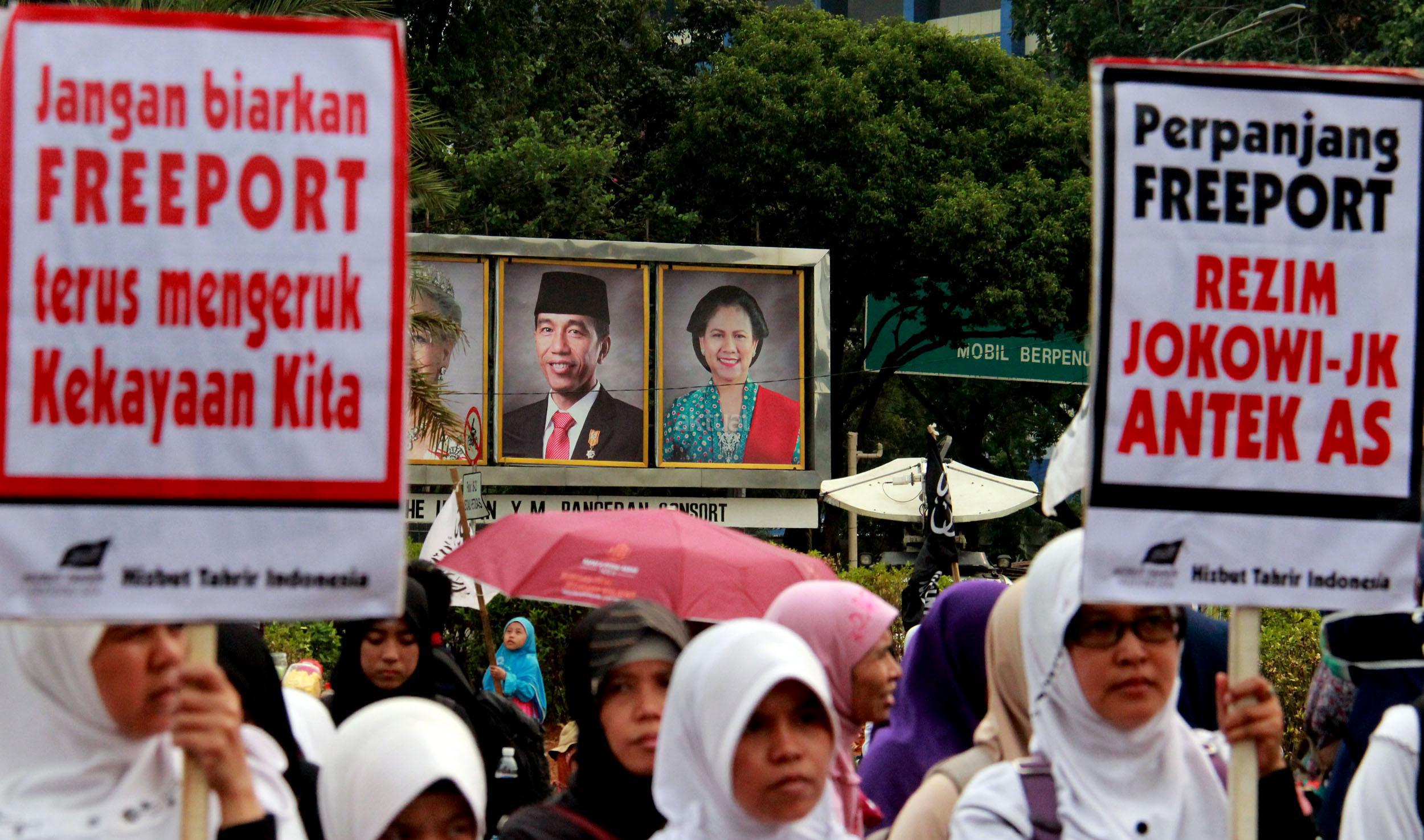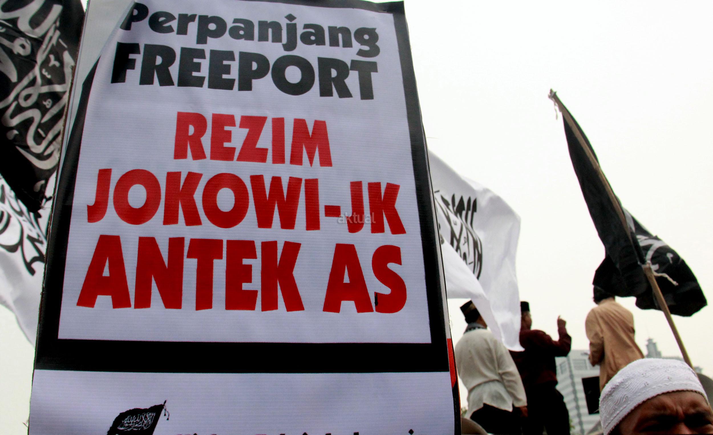 Dalam aksinya massa Hizbut Tahrir Indonesia menolak rencana perpanjangan kontrak karya (KK) PT Freeport Indonesia terkait dengan keberangkatan Presiden Joko Widodo (Jokowi) ke Amerika Serikat (AS).