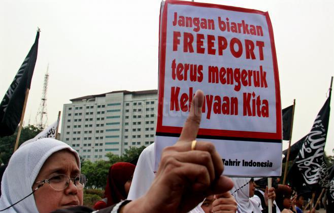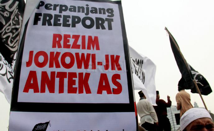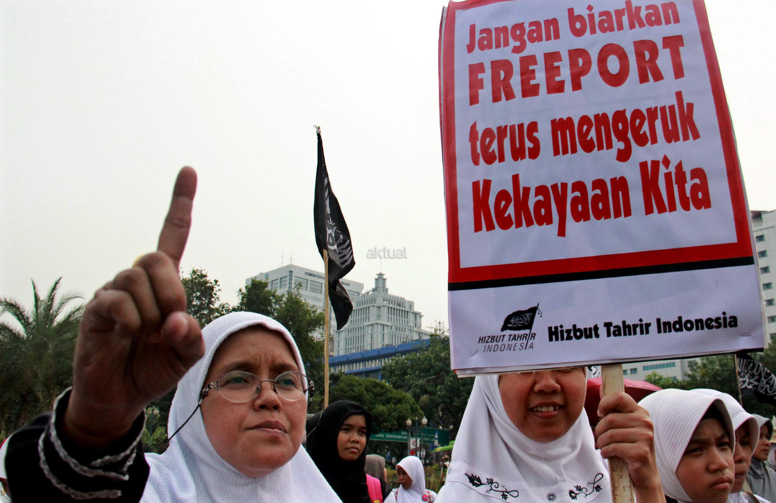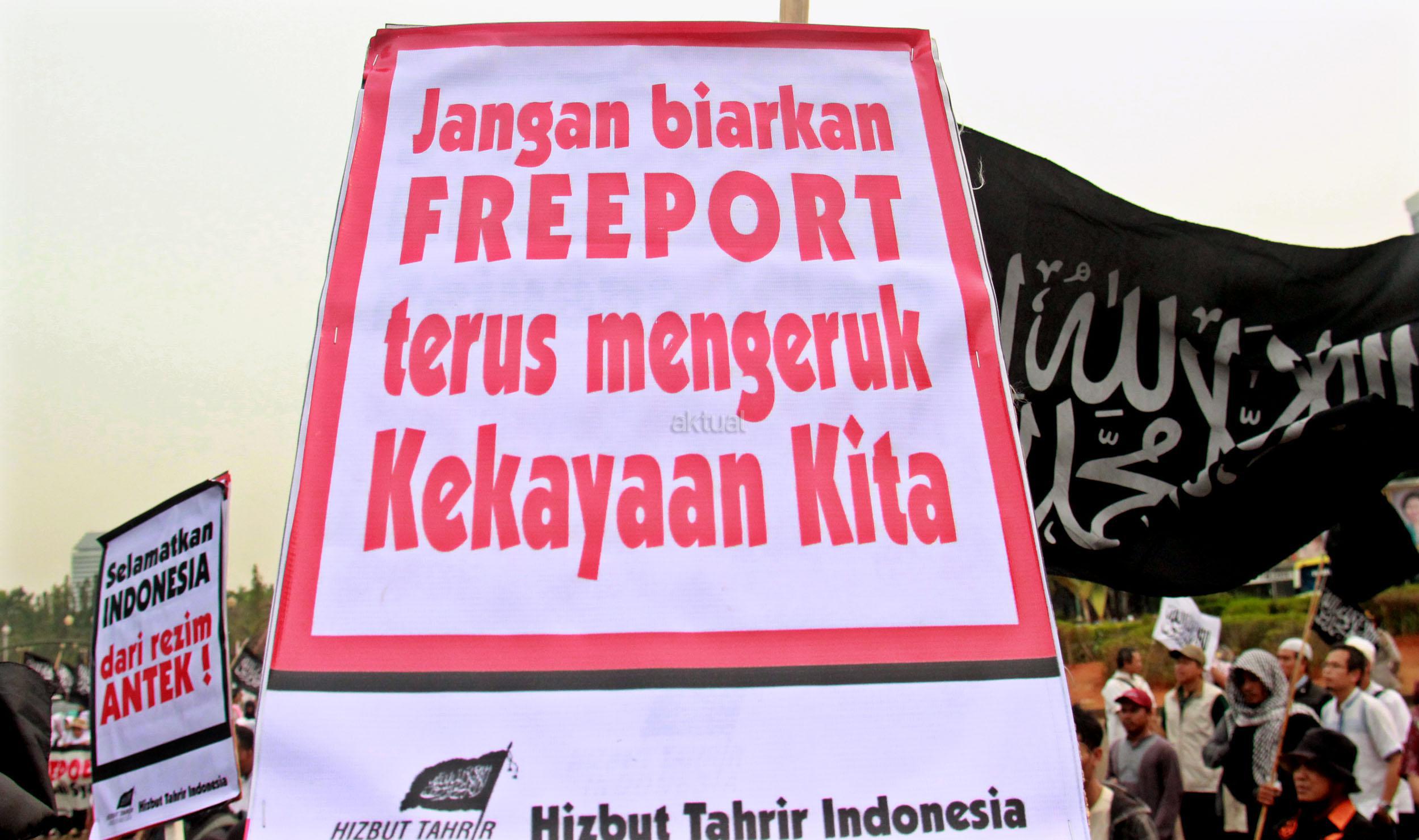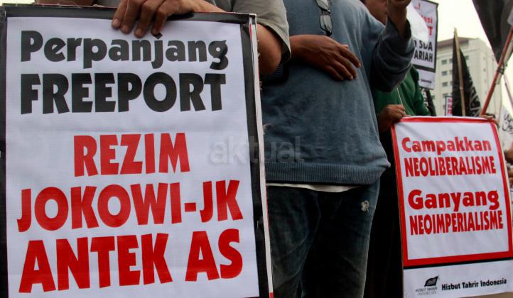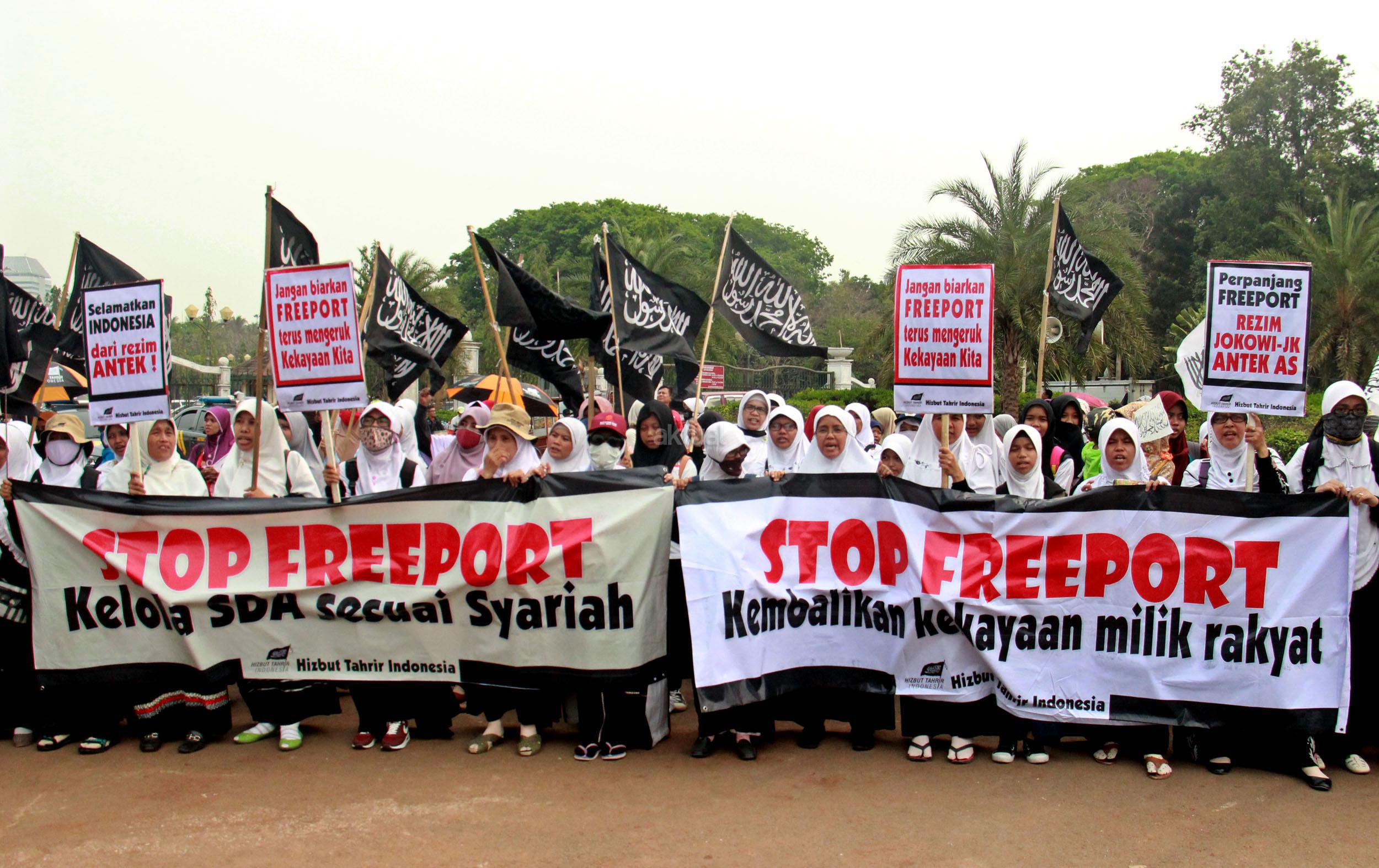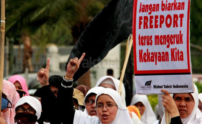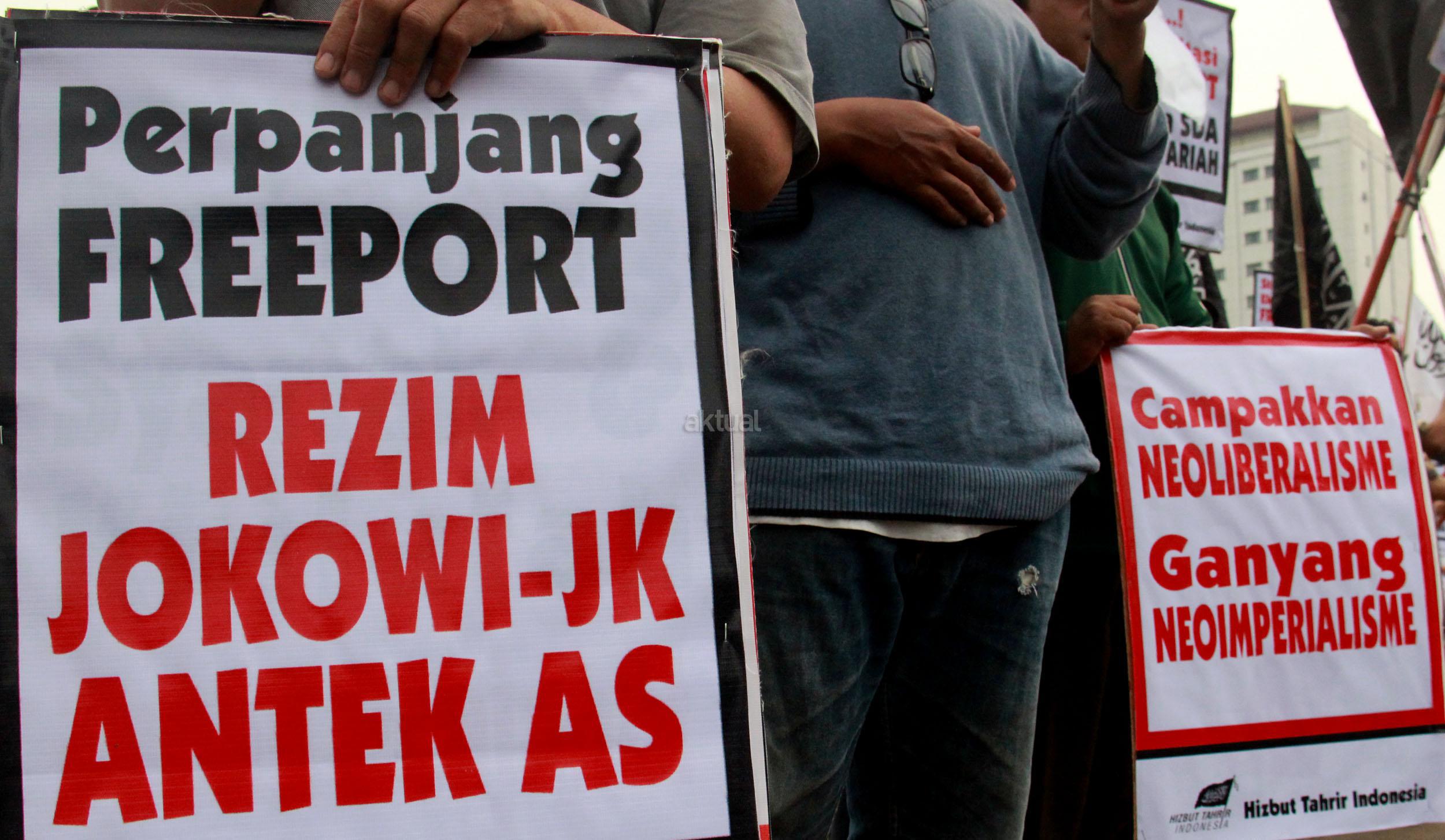 Dalam aksinya massa Hizbut Tahrir Indonesia menolak rencana perpanjangan kontrak karya (KK) PT Freeport Indonesia terkait dengan keberangkatan Presiden Joko Widodo (Jokowi) ke Amerika Serikat (AS).Dalam aksinya massa Hizbut Tahrir Indonesia menolak rencana perpanjangan kontrak karya (KK) PT Freeport Indonesia terkait dengan keberangkatan Presiden Joko Widodo (Jokowi) ke Amerika Serikat (AS).