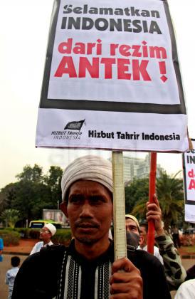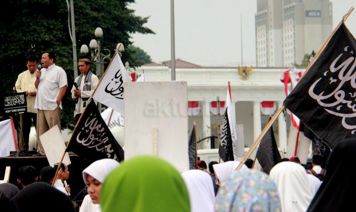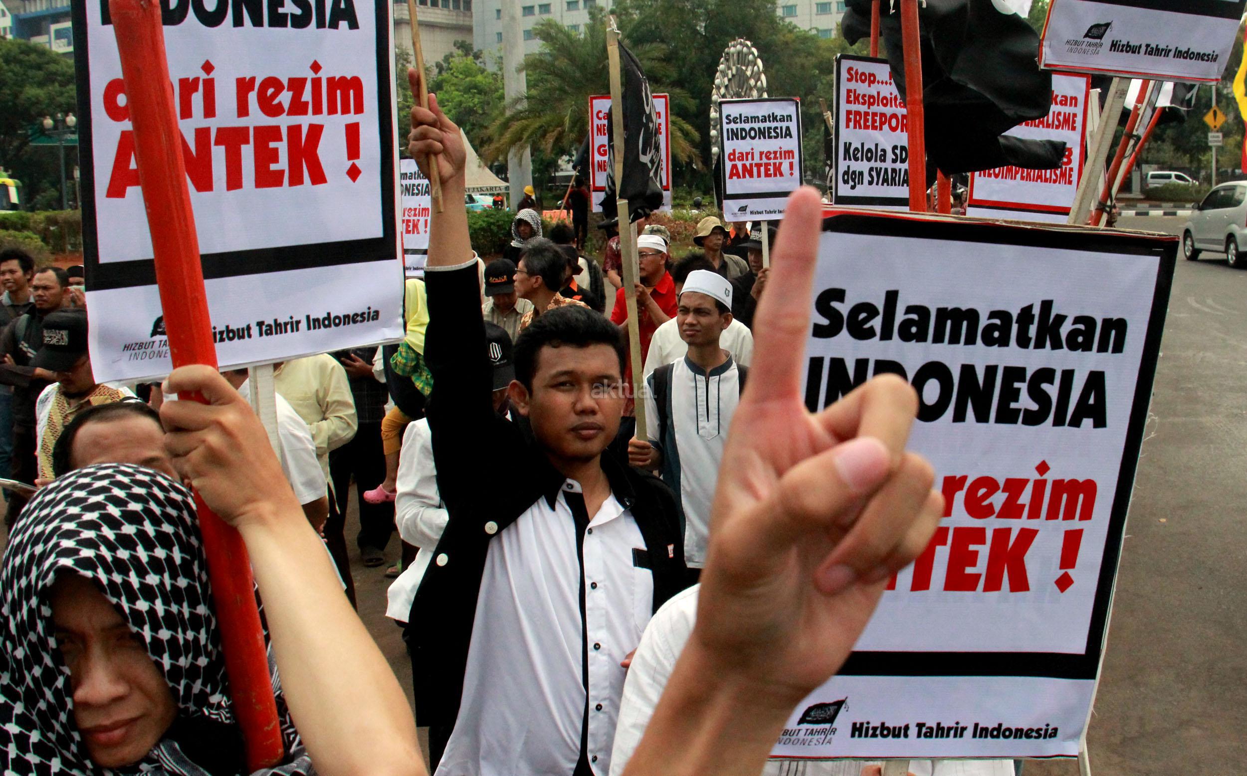 Ratusan massa Hizbut Tahrir Indonesia melakukan aksi didepan Istana Negara, Jakarat, Jumat (23/10/2015). Dalam aksinya massa Hizbut Tahrir Indonesia menolak rencana perpanjangan kontrak karya (KK) PT Freeport Indonesia terkait dengan keberangkatan Presiden Joko Widodo (Jokowi) ke Amerika Serikat (AS).