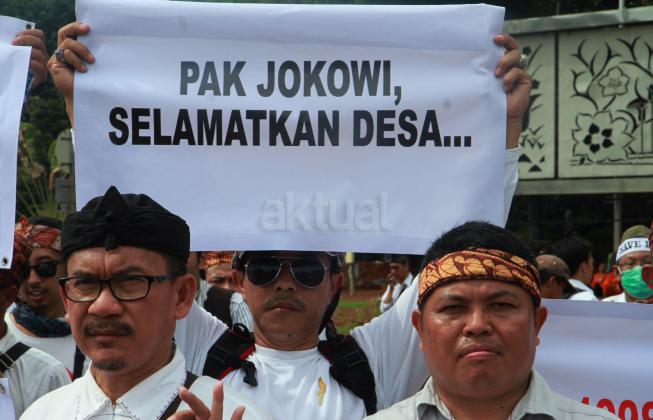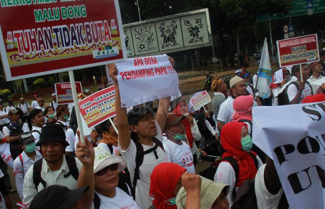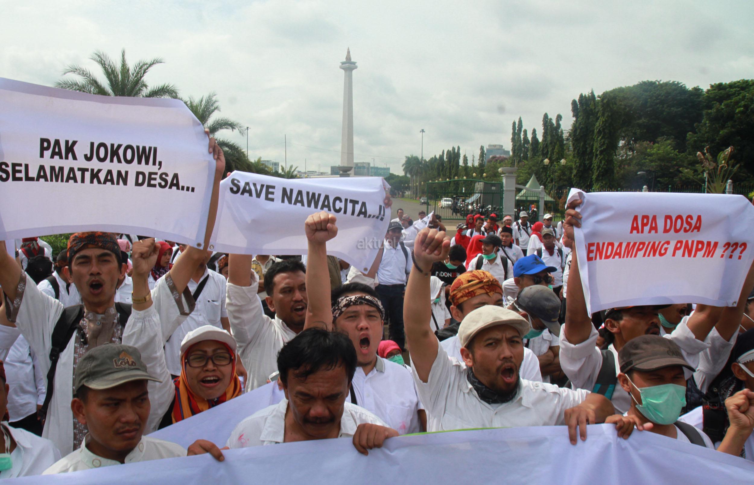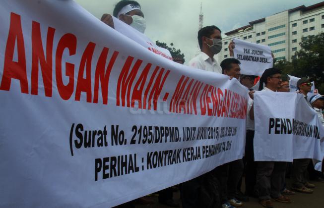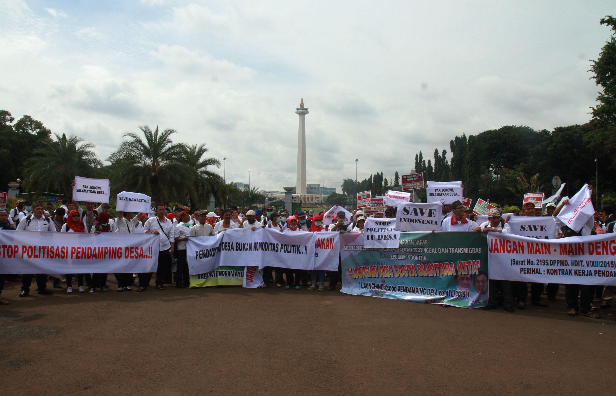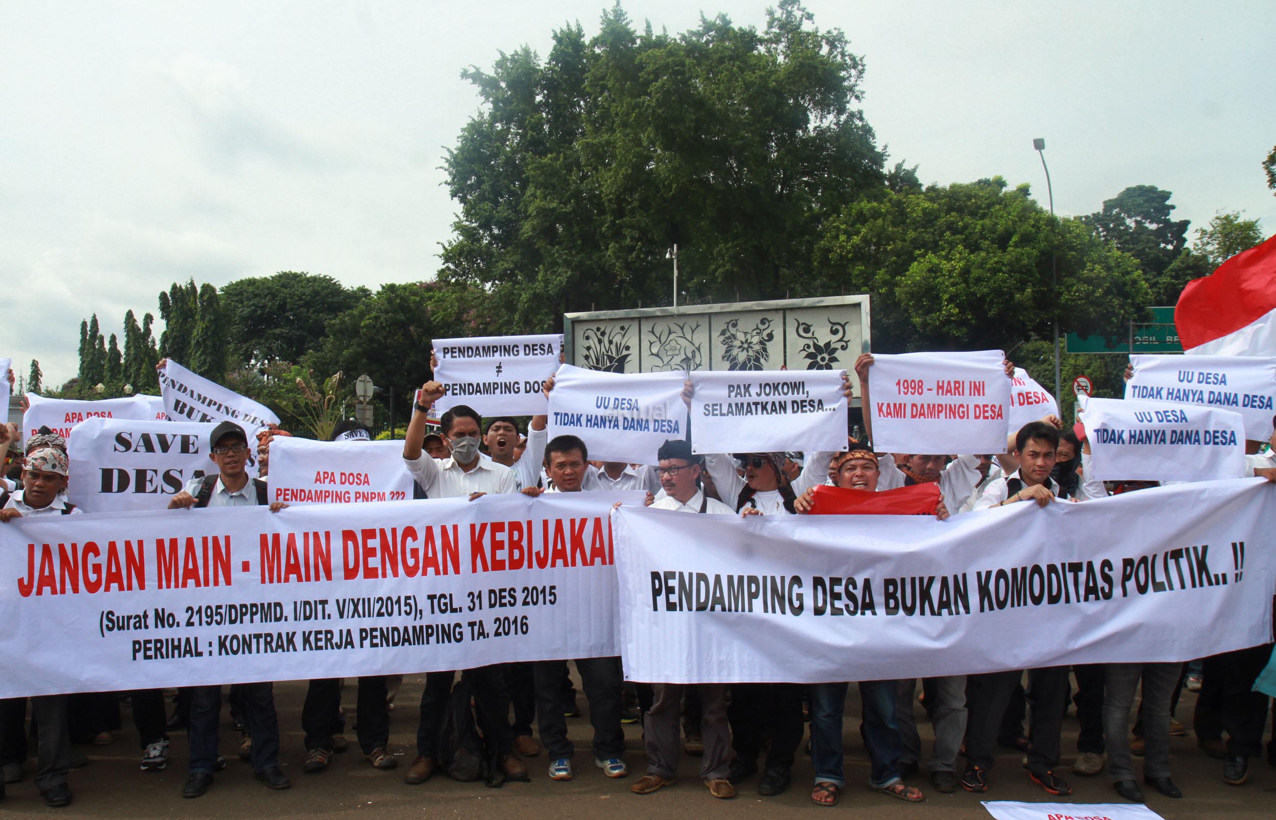 Ratusan massa yang tergabung dalam Aliansi Pendamping Dana Desa melakukan aksi di depan Istana, di Jakarta, Rabu (23/3/2016). Mereka mengkritik Kementerian Desa, Percepatan Daerah Tertinggal dan Transmigrasi (PDT) yang dianggap tidak transparan dalam melakukan rekrutmen petugas pendamping dana desa dan menuntut pemerintah agar rekrutmen pendamping dana desa tidak dipolitisasi.
