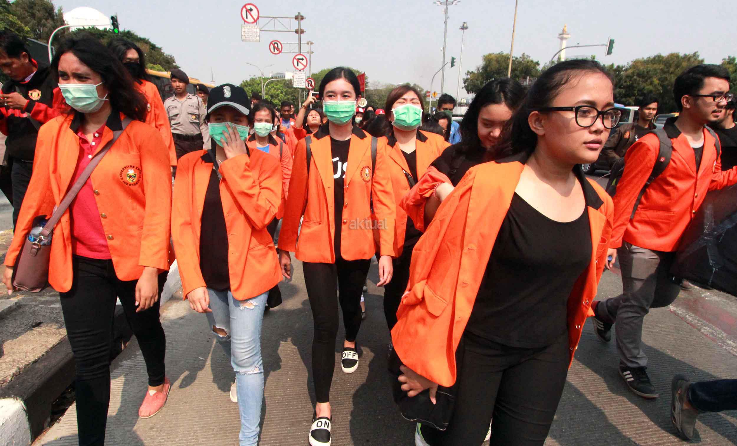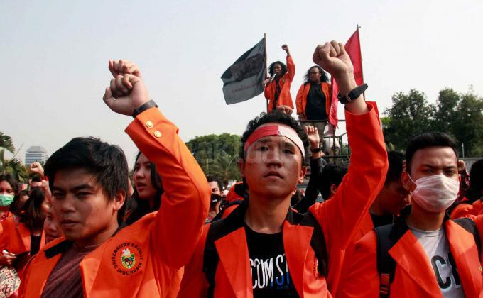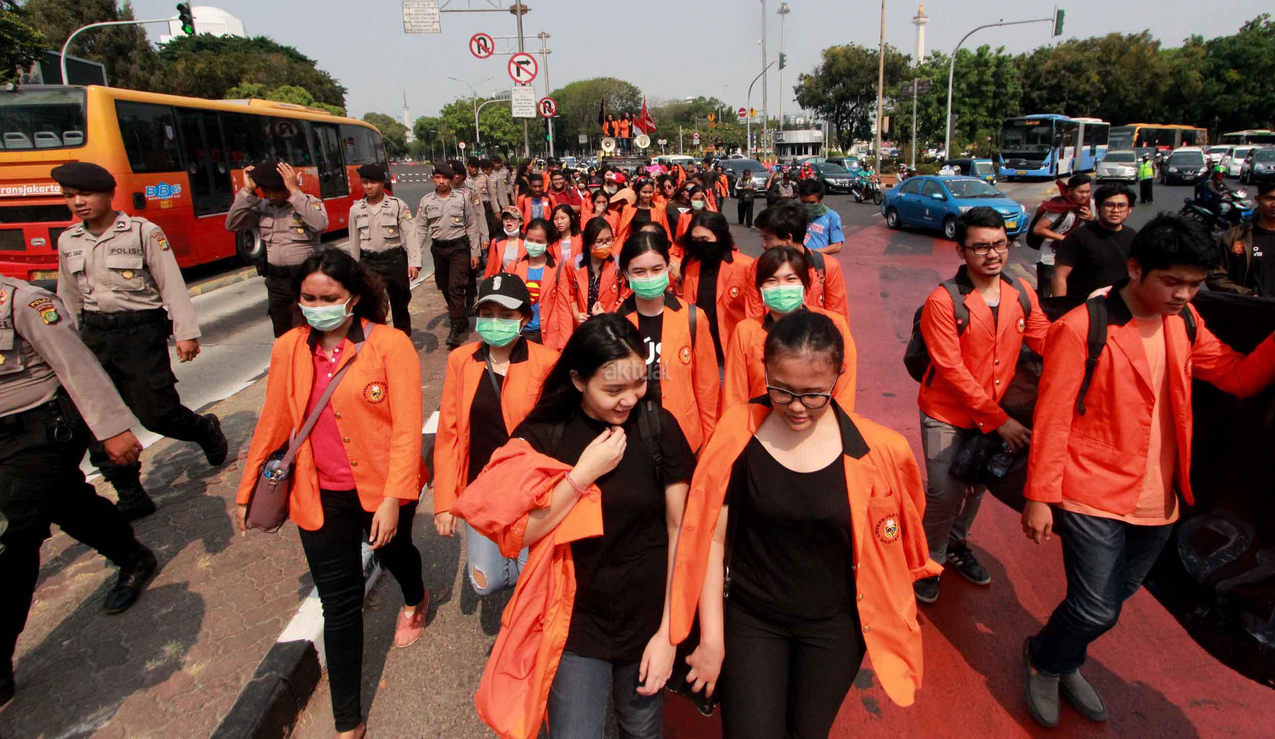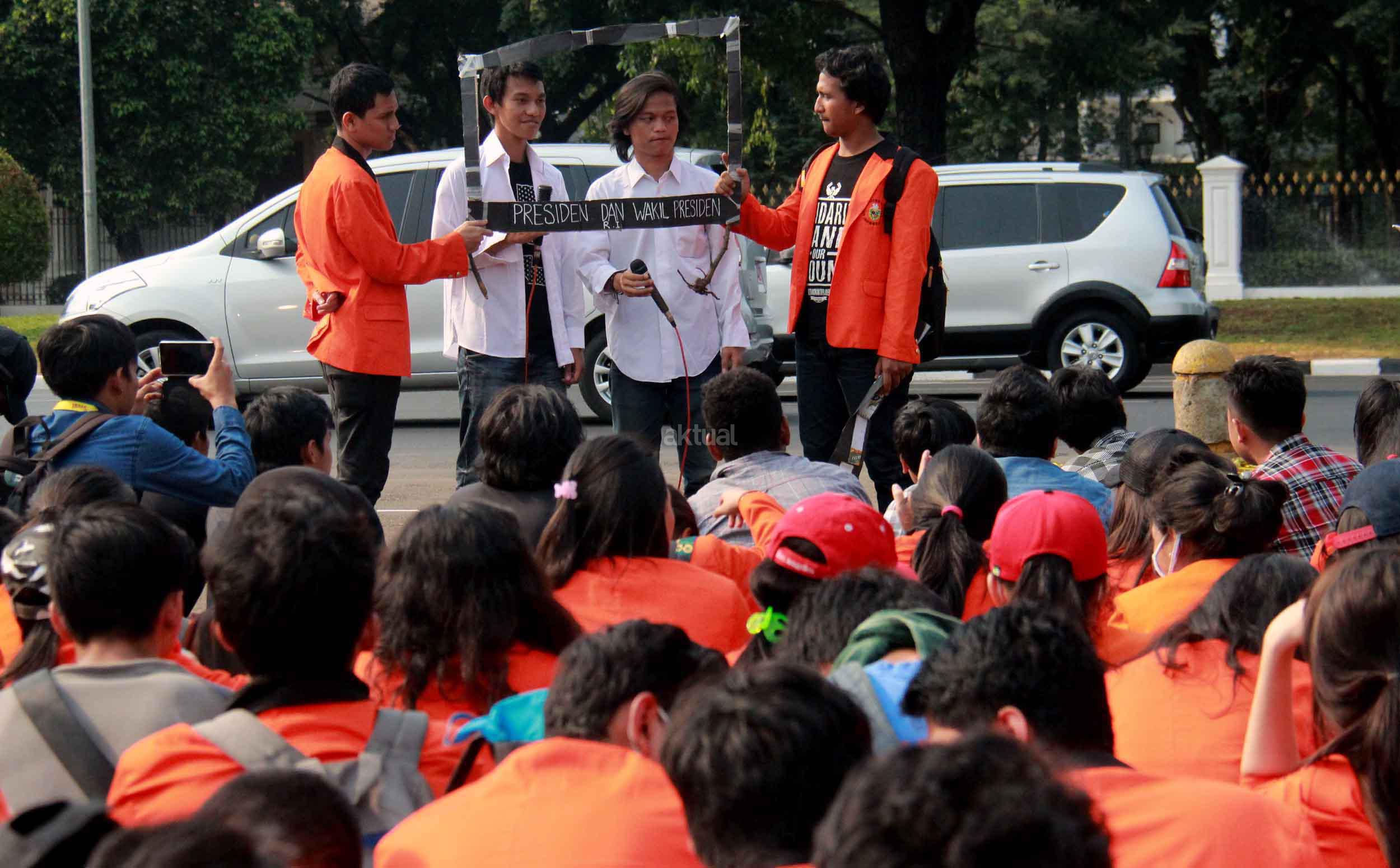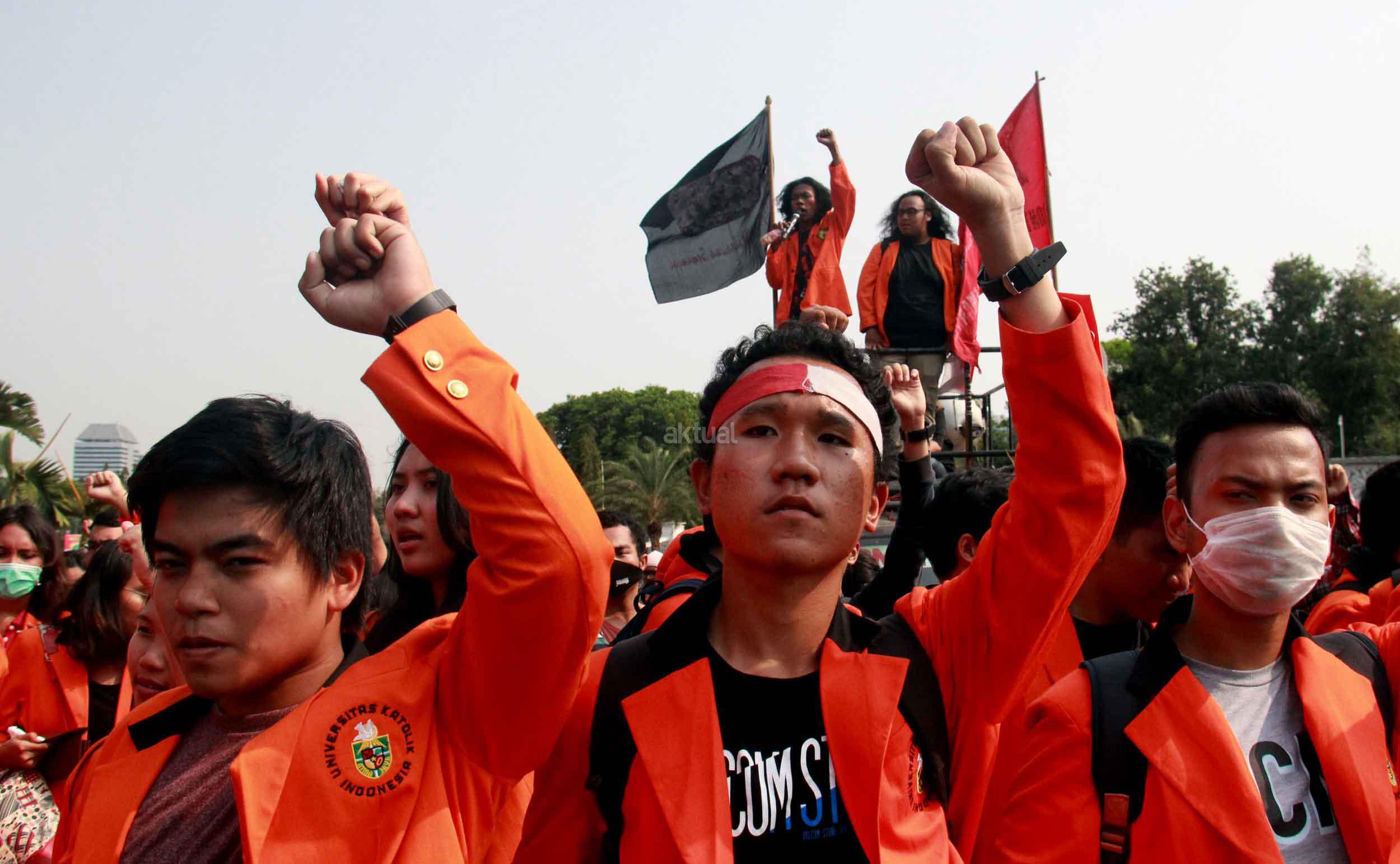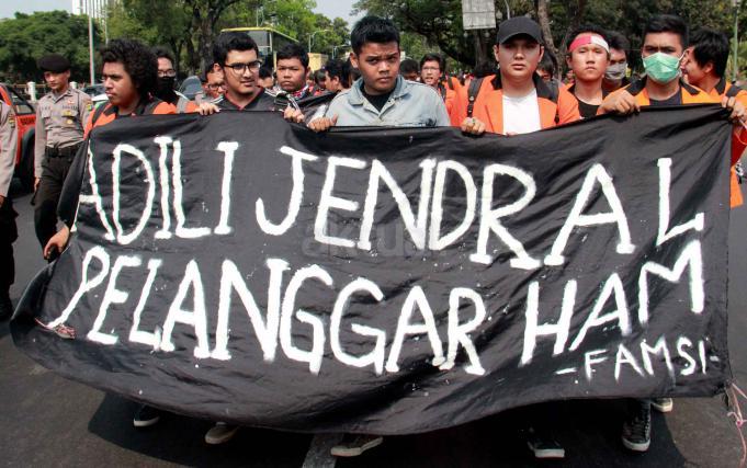 Ratusan mahasiswa Universitas Atma Jaya yang tergabung dalam Front Aksi Mahasiswa Indonesia (FAMSI) menggelar aksi unjuk rasa di depan Istana Merdeka, Jakarta, Jumat (25/9). Dalam aksinya mereka meminta Presiden Joko Widodo untuk segera mengambil langkah nyata dalam menuntaskan berbagai kasus pelanggaran HAM berat masa lalu.