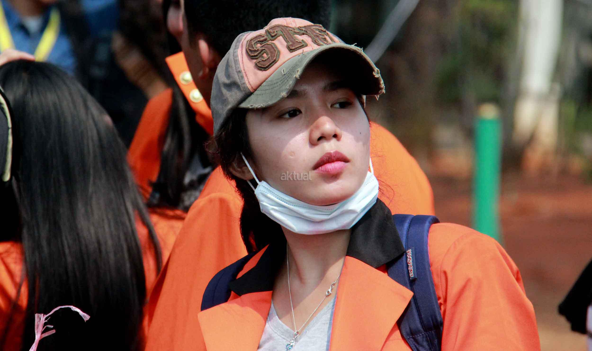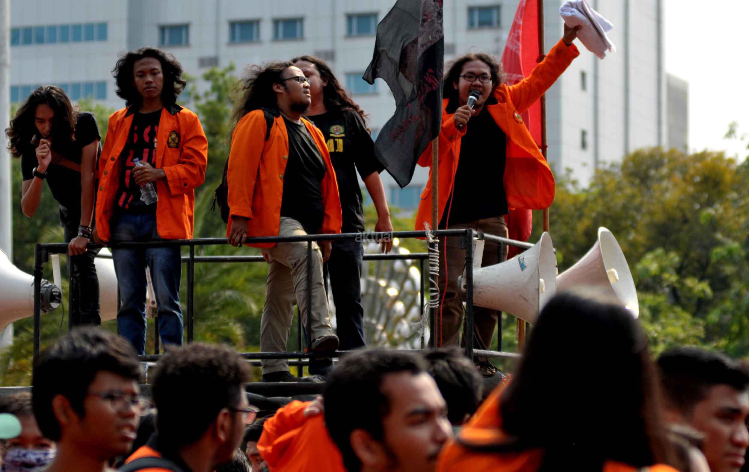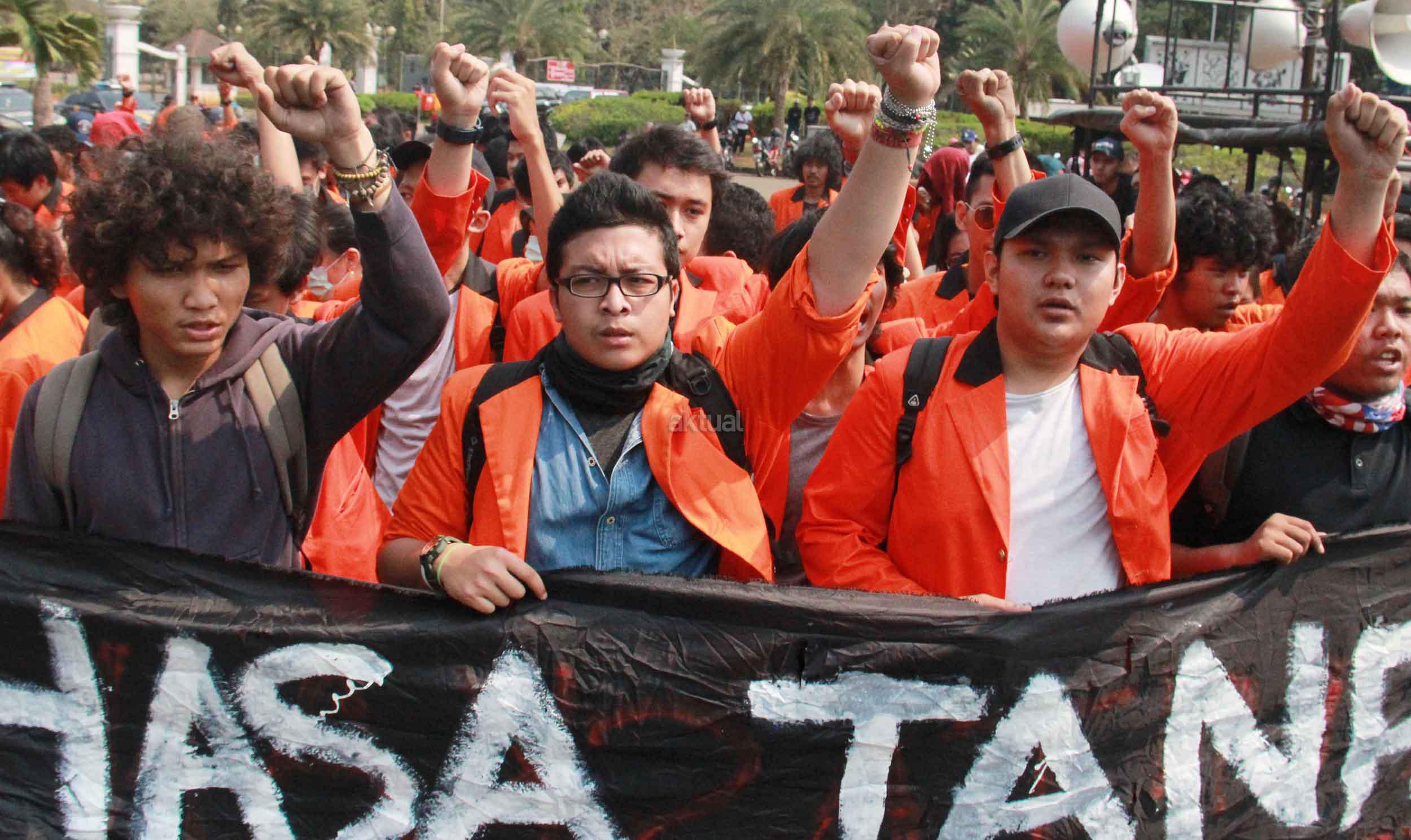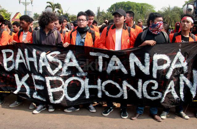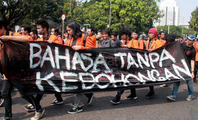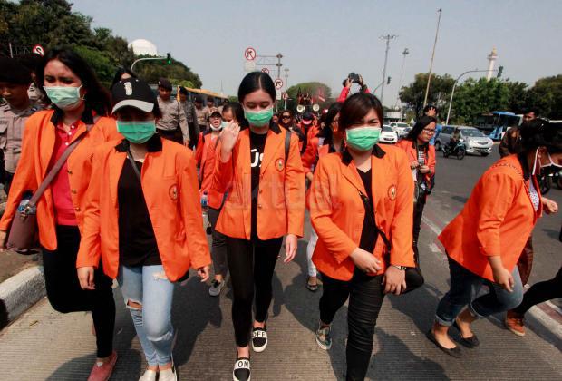 Ratusan mahasiswa Universitas Atma Jaya yang tergabung dalam Front Aksi Mahasiswa Indonesia (FAMSI) menggelar aksi unjuk rasa di depan Istana Merdeka, Jakarta, Jumat (25/9). Dalam aksinya mereka meminta Presiden Joko Widodo untuk segera mengambil langkah nyata dalam menuntaskan berbagai kasus pelanggaran HAM berat masa lalu.