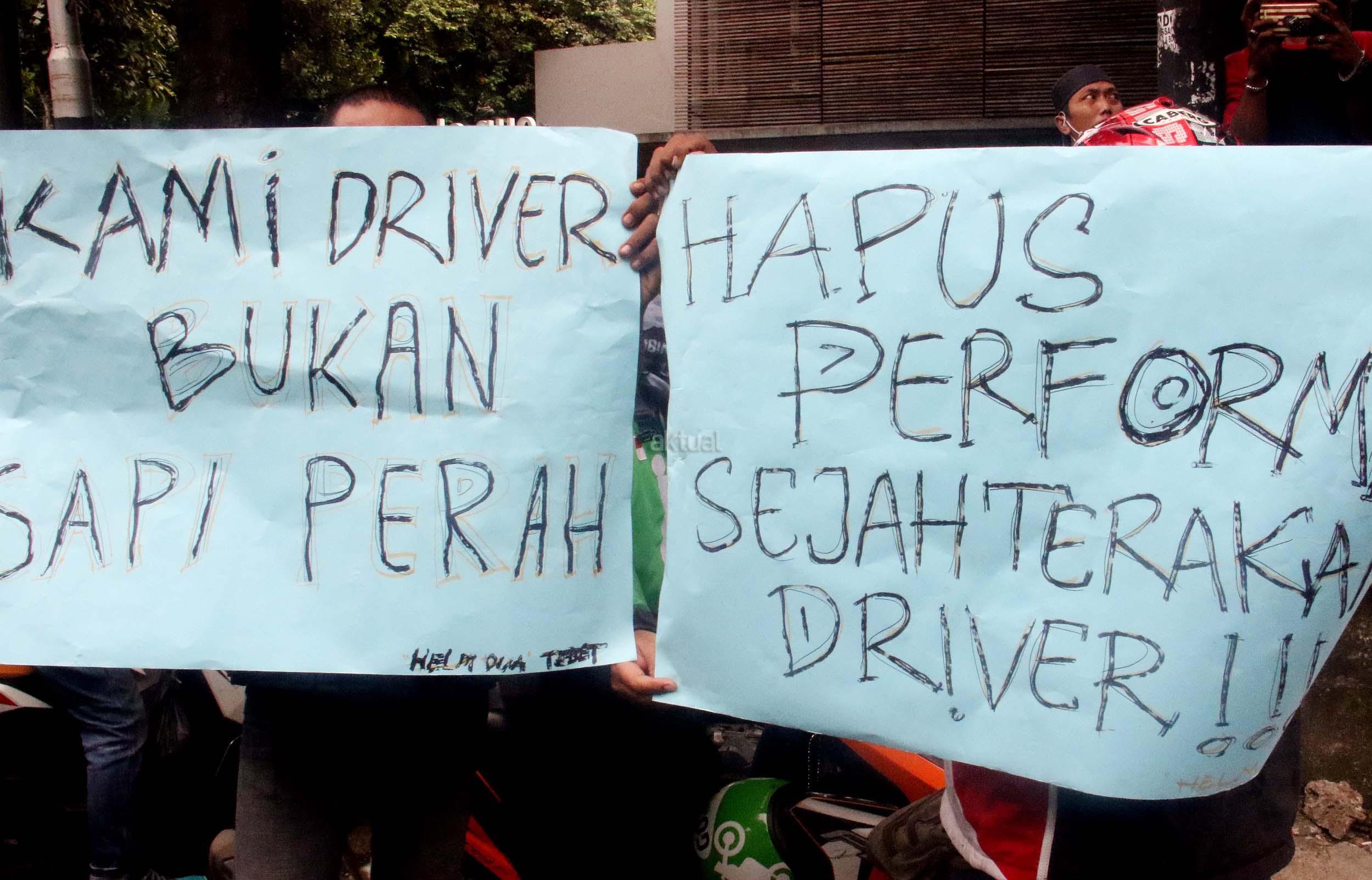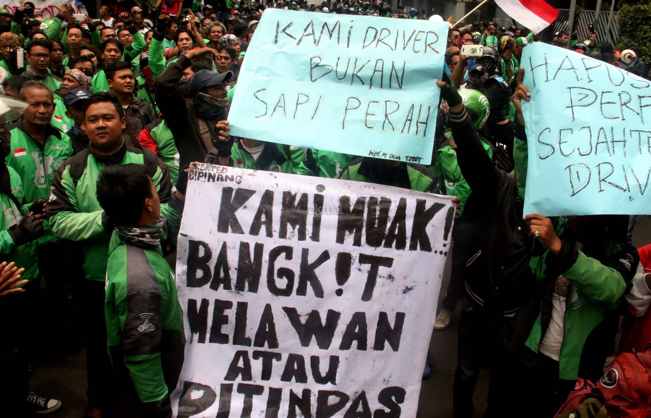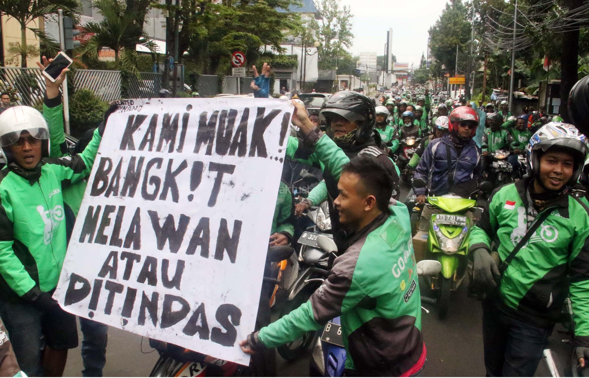 Ribuan driver Gojek melakukan aksi unjuk rasa di depan kantor PT Gojek Indonesia, Jakarta, Senin (3/10/2016). Dalam aksinya ribuan drevir Gojek mendesak untuk dihapuskan sistem performa (rating) karena menyusahkan para driver Gojek.