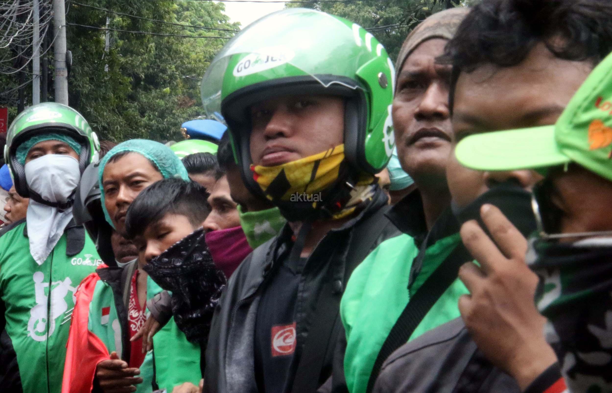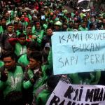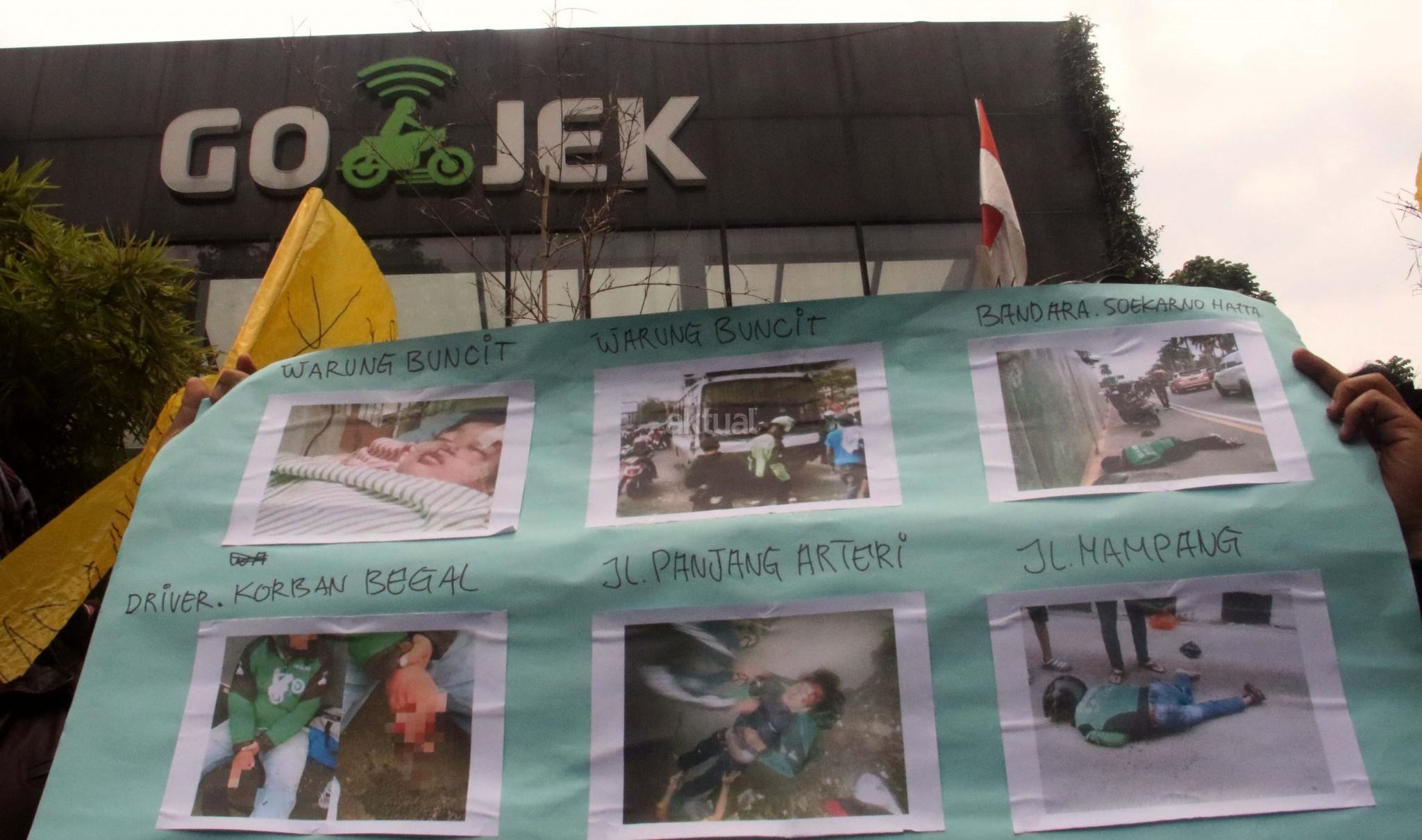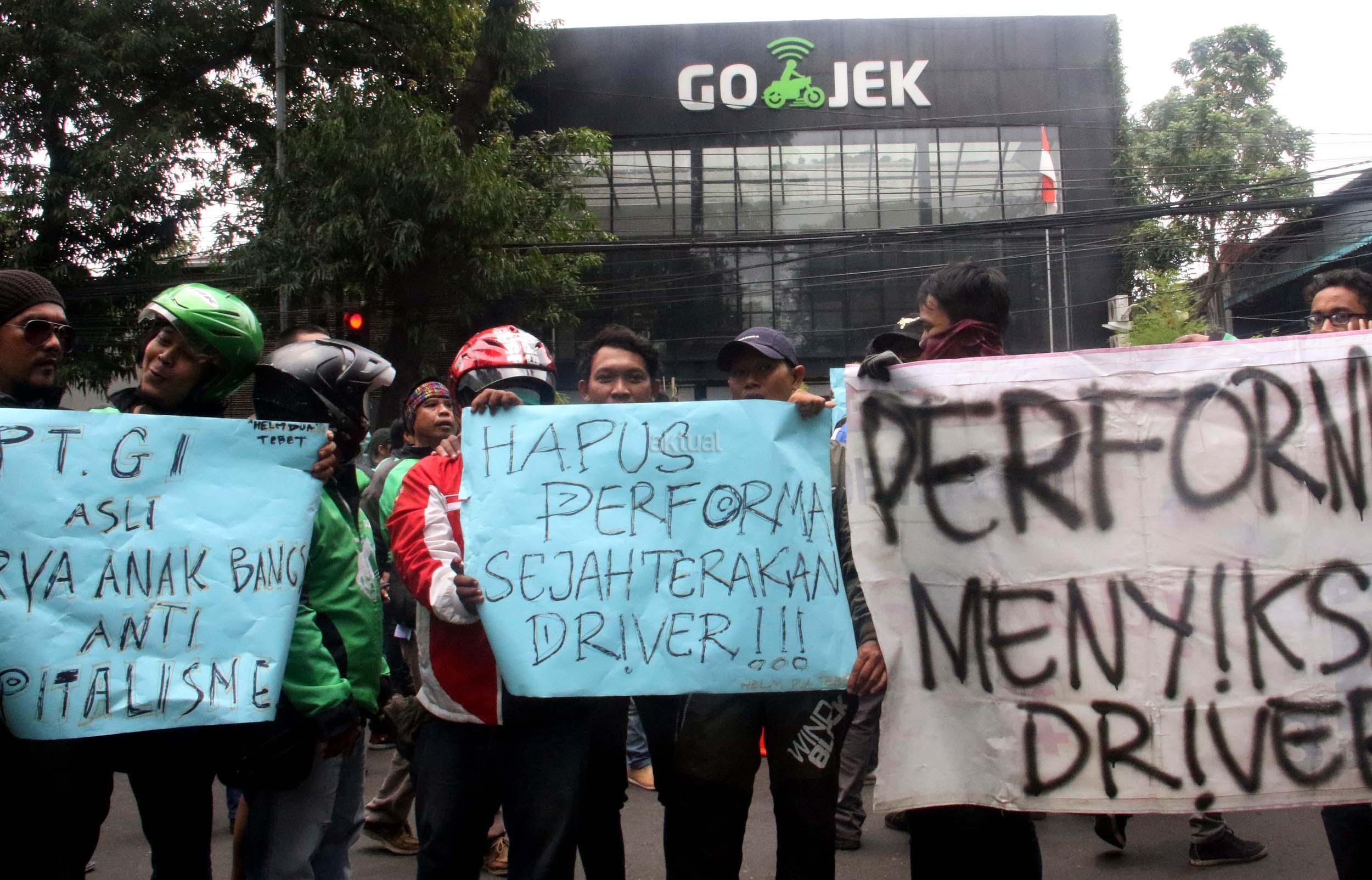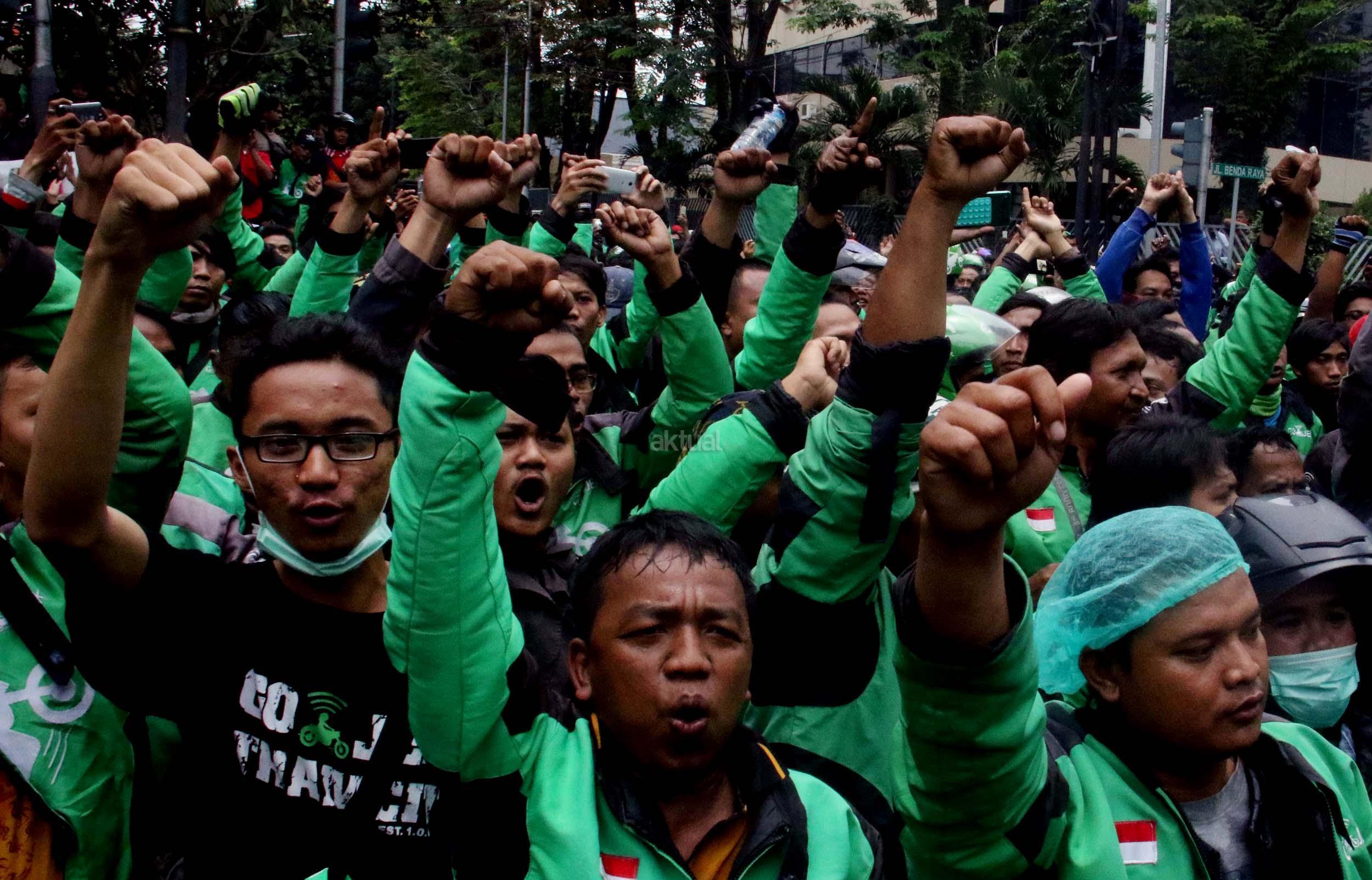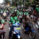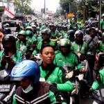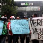Ribuan driver Gojek melakukan aksi unjuk rasa di depan kantor PT Gojek Indonesia, Jakarta, Senin (3/10/2016). Dalam aksinya ribuan drevir Gojek mendesak untuk dihapuskan sistem performa (rating) karena menyusahkan para driver Gojek. Aktual/Munzir