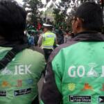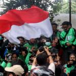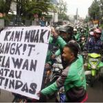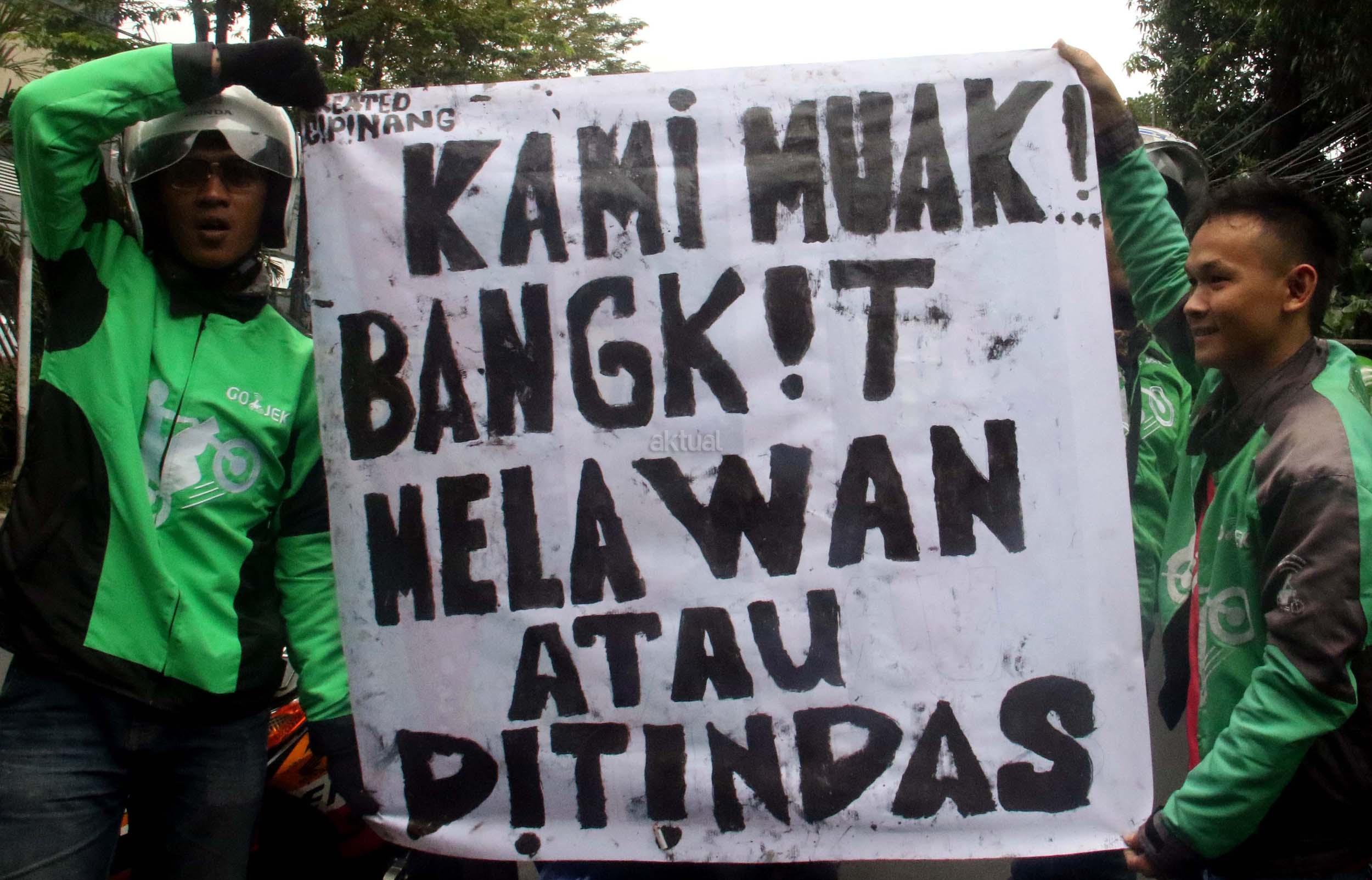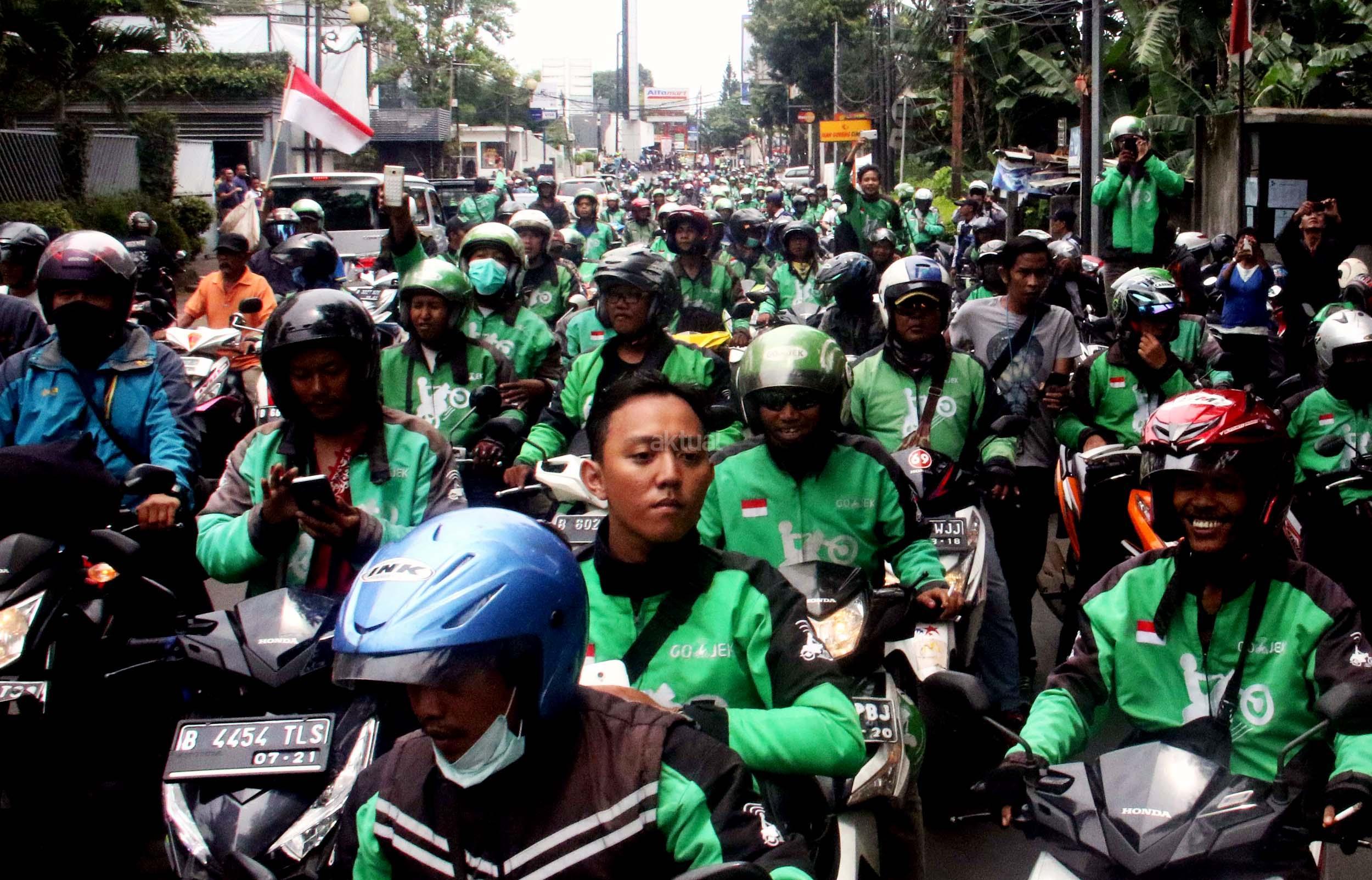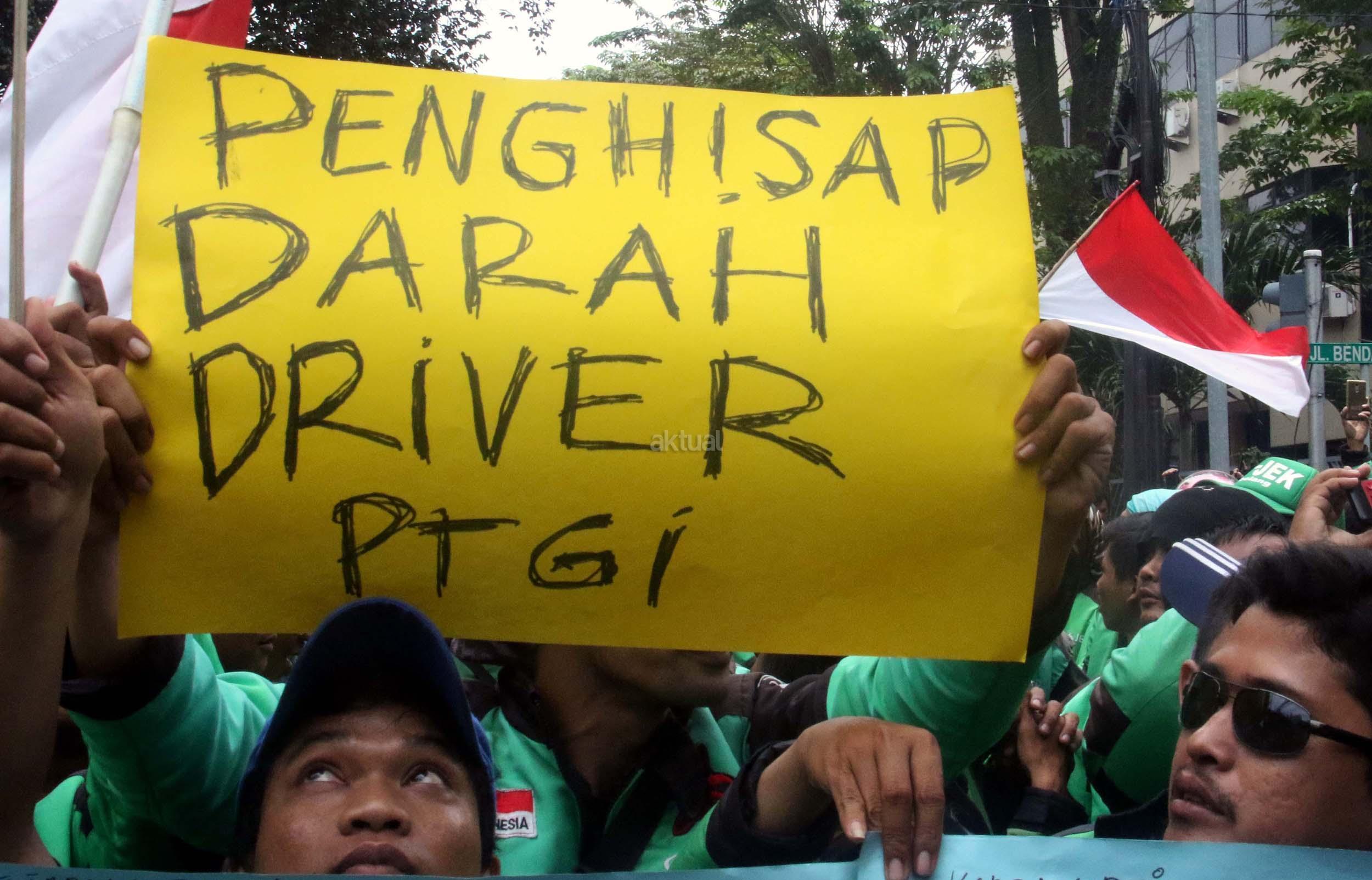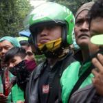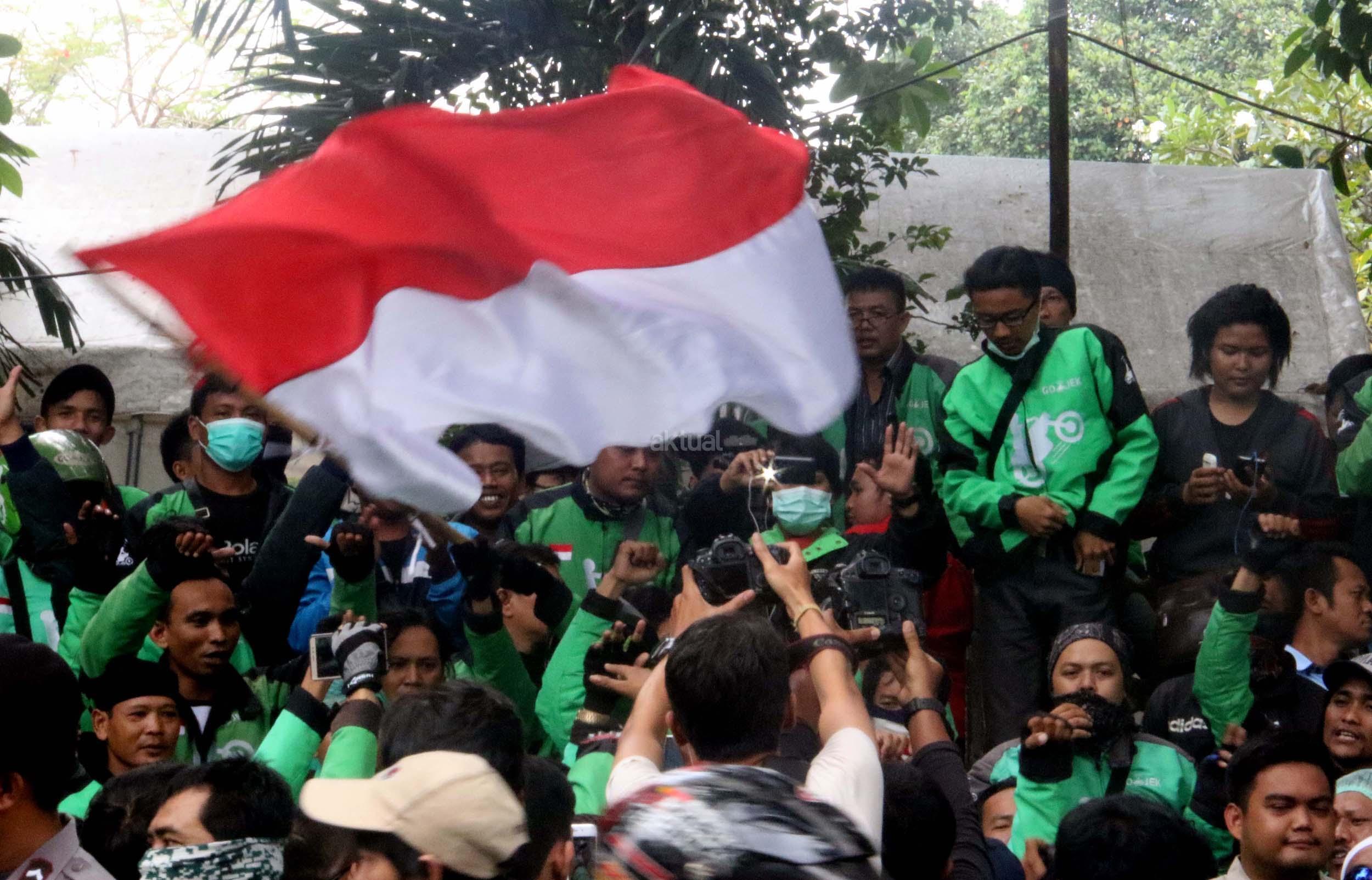 Ribuan driver Gojek melakukan aksi unjuk rasa di depan kantor PT Gojek Indonesia, Jakarta, Senin (3/10/2016). Dalam aksinya ribuan drevir Gojek mendesak untuk dihapuskan sistem performa (rating) karena menyusahkan para driver Gojek. Aktual/Munzir