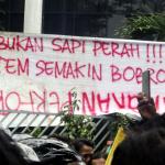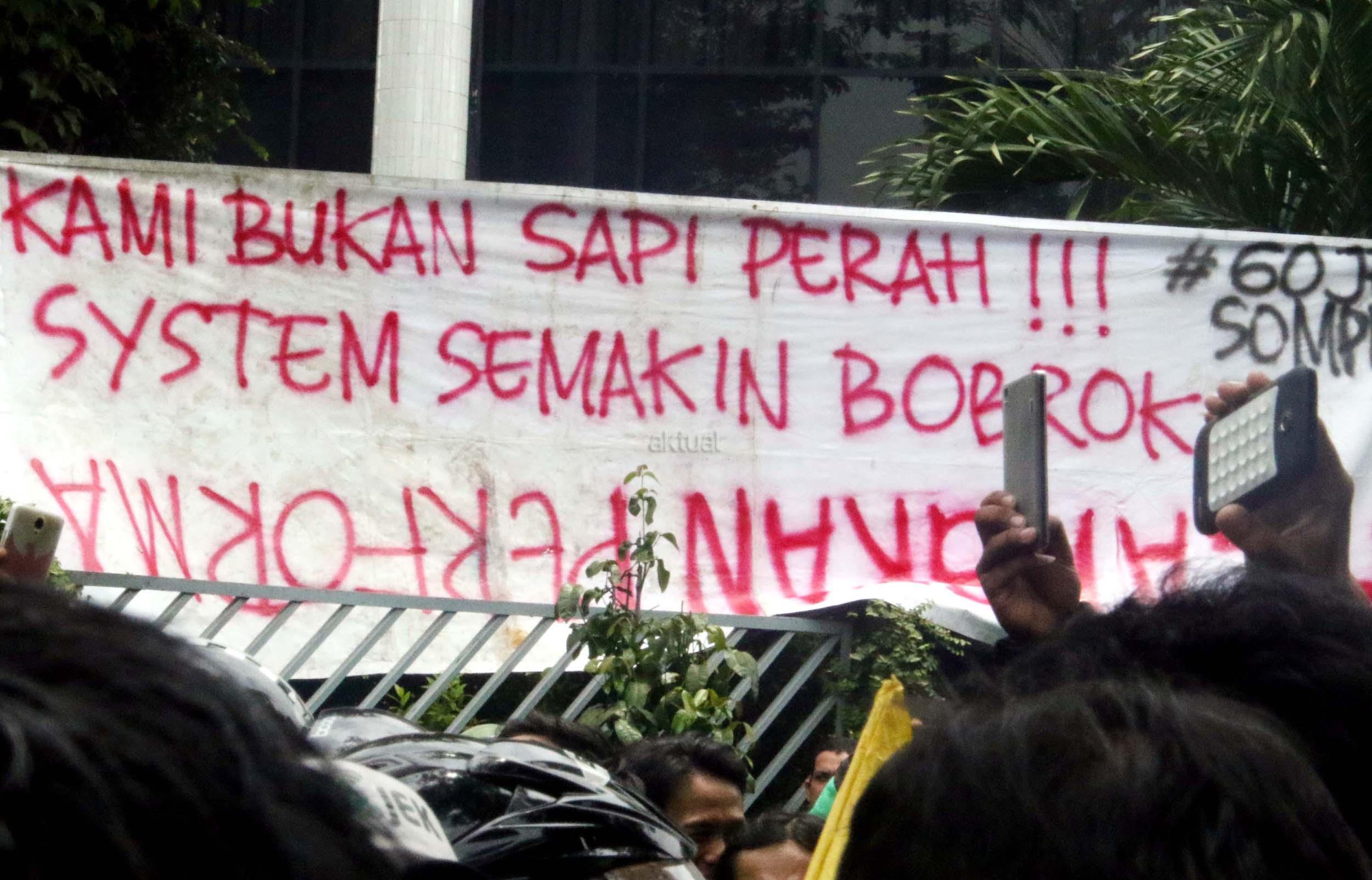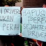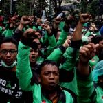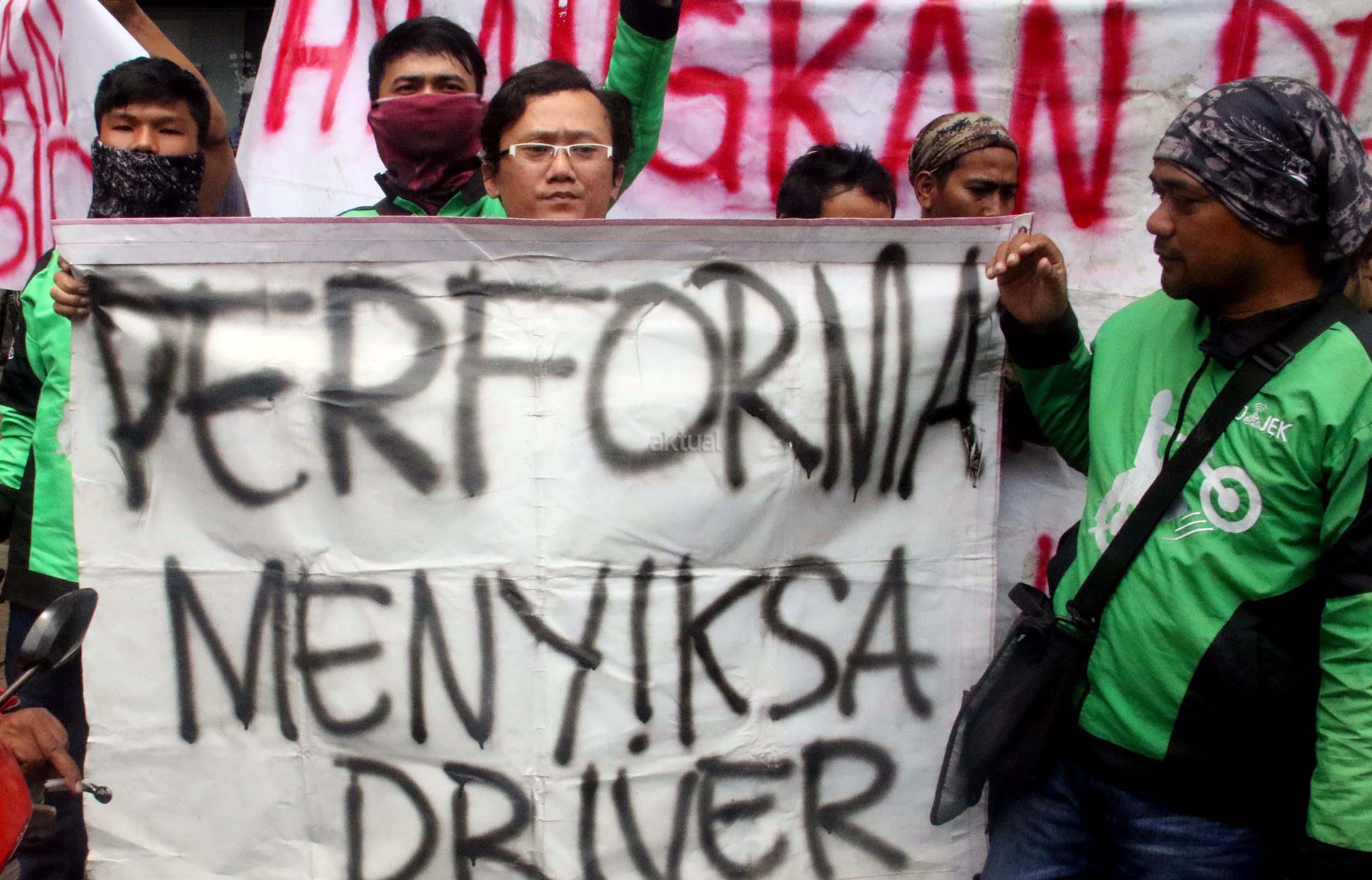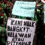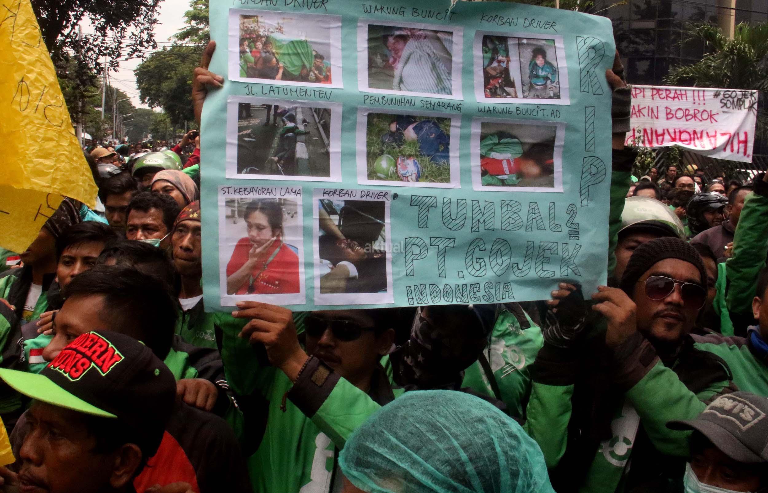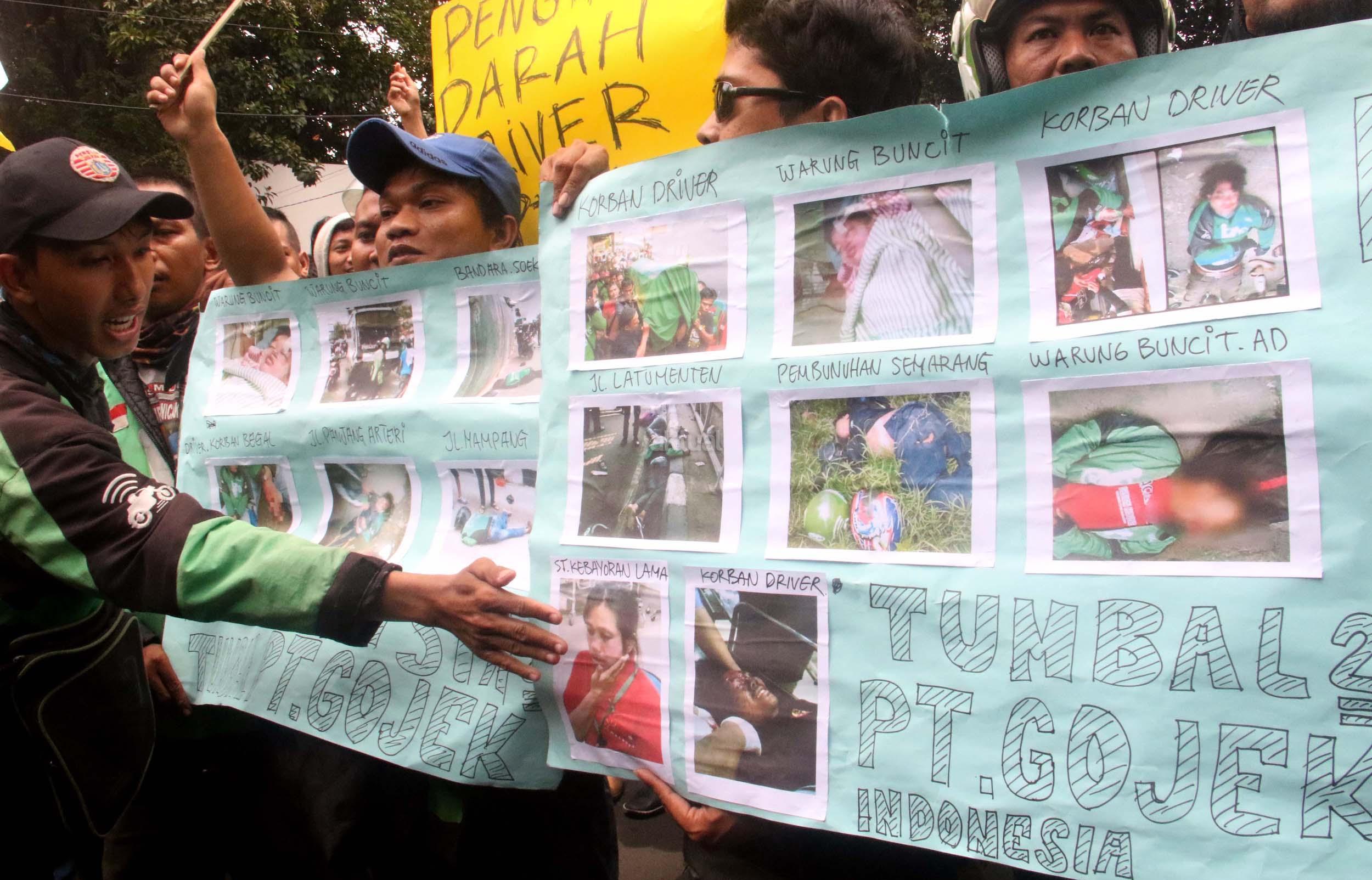 Ribuan driver Gojek melakukan aksi unjuk rasa di depan kantor PT Gojek Indonesia, Jakarta, Senin (3/10/2016). Dalam aksinya ribuan drevir Gojek mendesak untuk dihapuskan sistem performa (rating) karena menyusahkan para driver Gojek. Aktual/Munzir