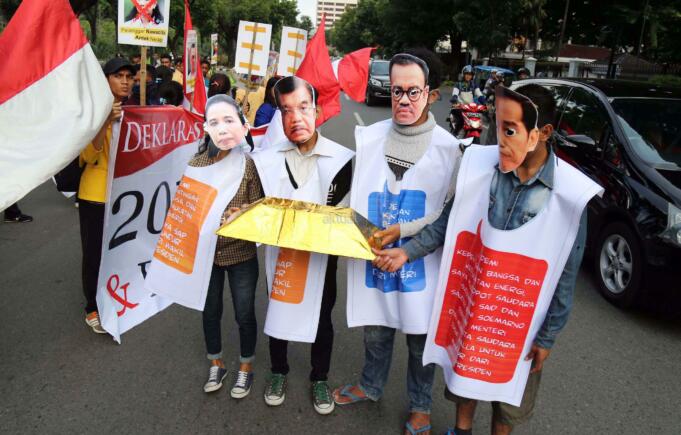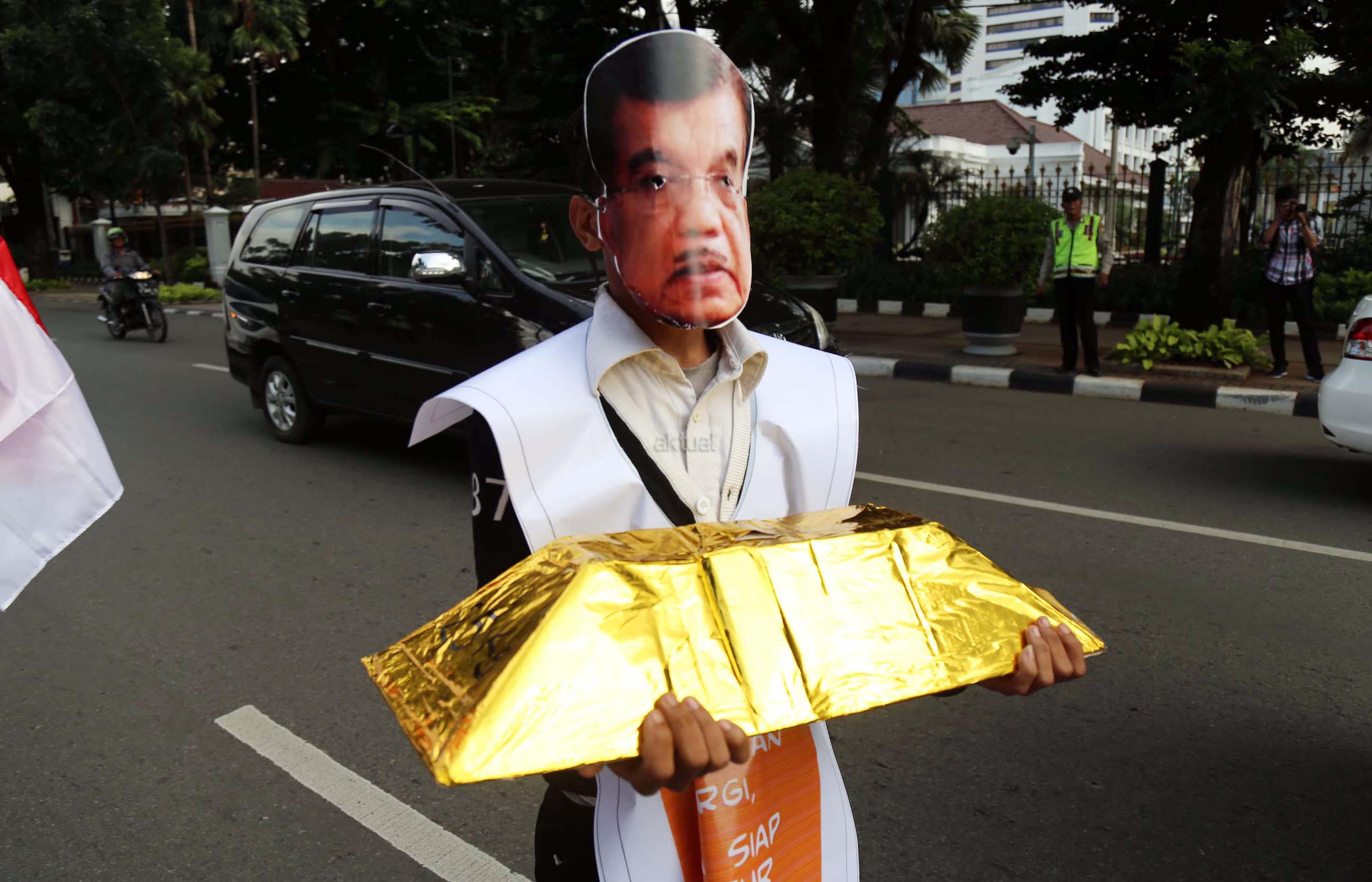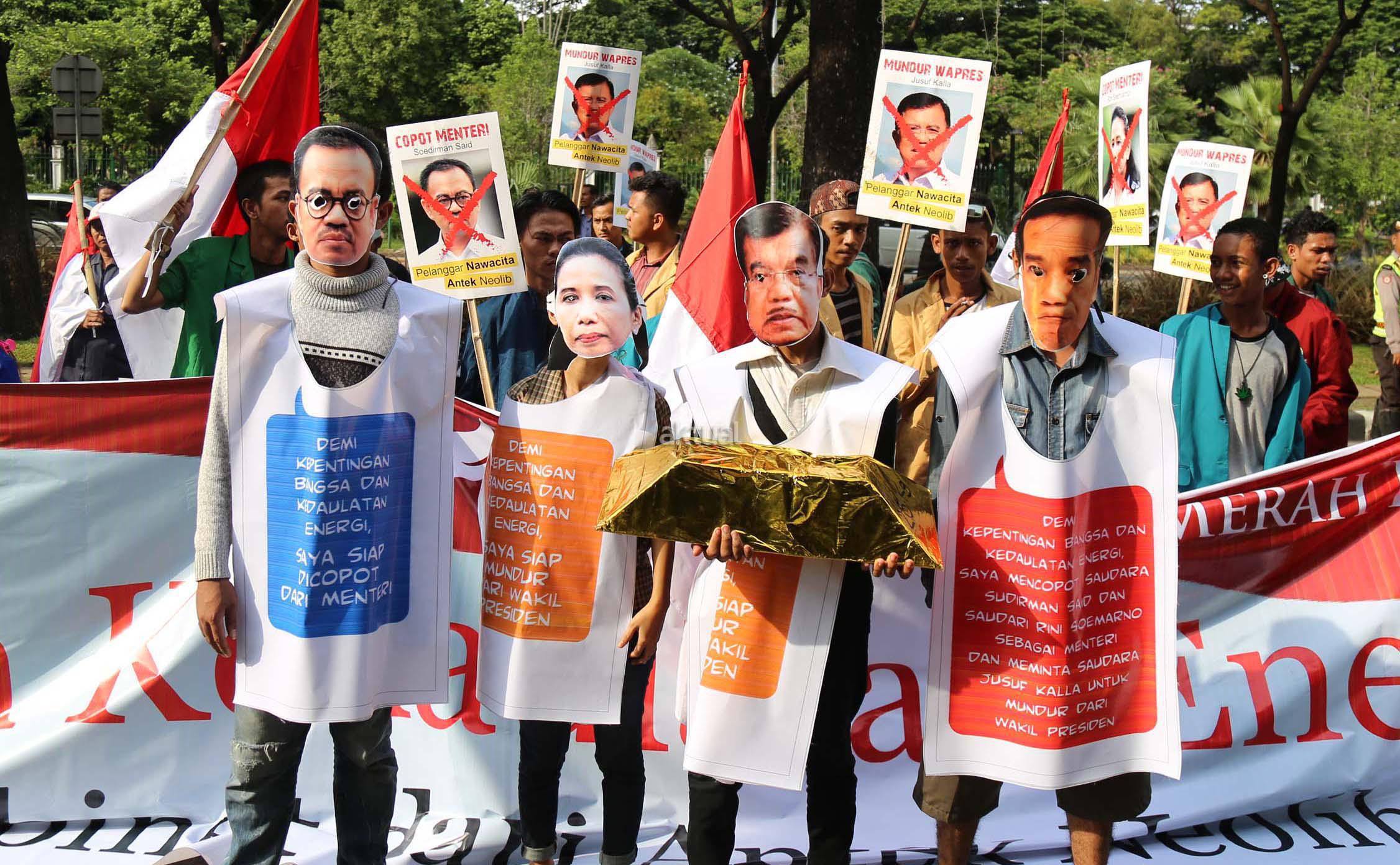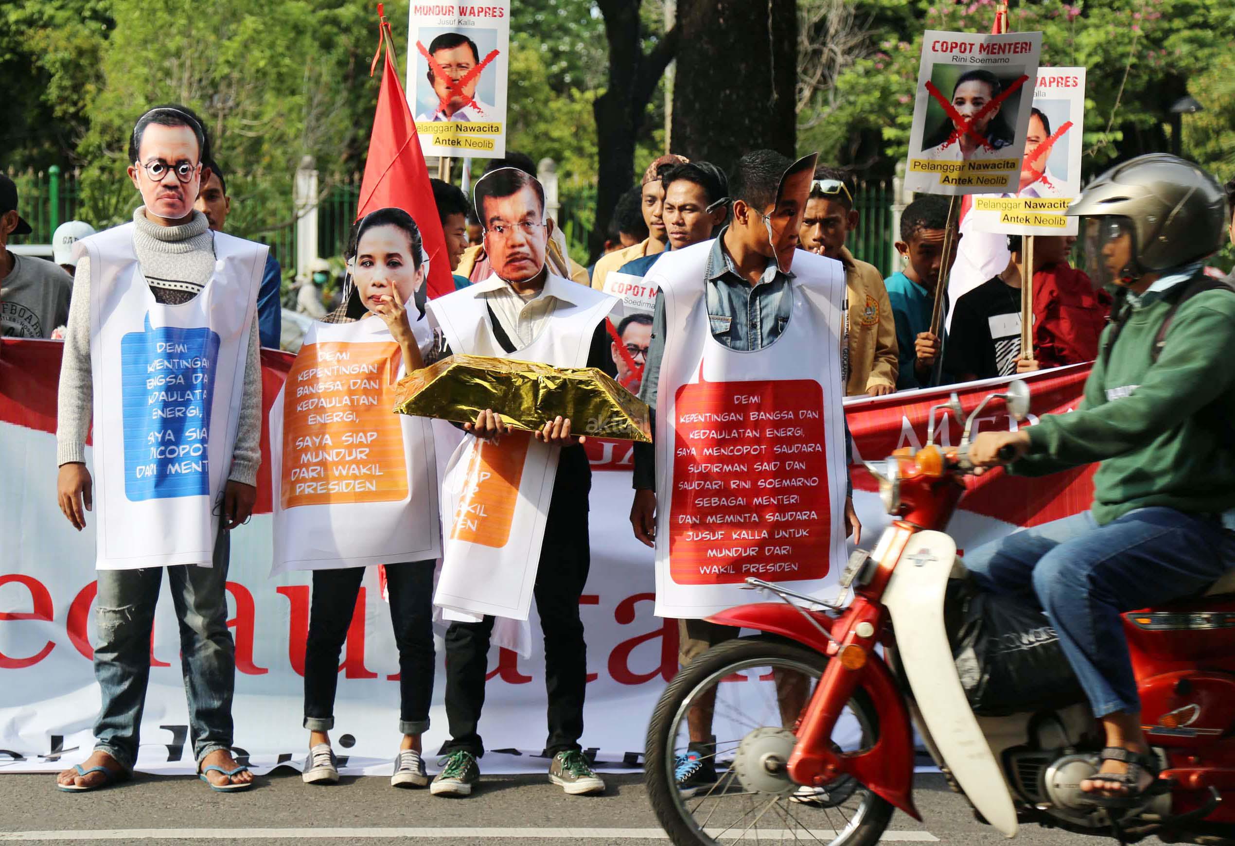 Empat aktivis Garuda Merah Putih menggunakan topeng wajah Presiden Joko Widodo, Wakil Presiden Jusuf Kalla, Menteri BUMN Rini Soemarno dan Menteri ESDM Sudirman Said berbagi emas Freepost saat melakukan aksi menolak perpanjangan kontrak di depan Istana Wapres, Jakarta, Rabu (13/1). Aksi tersebut meminta Menteri ESDM Sudirman Said yang telah menjadi komperador antek penjajah perusahaan asing seperti Freeport, McMoran, Newmont, Inpex di blok Marsela untuk dimundurkan dari jabatannya dan Menteri BUMN Rini Soemarno yang telah menjadikan BUMN keluar dari tujuannya dengan berorientasi bisnis semata. AKTUAL/TINO OKTAVIANO