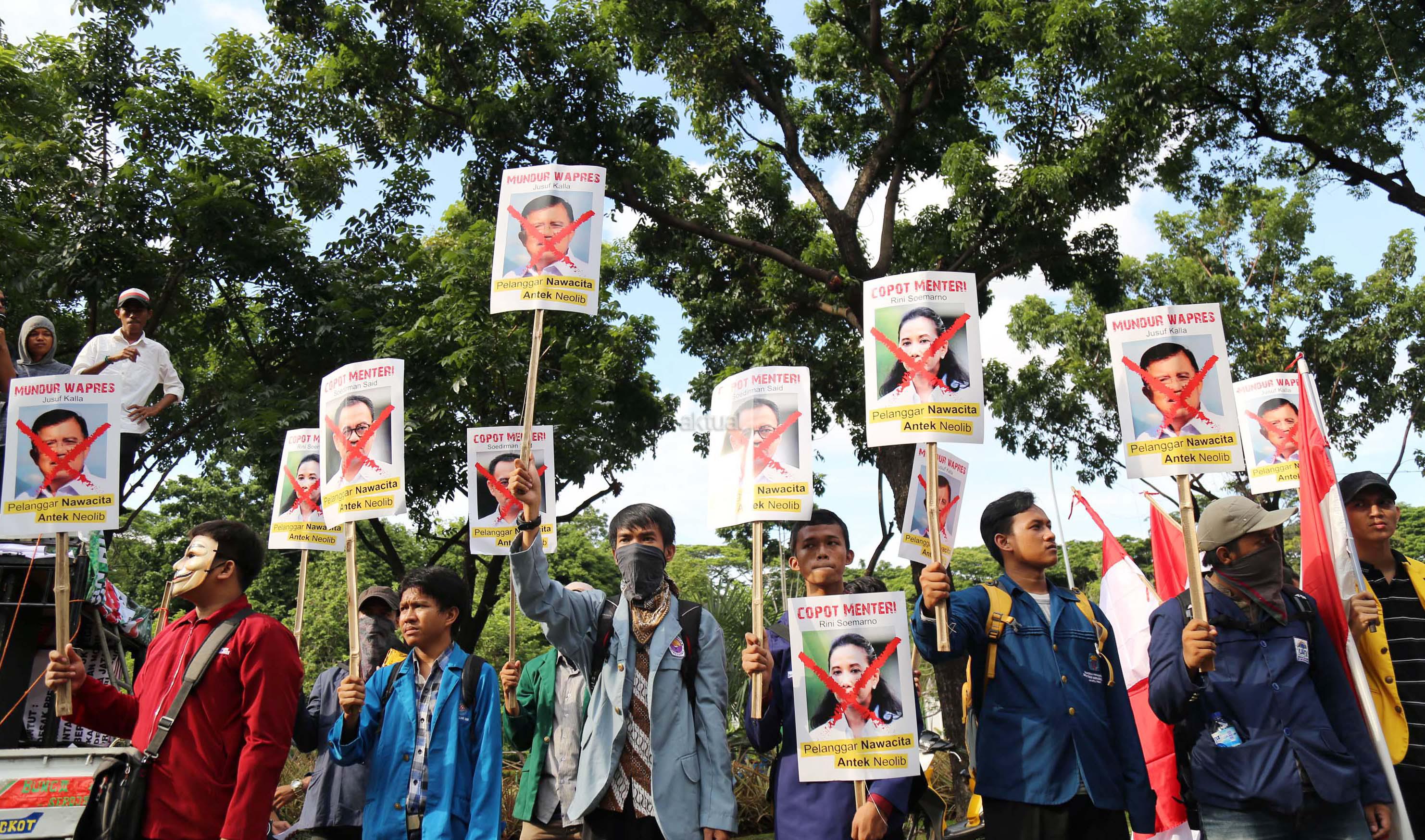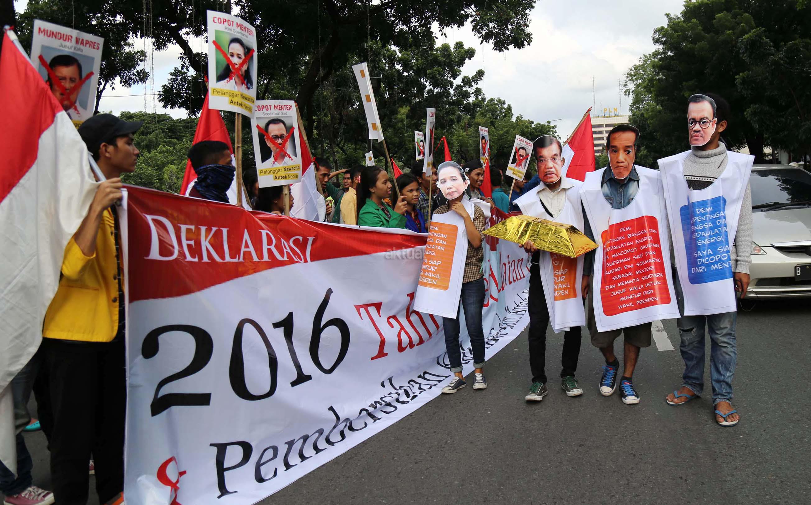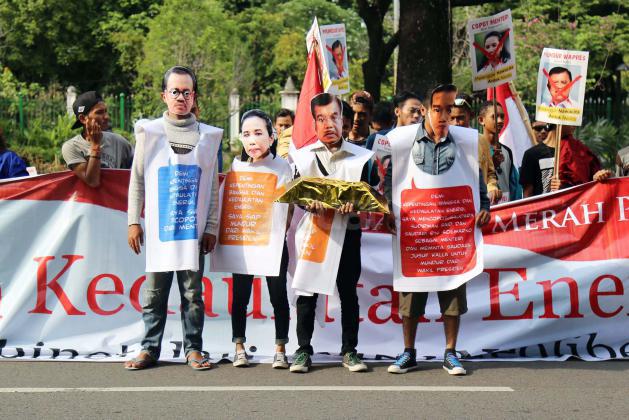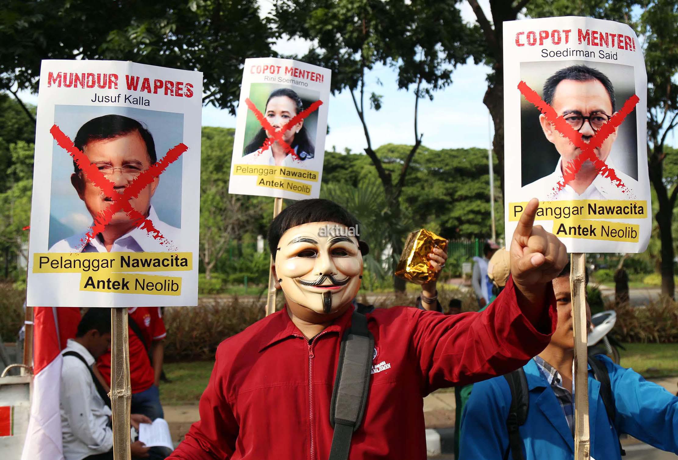 Empat aktivis Garuda Merah Putih menggunakan topeng wajah Presiden Joko Widodo, Wakil Presiden Jusuf Kalla, Menteri BUMN Rini Soemarno dan Menteri ESDM Sudirman Said berbagi emas Freepost saat melakukan aksi menolak perpanjangan kontrak di depan Istana Wapres, Jakarta, Rabu (13/1). Aksi tersebut meminta Menteri ESDM Sudirman Said yang telah menjadi komperador antek penjajah perusahaan asing seperti Freeport, McMoran, Newmont, Inpex di blok Marsela untuk dimundurkan dari jabatannya dan Menteri BUMN Rini Soemarno yang telah menjadikan BUMN keluar dari tujuannya dengan berorientasi bisnis semata. AKTUAL/TINO OKTAVIANO
