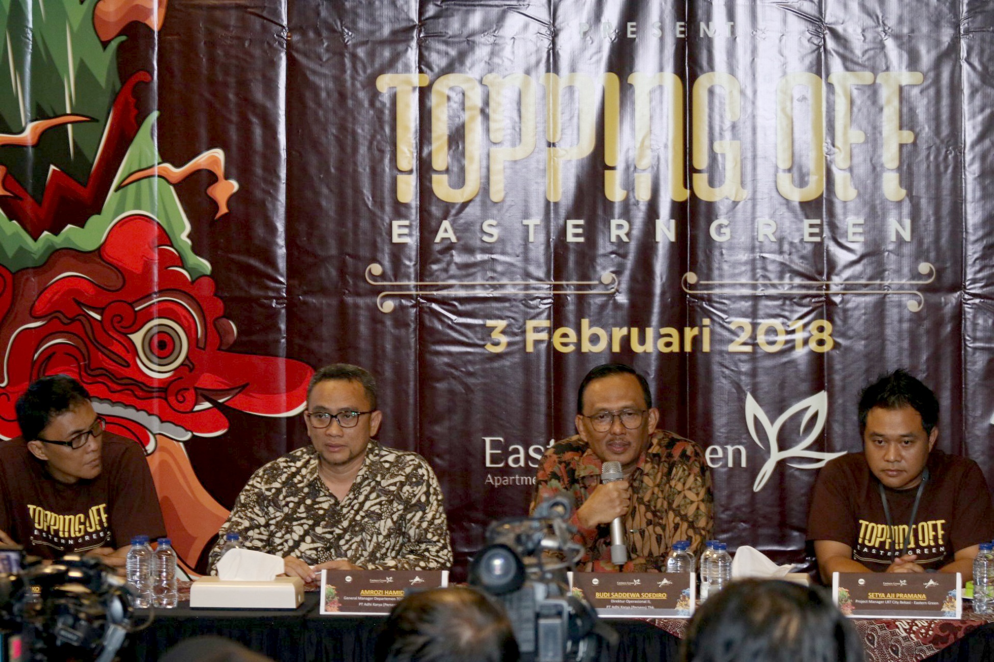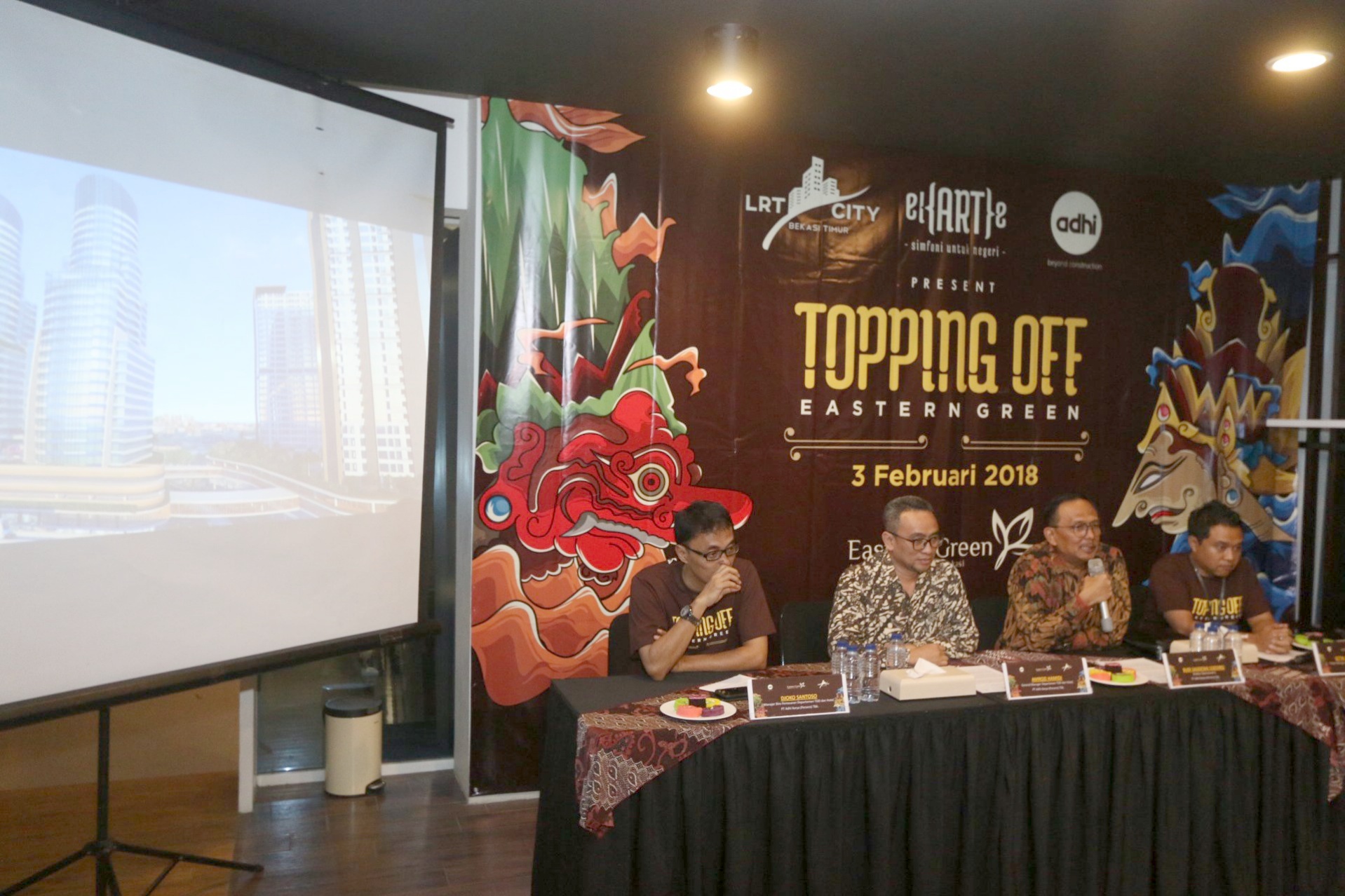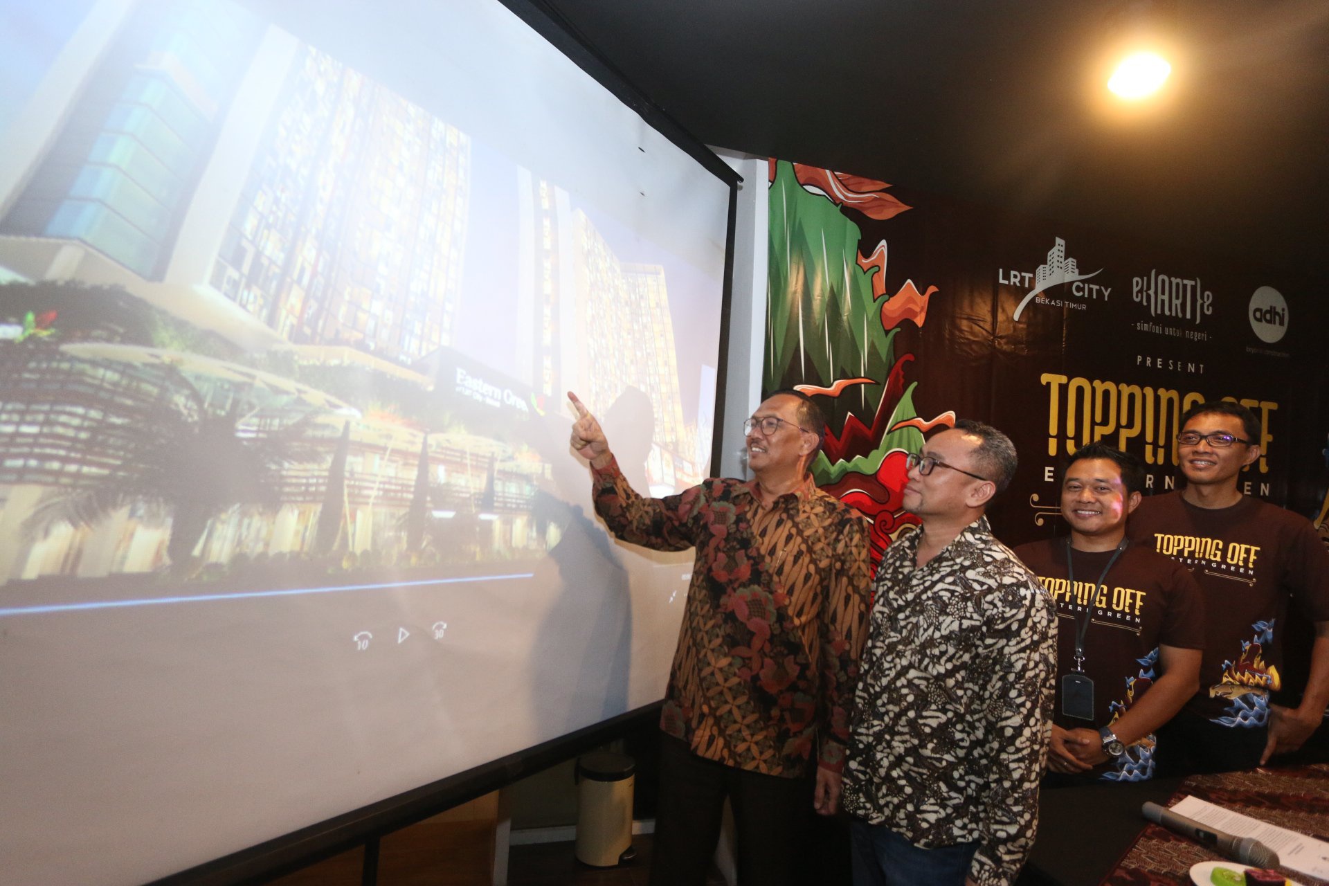Direktur Operasional PT Adhi Karya (Persero) Tbk Budi Saddewa Soediro (kiri) dan GM Departemen TOD dan Hotel Amrozi Hamidi (tengah), menunjukkan gambar proyek pembangunan apartemen Eastern Green, sebelum Topping Off di kawasan LRT City Bekasi Timur, Jawa Barat, Sabtu (3/2). Pembangunan kawasan LRT City Bekasi Timur, Eastern Green di atas lahan seluas 16,9 Ha, di sisi stasiun LRT Bekasi Timur, hampir selesai dan direncanakan serah terima pada tahun 2019, bersamaan dengan pengoperasian LRT Bekasi Timur - Cawang - Dukuh Atas. AKTUAL/HO