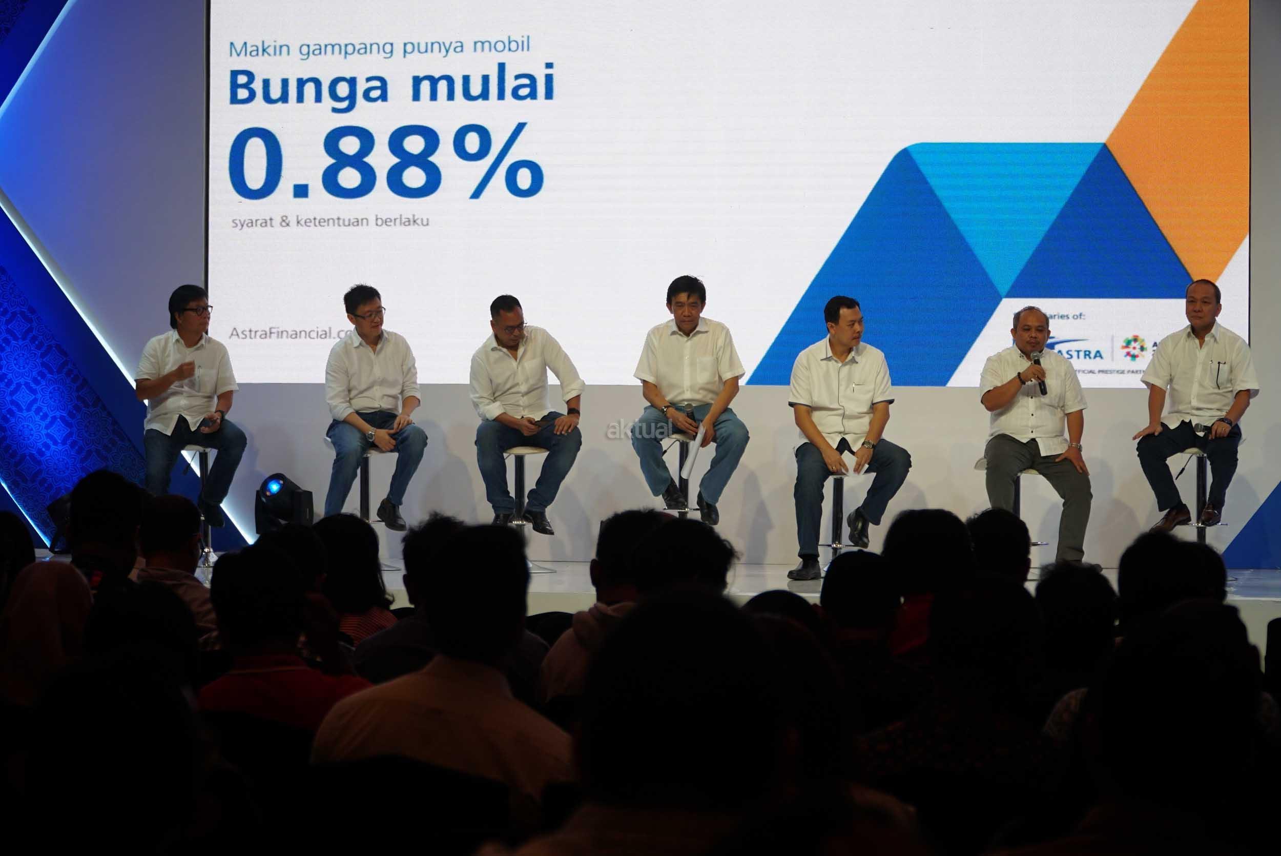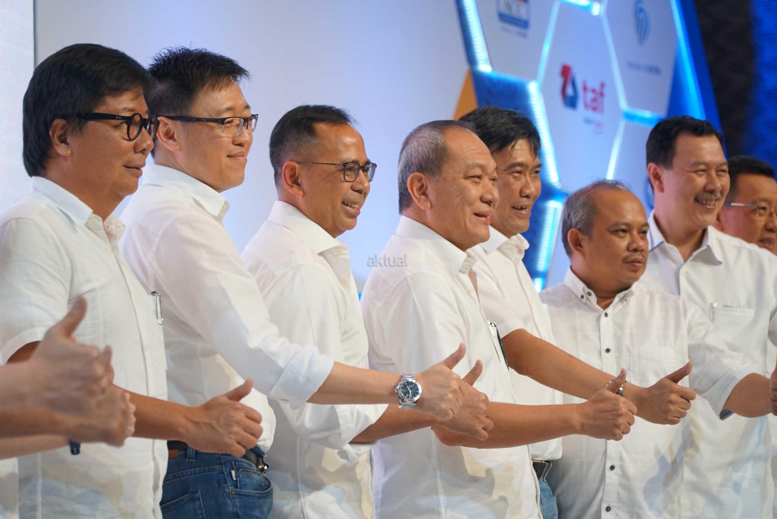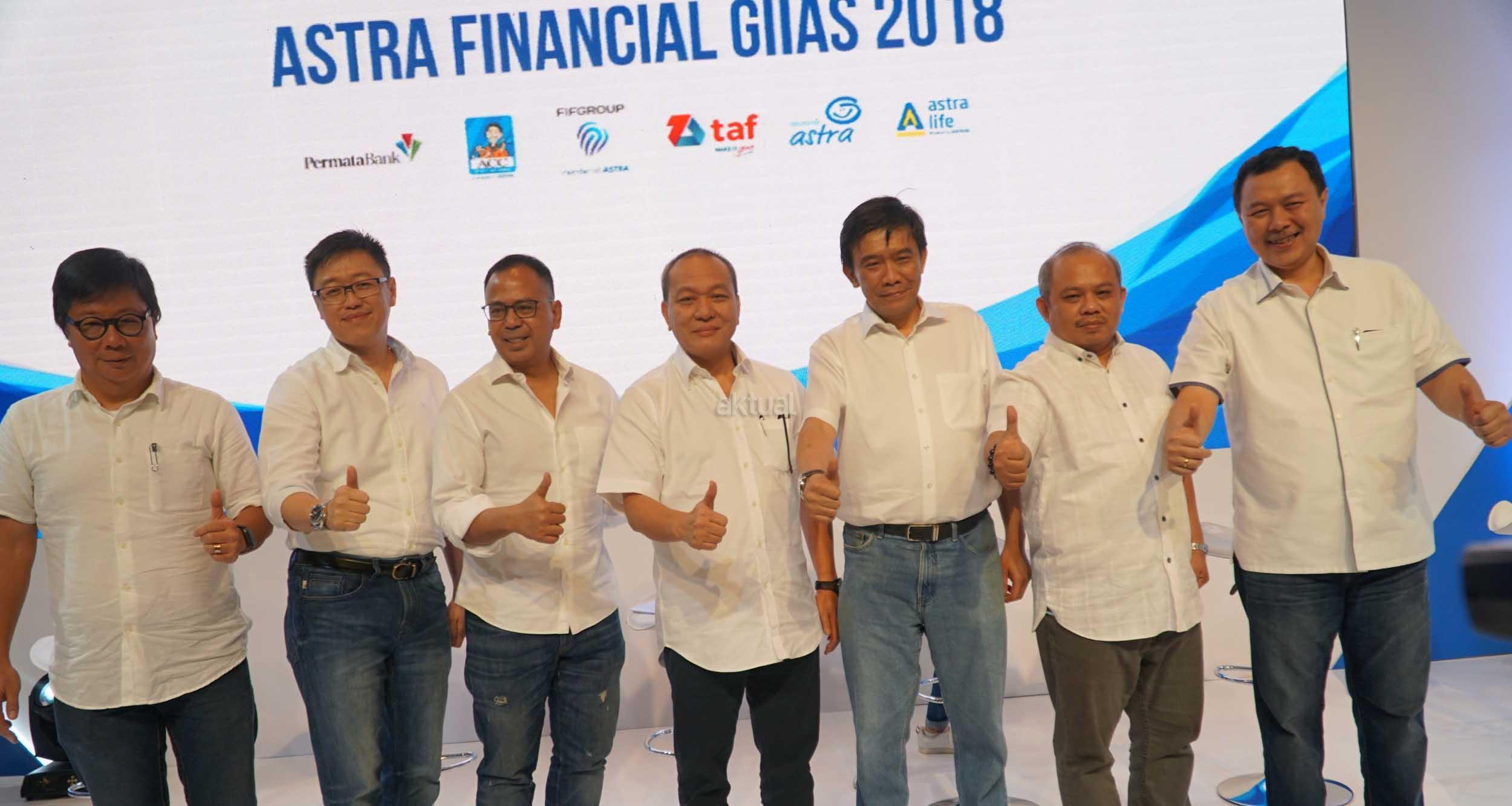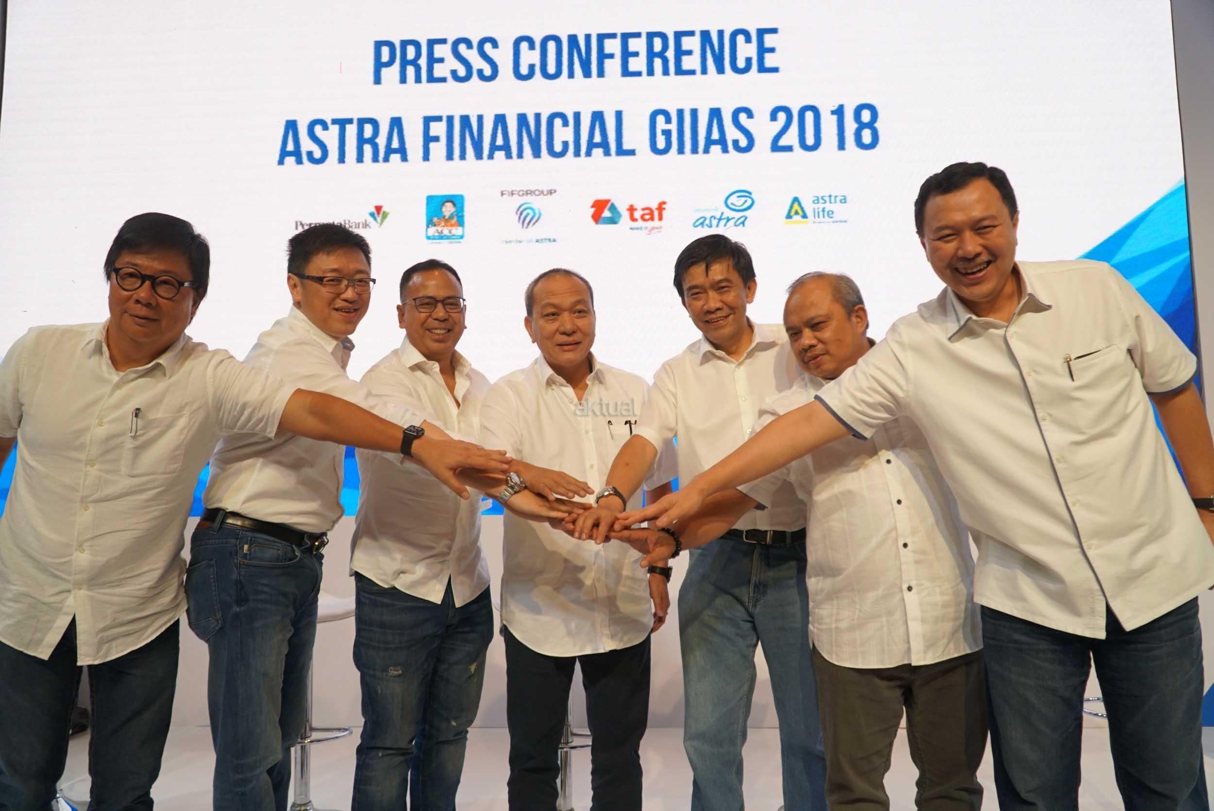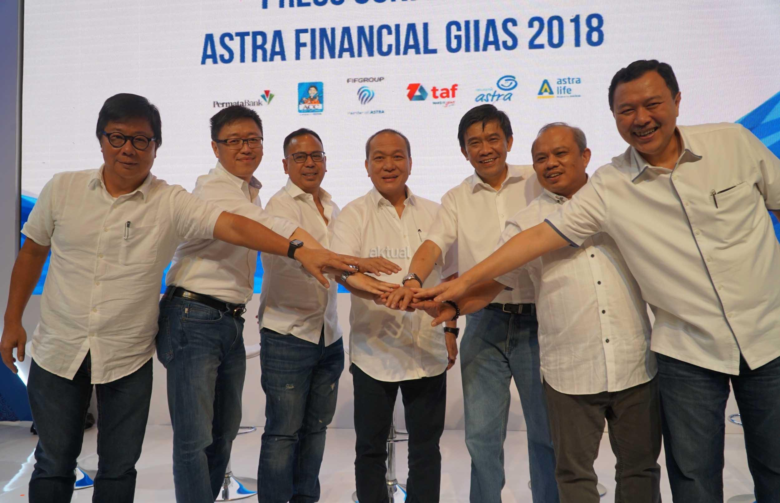 Direktur PT Astra International/ Director in Charge Astra Financial Suparno Djasmin (tengah) bersama (dari kiri) Presiden Direktur Astra Life Auddie Wiranata, Chief Executive Officer Asuransi Astra Rudy Chen, Direktur Utama Permata Bank Ridha DM Wirakusumah, Presiden Direktur FIF Group Margono Tanuwijaya, Presiden Direktur Astra Credit Companies (ACC) Siswadi dan Presiden Direktur Toyota Astra Financial Services Agus Prayitno bertumpu tangan pada pengumuman keikutsertaan Astra Financial sebagai sponsor utama pameran otomotif GIIAS 2018 di Jakarta, Selasa (24/7). Keikutsertaan Astra Financial pada Gaikindo Indonesia International Autoshow 2018 dengan melibatkan enam dari 10 Lembaga Jasa Keuangan (LJK) didalamnya untuk mendukung perkembangan industri otomotif nasional. AKTUAL/Eko S Hilman