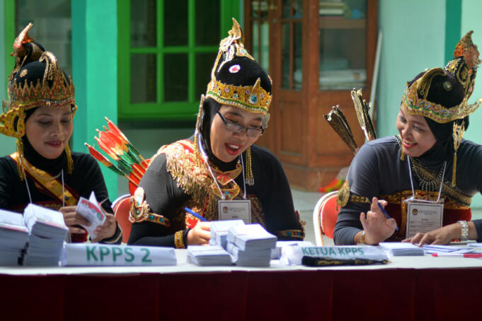 Sejumlah petugas Kelompok Penyelenggara Pemungutan Suara (KPPS) berbusana tokoh wayang Srikandi di Tempat Pemungutan suara (TPS) 19, Pondok Wage Indah, Aloha, Sidoarjo, Jawa Timur, Rabu (9/12). Sejumlah TPS di Sidoarjo dihias dan dibentuk unik, yang bertujuan untuk menarik warga agar menggunakan hak pilihnya. ANTARA FOTO/Umarul Faruq/ama/15