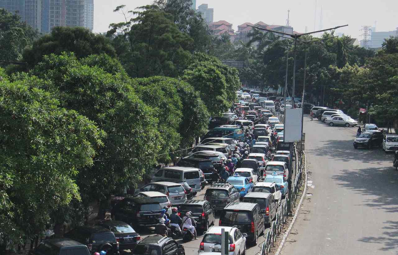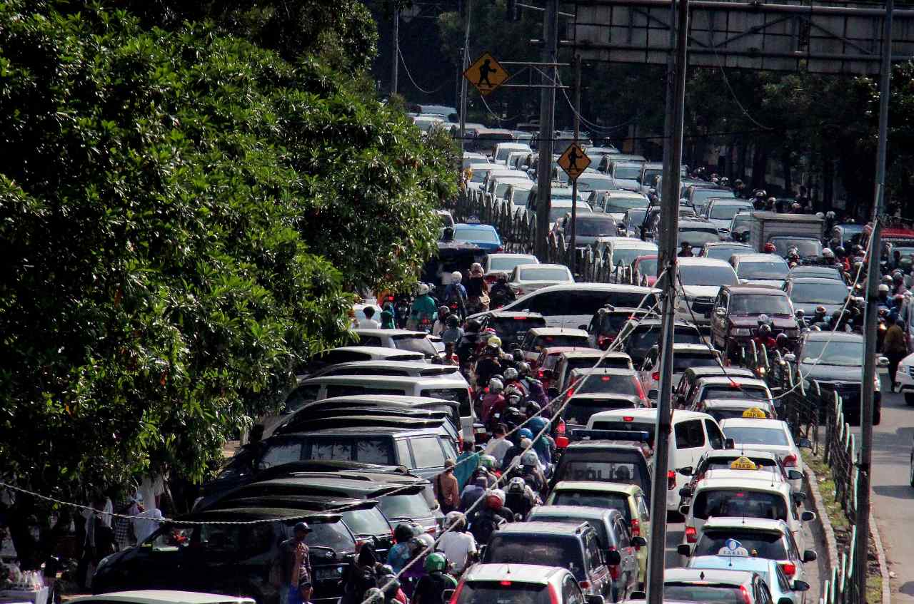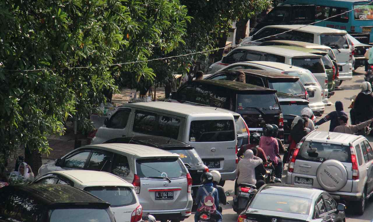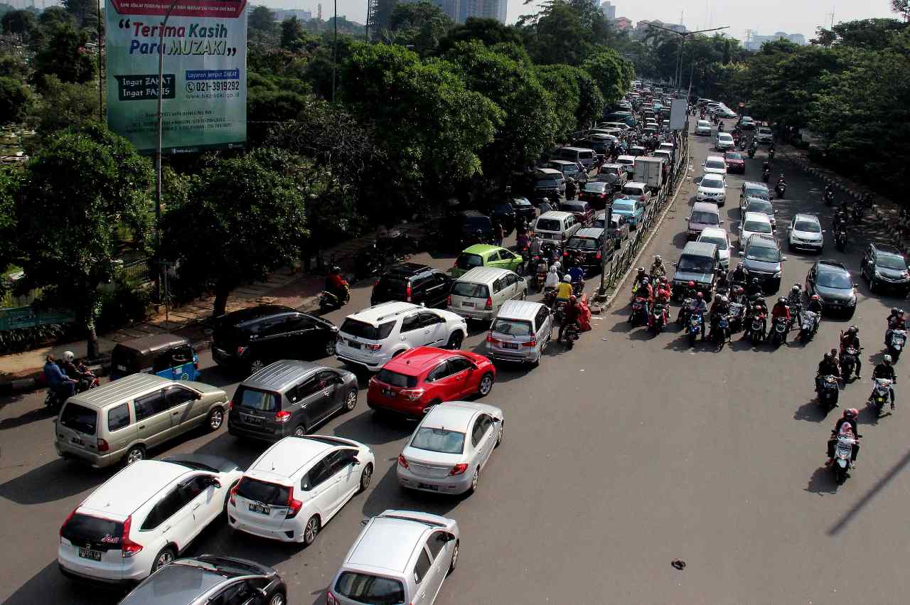 Kondisi arus lalu lintas di depan TPU Karet Bivak yang berada di Jalan. Penjernihan I, Jakarta, Rabu (6/7/2016). Padatnya peziarah menyebabkan arus lalu lintas di depan TPU menjadi tersendat karena warga memarkir kendaraan di badan jalan.