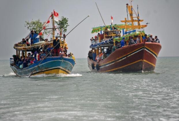 Sejumlah kapal nelayan pengangkut warga berlayar dalam tradisi Sedekah Laut di Pantai Morodemak, Bonang, Kabupaten Demak, Jawa Tengah, Rabu (13/7). Tradisi yang biasa digelar sepekan usai Idul Fitri tersebut merupakan simbol rasa syukur warga setempat atas limpahan rezeki dari Tuhan yang Maha Esa. ANTARA FOTO/Aditya Pradana Putra/ama/16.