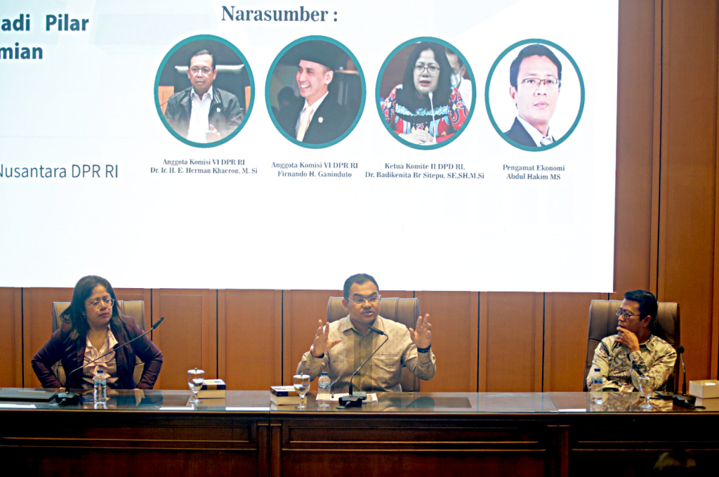 Ketua Komite II DPD Badikenita Br Sitepu (kiri), Deputi SDM & TI Kementerian BUMN Tedi Barata (tengah), dan Direktur Eksekutif Skala Survei Indonesia (SSI) Abdul Hakim (kanan) menjadi pembicara dalam Seminar Nasional di Ruang Abdul Muis, Kompleks Parlemen Senayan, Jakarta, Kamis (13/2).