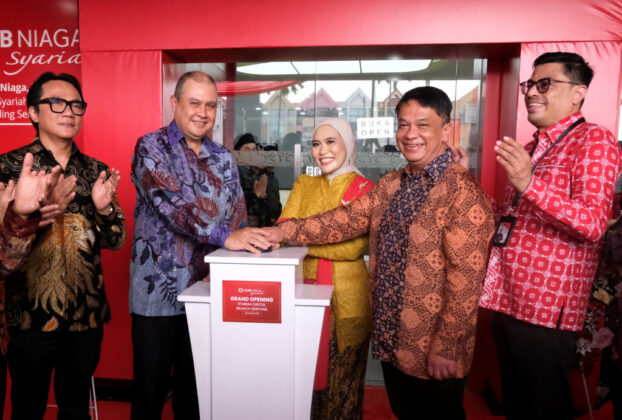 Direktur Syariah Banking CIMB Niaga Pandji P. Djajanegara (kedua kiri) bersama Head of Sharia Consumer & EBB CIMB Niaga Bung Aldilla (kedua kanan) dan Syariah Branch Area Head Jakarta & Sumatera South Syahadenita Chakiki (tengah) saat Grand Opening Syariah Digital Branch Serpong-Tangerang, di Tangerang, Rabu (22/10/2025).