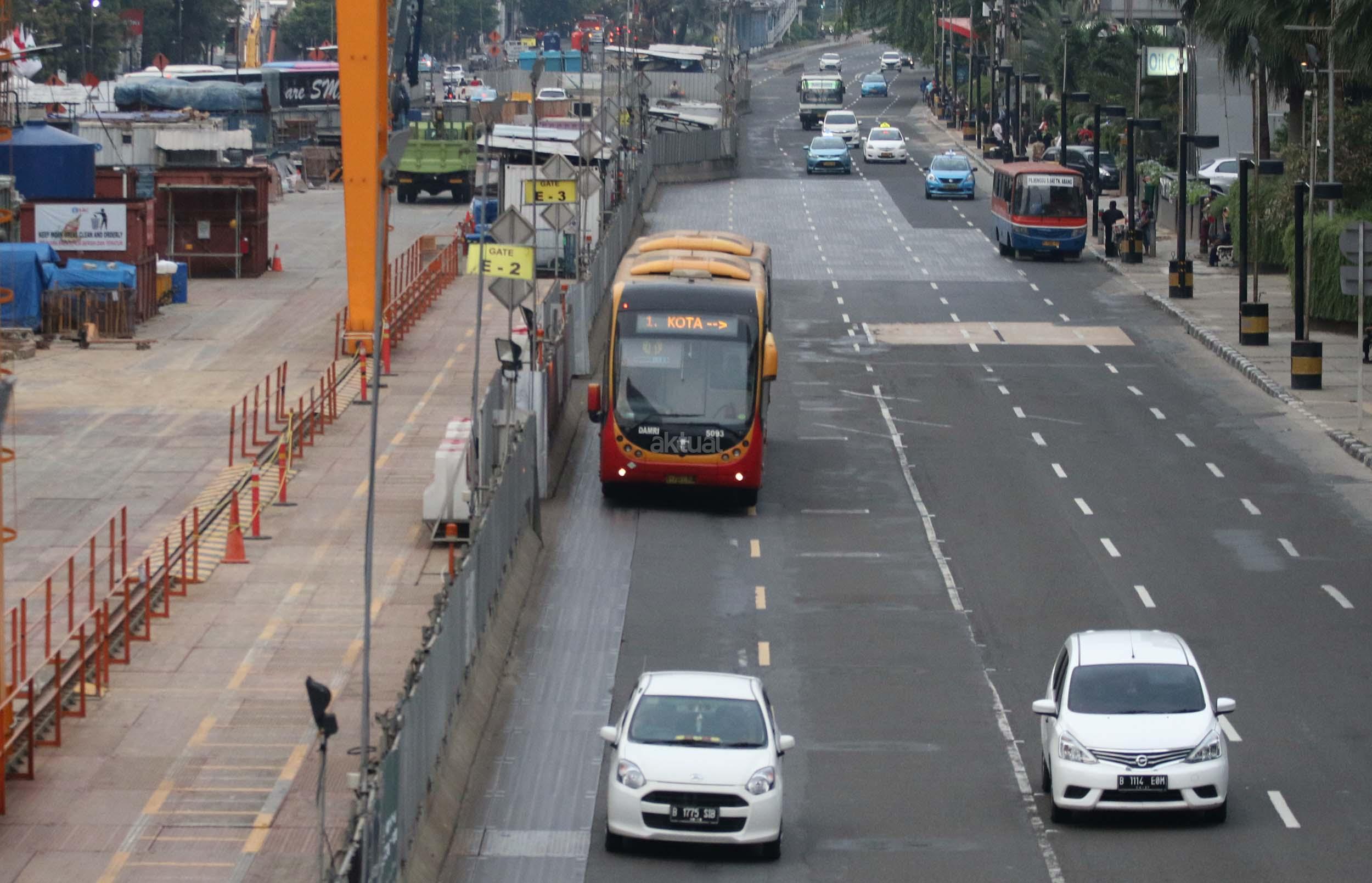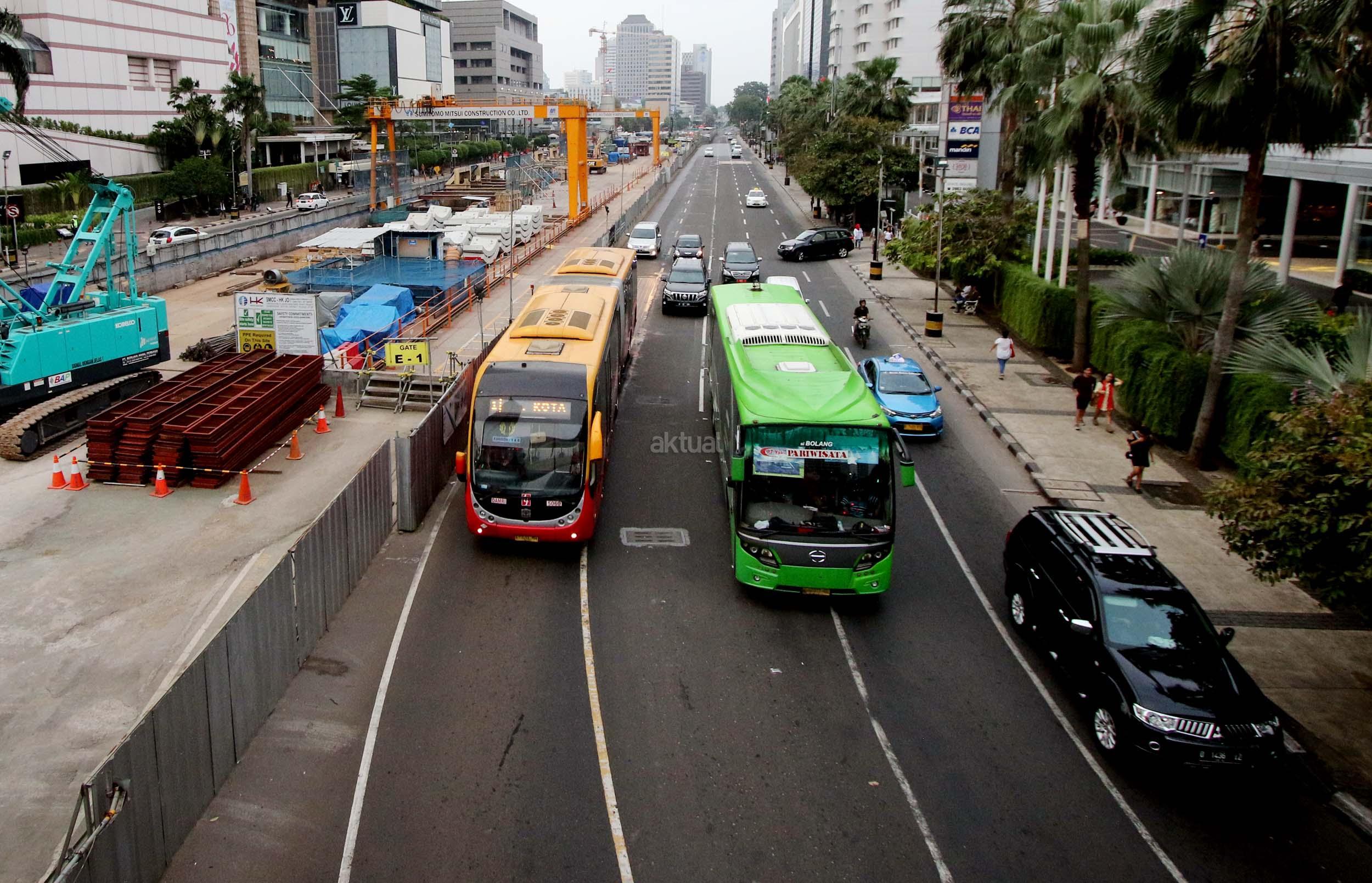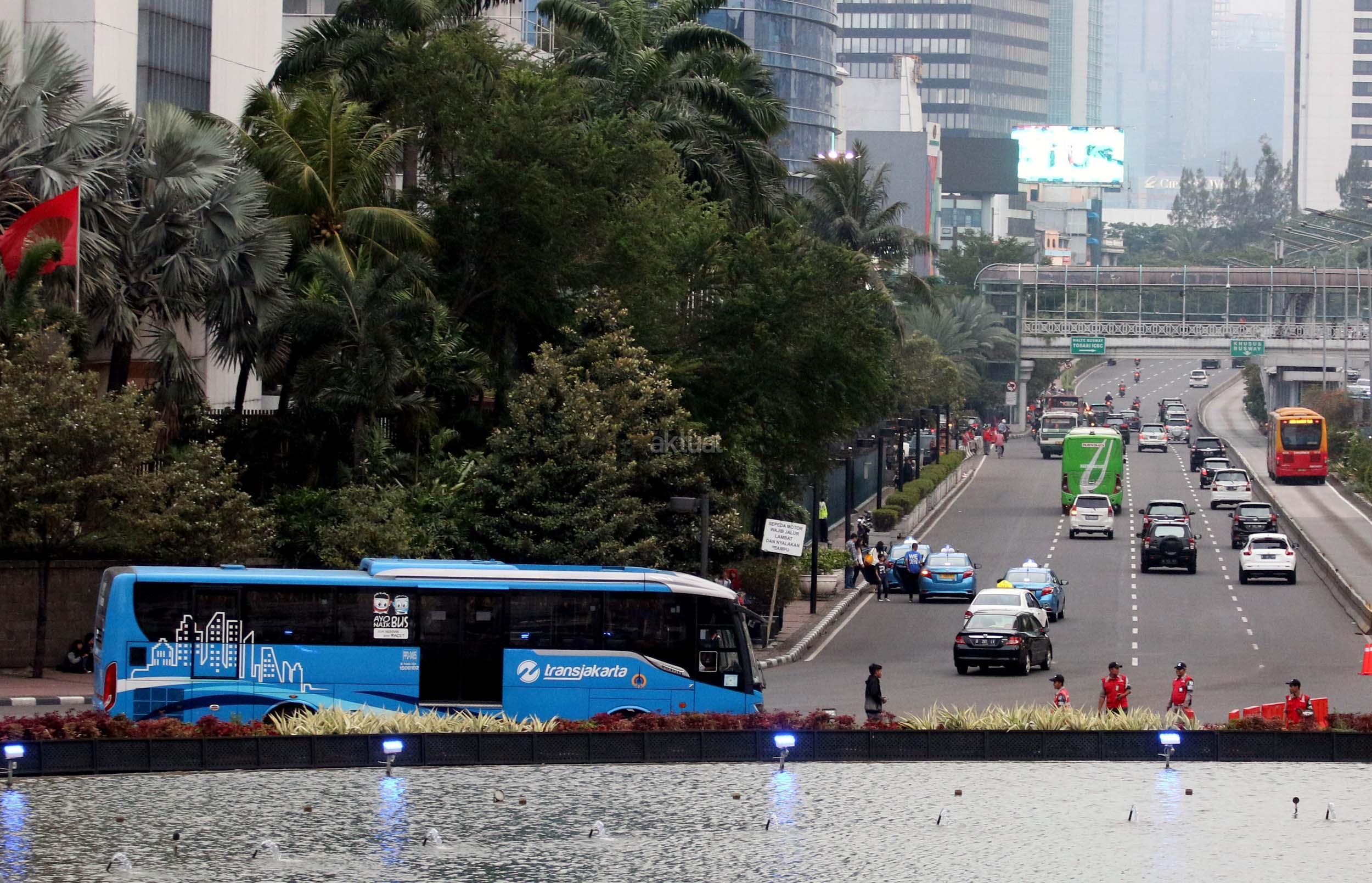 Bus Transjakarta melaju di Kawasan Bundaran HI, Jakarta, Sabtu (31/12/2016). PT Transportasi Jakarta (Transjakarta) mengoperasikan sebanyak 200 bus untuk melayani seluruh penumpang selama perayaan malam pergantian tahun dan akan beroperasi hingga pukul 02.00 WIB dini hari.