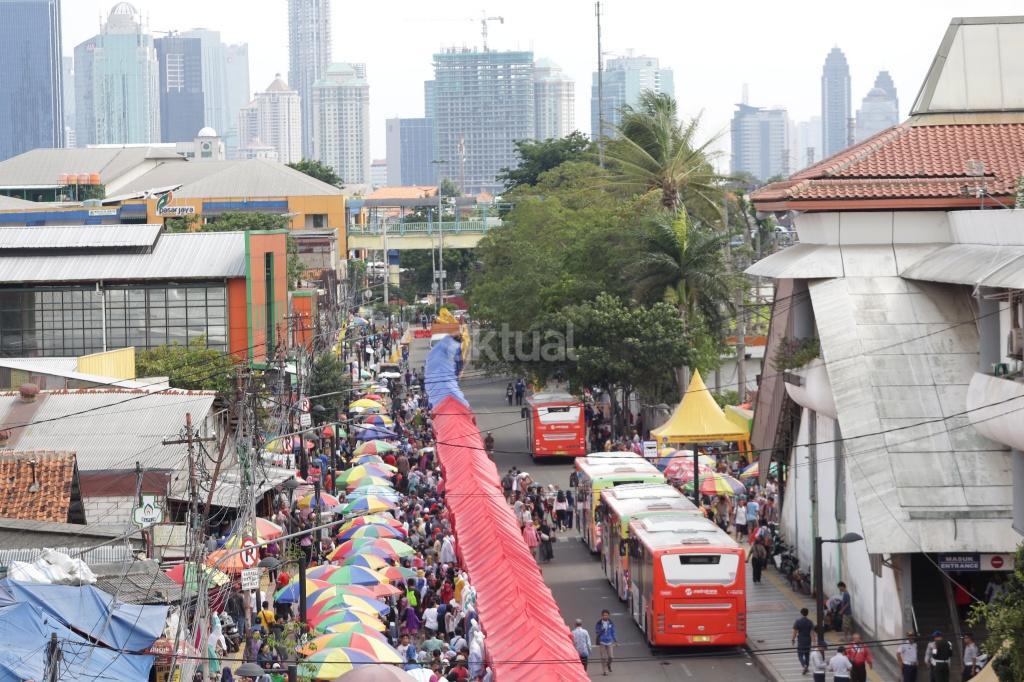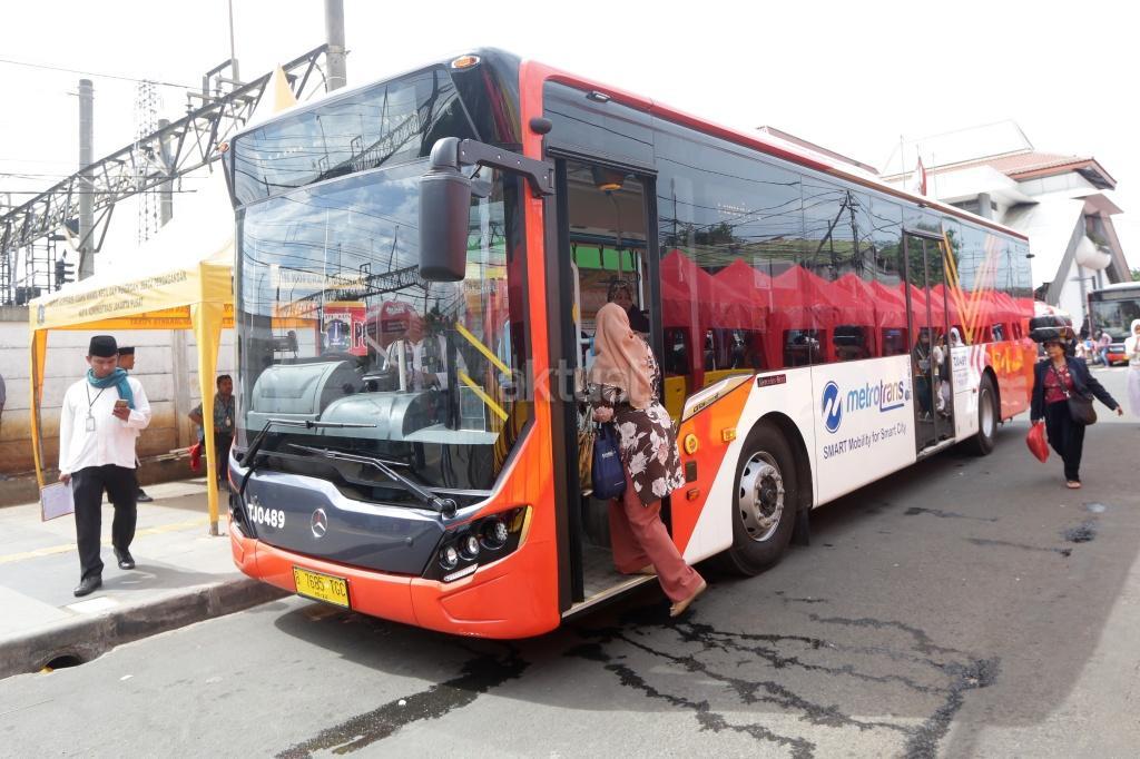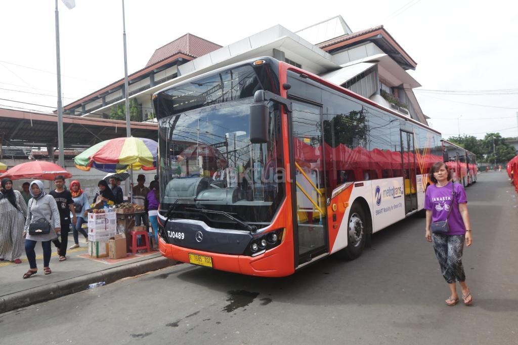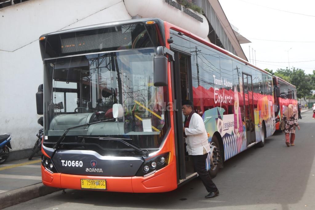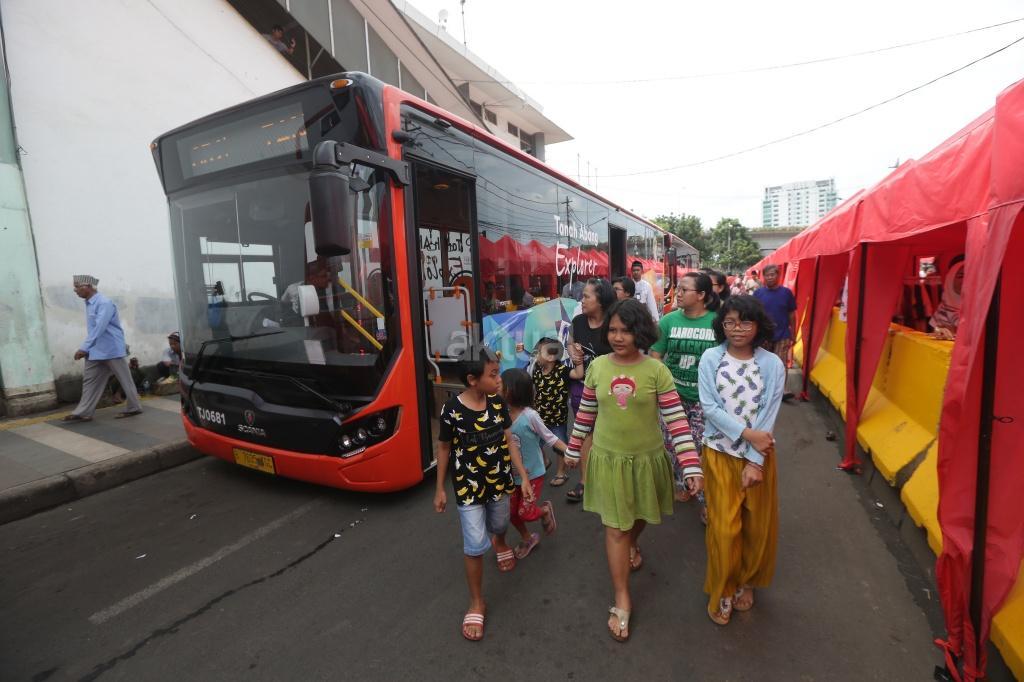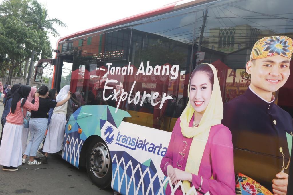 Sejumlah warga menaiki bus Transjakarta Tanah Abang Explorer di depan Stasiun Tanah Abang, Jakarta, Jumat (22/12). Pemprov DKI menyiapkan bus TransJakarta Tanah Abang Explorer akibat rekayasa lalu lintas atas penataan Tanah Abang, bus tersebut beroperasi mengelilingi Kawasan Tanah Abang dengan berhenti di Halte Stasiun Tanah Abang, Halte Blok G, Halte Blok B, Halte Auri, Halte Blok E dan Halte Flyover Jatibaru. AKTUAL/Tino Oktaviano