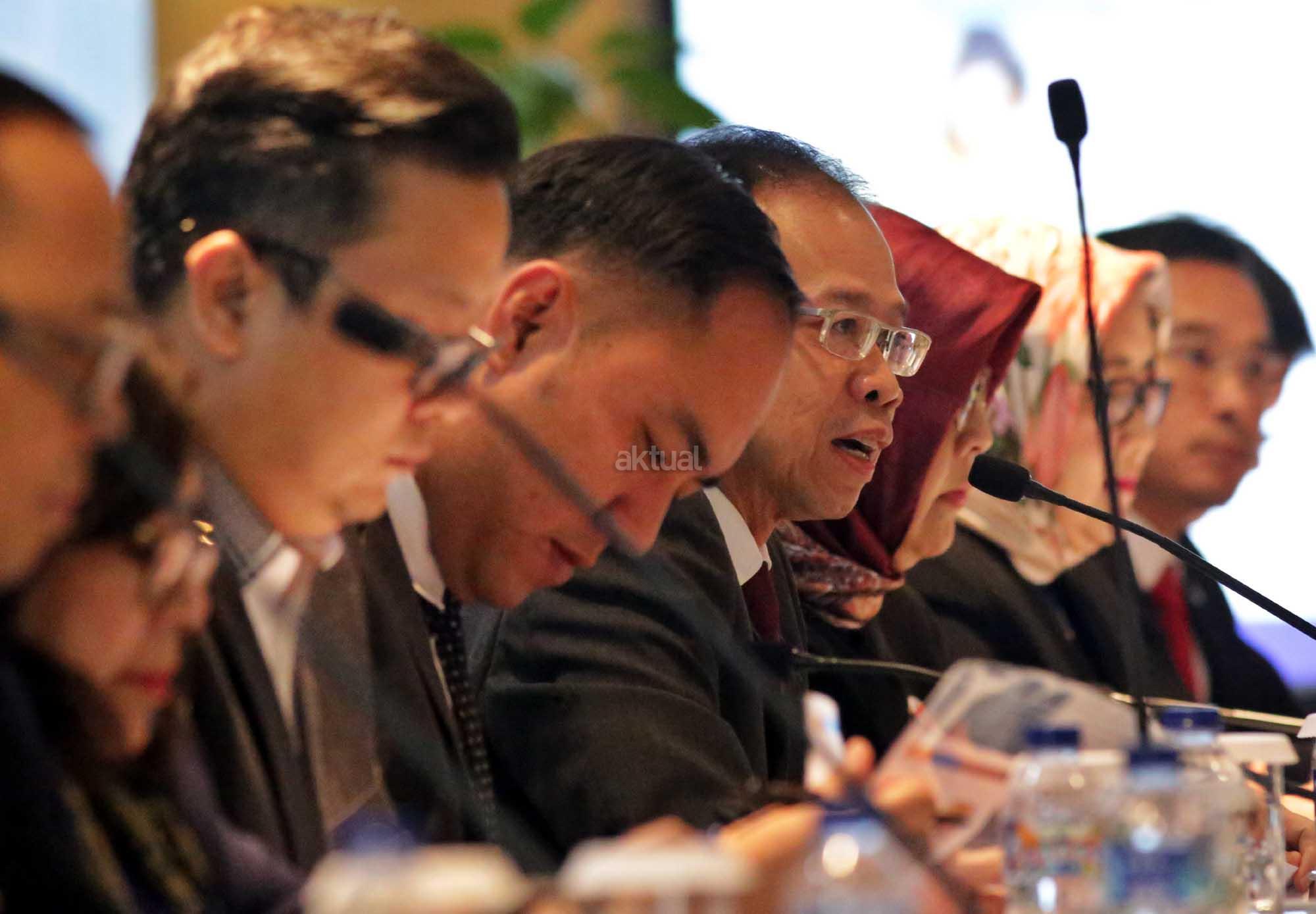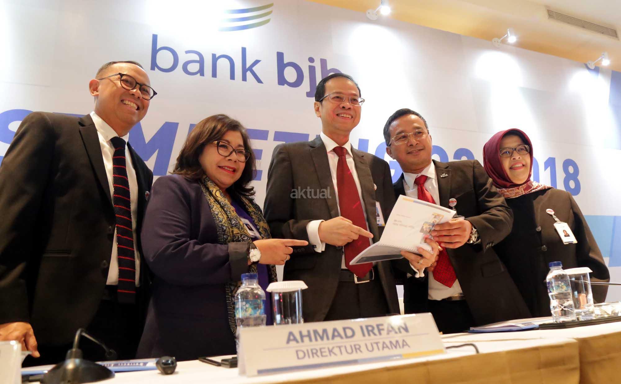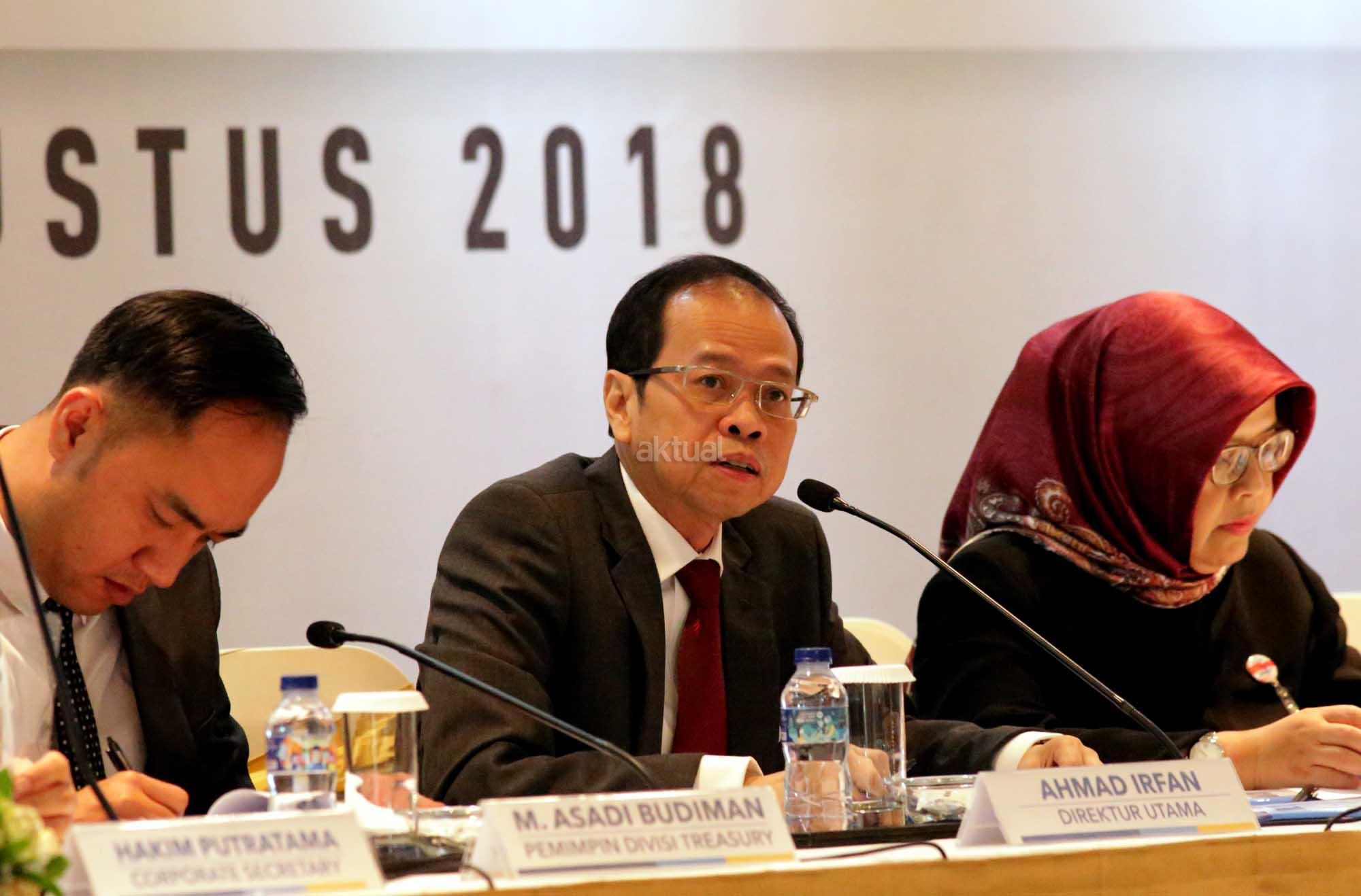Direktur Utama bank bjb Ahmad Irfan (tengah) saat Analyst Meeting Triwulan II Tahun 2018 di Jakarta, Rabu (1/8). Pada Triwulan II tahun 2018 bank bjb berhasil membukukan laba bersih sebesar Rp 903 milyar atau tumbuh sebesar 9,2 % year on year, total aset bank bjb tercatat sebesar Rp 113,4 triliun atau tumbuh sebesar 4,5 % year on year. AKTUAL/Tino Oktaviano