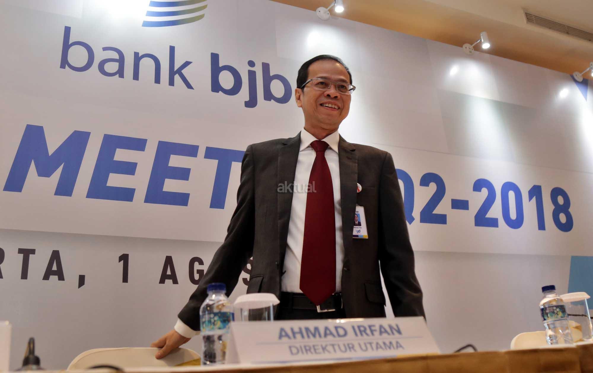 Direktur Utama bank bjb Ahmad Irfan saat Analyst Meeting Triwulan II Tahun 2018 di Jakarta, Rabu (1/8). Pada Triwulan II tahun 2018 bank bjb berhasil membukukan laba bersih sebesar Rp 903 milyar atau tumbuh sebesar 9,2 % year on year, total aset bank bjb tercatat sebesar Rp 113,4 triliun atau tumbuh sebesar 4,5 % year on year. AKTUAL/Tino Oktaviano