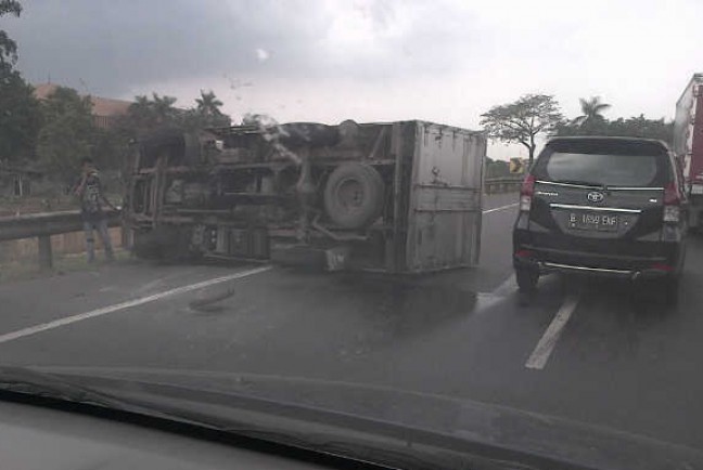 Jakarta, Aktual.co —Kecelakaan lalu lintas terjadi di Tol Pondok Gede Arah Bekasi. Sebuah truk boks berukuran sedang terbalik.