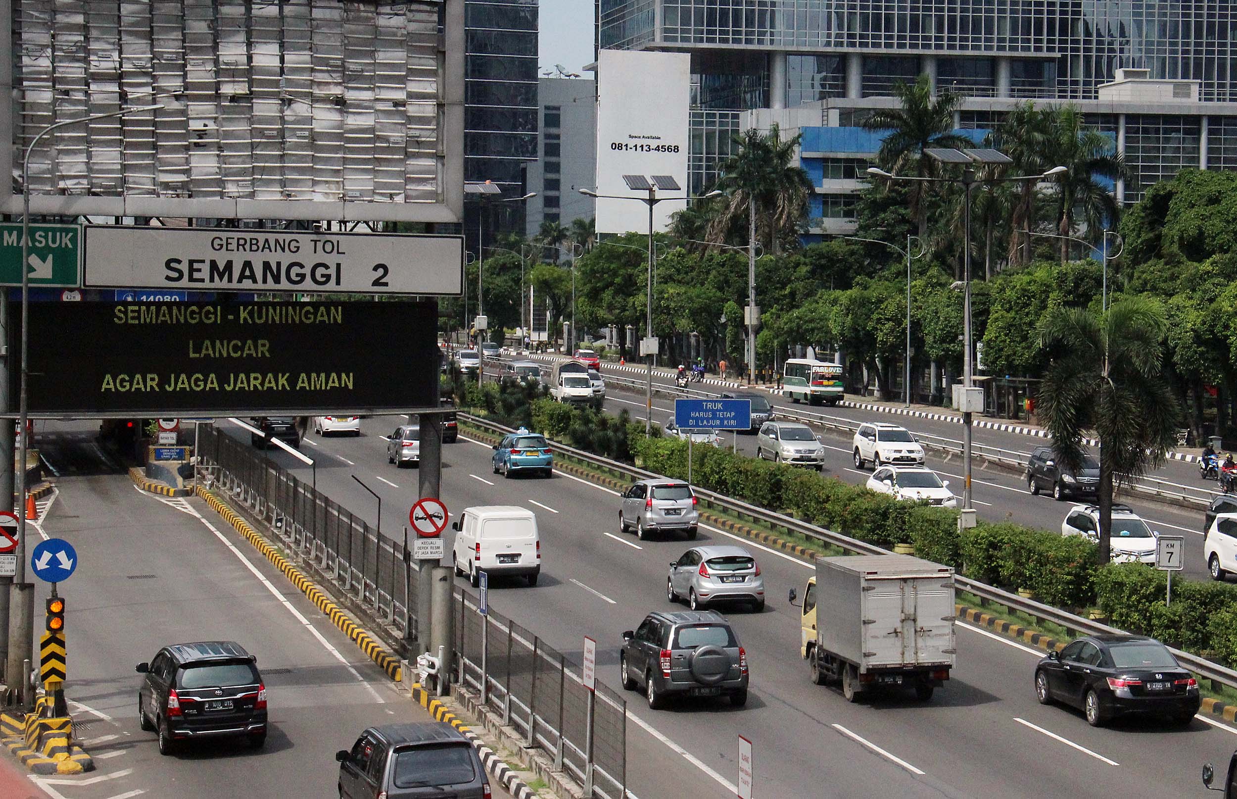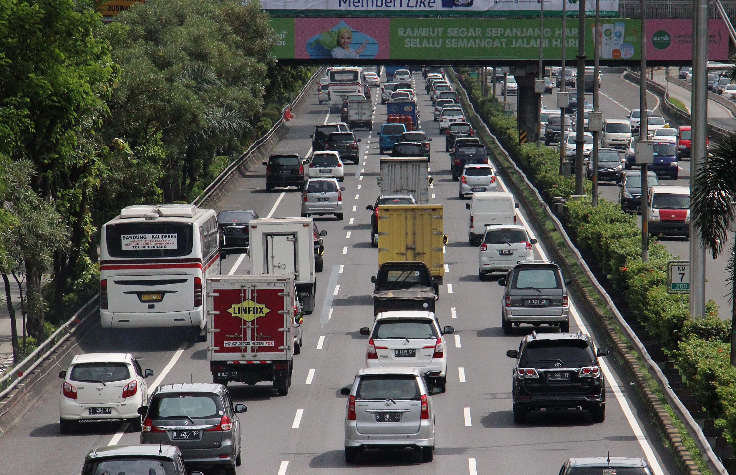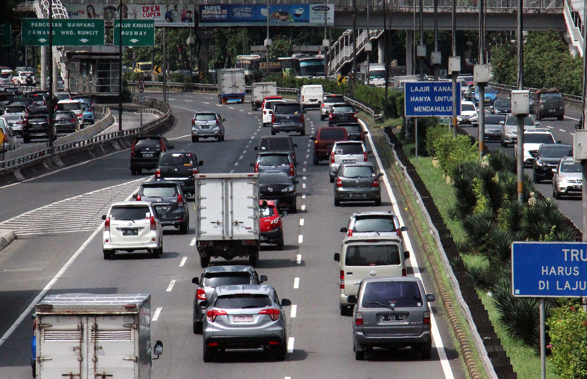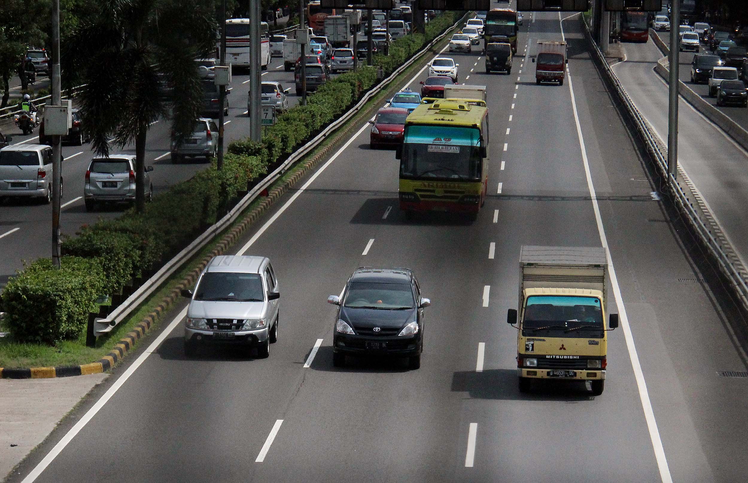 Sejumlah truk melintas di tol dalam Kota Jalan.Gatot Soebroto, Jakarta, Rabu (29/6/2016). Per 1 Juli truk dan trailer dilarang melintasi jalur tol selama 10 hari hal ini untuk meminimalisir kemacetan saat arus mudik.