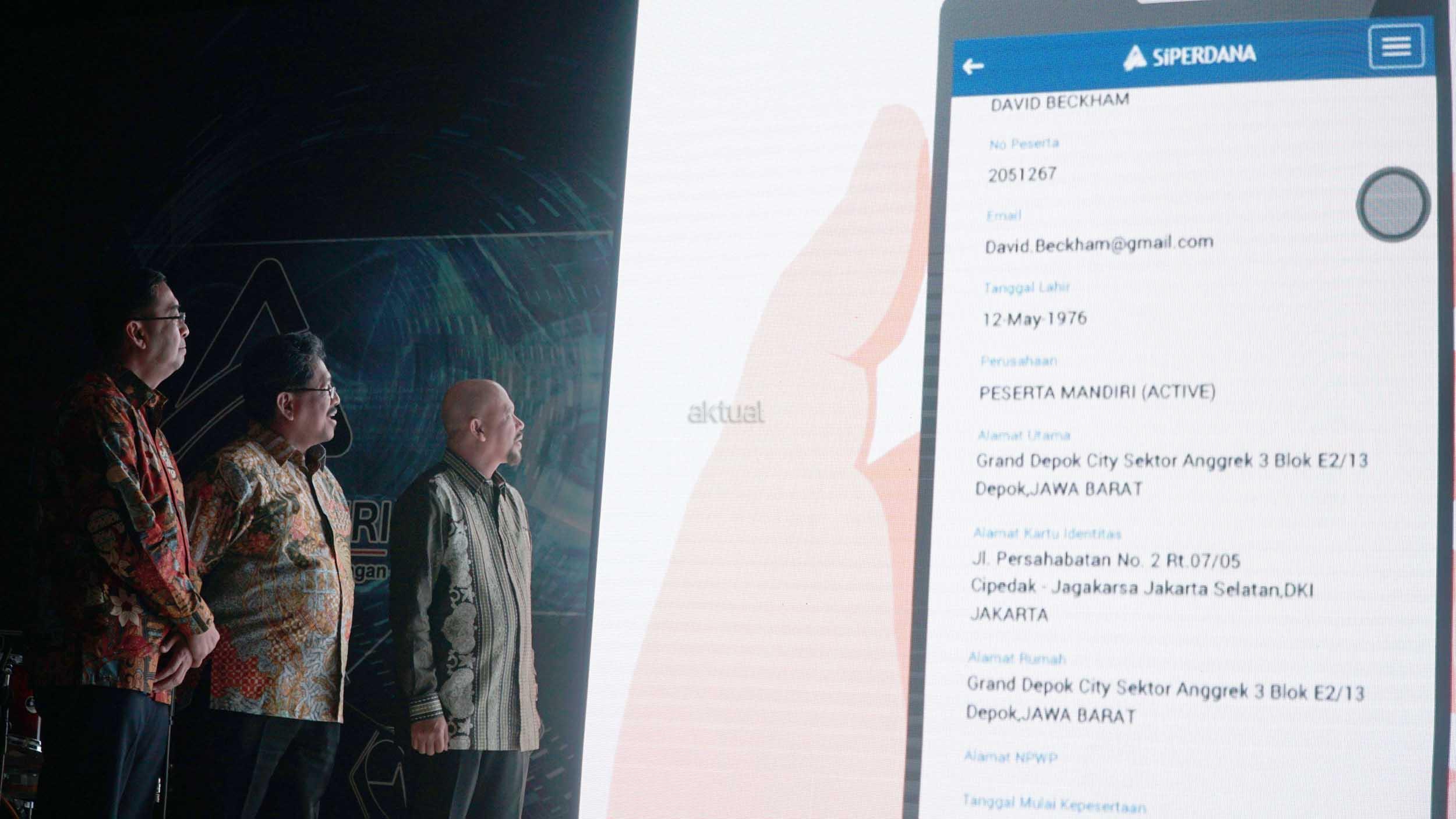 Komisaris Utama PT Asuransi Jiwa Tugu Mandiri Hammam Riza Yusuf (kanan), Direktur Utama Tugu Mandiri Donny J Subakti (tengah), Direktur Keuangan dan Investasi Daneth Fitrianto (kiri) saat meluncurkan Mobile Aplication SIPerdana (System Informasi Peserta Dana Pensiun) PT Asuransi Jiwa Tugu Mandiri di Jakarta, Rabu (28/3). Aplikasi tersebut merupakan sebagai satu-satunya system layanan informasi berbasis web di industry Dana Pensiun Indonesia yang mampu menyajikan informasi saldo dan status kepesertaan secara real time 24 jam sehari 7 hari seminggu, acara peluncuran bertepatan dengan perayaan Hari Ulang Tahun Dana Pensiun Lembaga Keuangan Tugu Mandiri yang ke-25. AKTUAL/Eko S Hilman