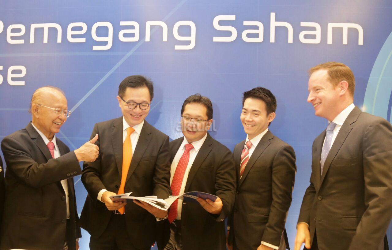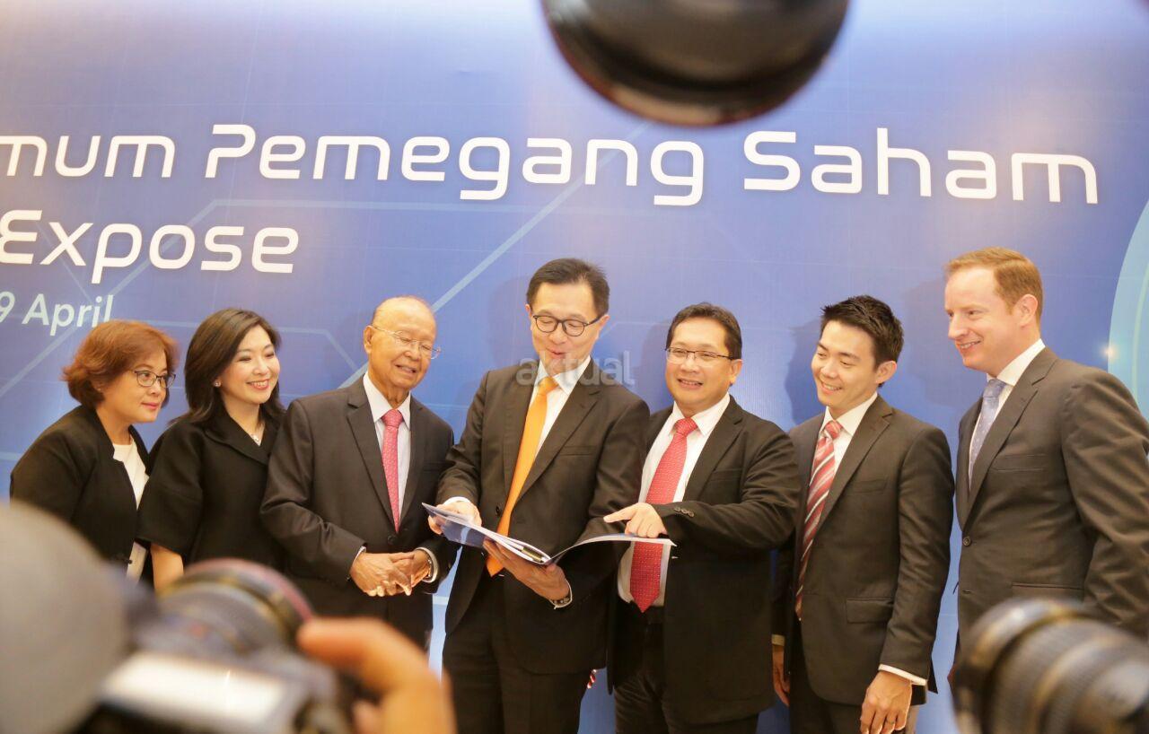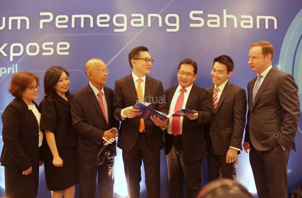 Direktur Utama PT Tunas Ridean Rico Adisurja Setiawan (tengah) berbincang dengan Direktur Tan Fony Salim, Direktur Tenny Febyana Halim, Wakil Komisaris Utama/Independen Cosmas Batubara, Direktur Nugraha Indra Permadi, Direktur Kent Teo dan Komisaris Haslam Preeston (kiri ke kanan) usai menggelar Rapat Umum Pemegang Saham Tahunan PT Tunas Ridean di Jakarta, Kamis (19/4). RUPST menyetujui penggunaan laba bersih Perseroan untuk tahun keuangan yang berakhir 31 Desember 2017 sebesar Rp 475.251.000.000 dibagikan sebagai dividen tunai sebesar Rp 139.500.000.000 atas sebesar Rp 25 per saham. AKTUAL/Tino Oktaviano
