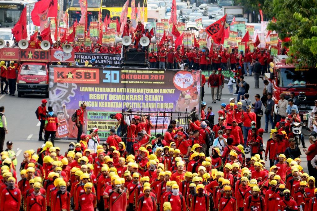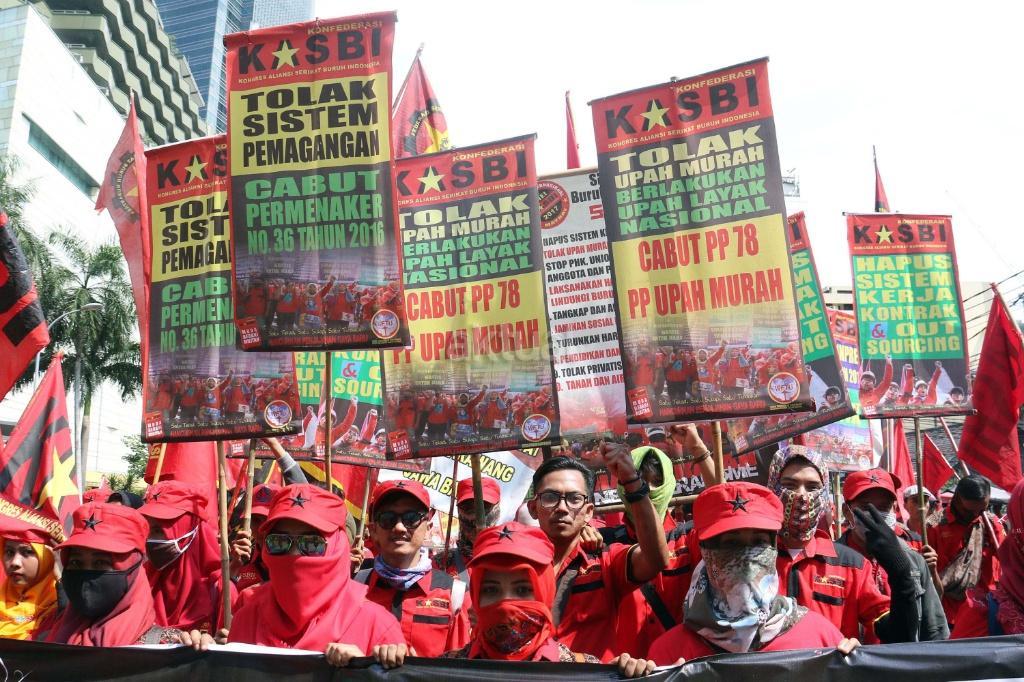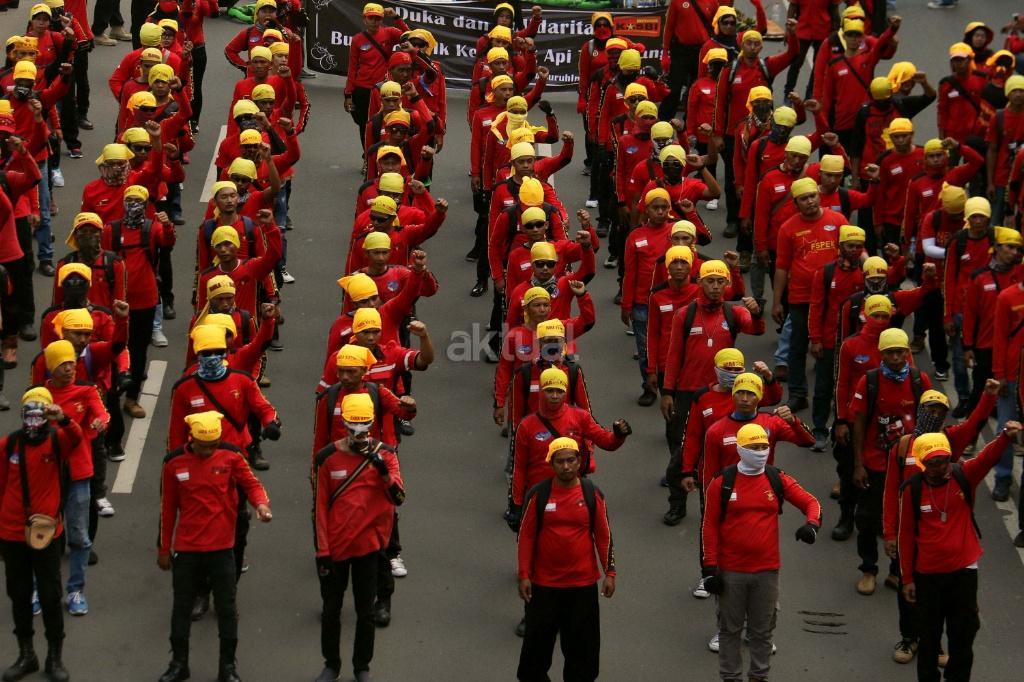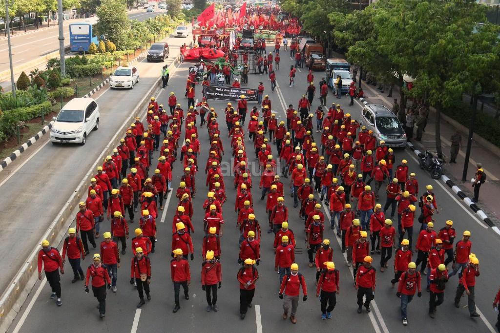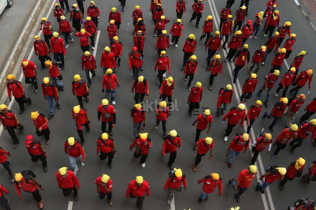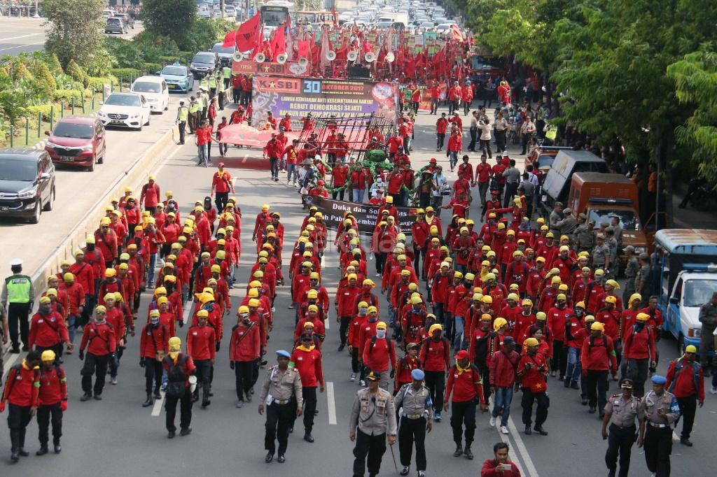 Ribuan buruh yang tergabung Kongres Aliansi Serikat Buruh Indonesia (KASBI) saat melakukan aksi longmarch menuju Istana Merdeka, Jakarta (31/10/2017).Aksi longmarch ribuan buruh menuju Istana Negara, Jakarta ini untuk menuntut penyesuaian kenaikan upah minimum provinsi (UMP) dan mencabut PP Nomor 78 Tahun 2015 tentang Pengupahan. AKTUAL/Munzir