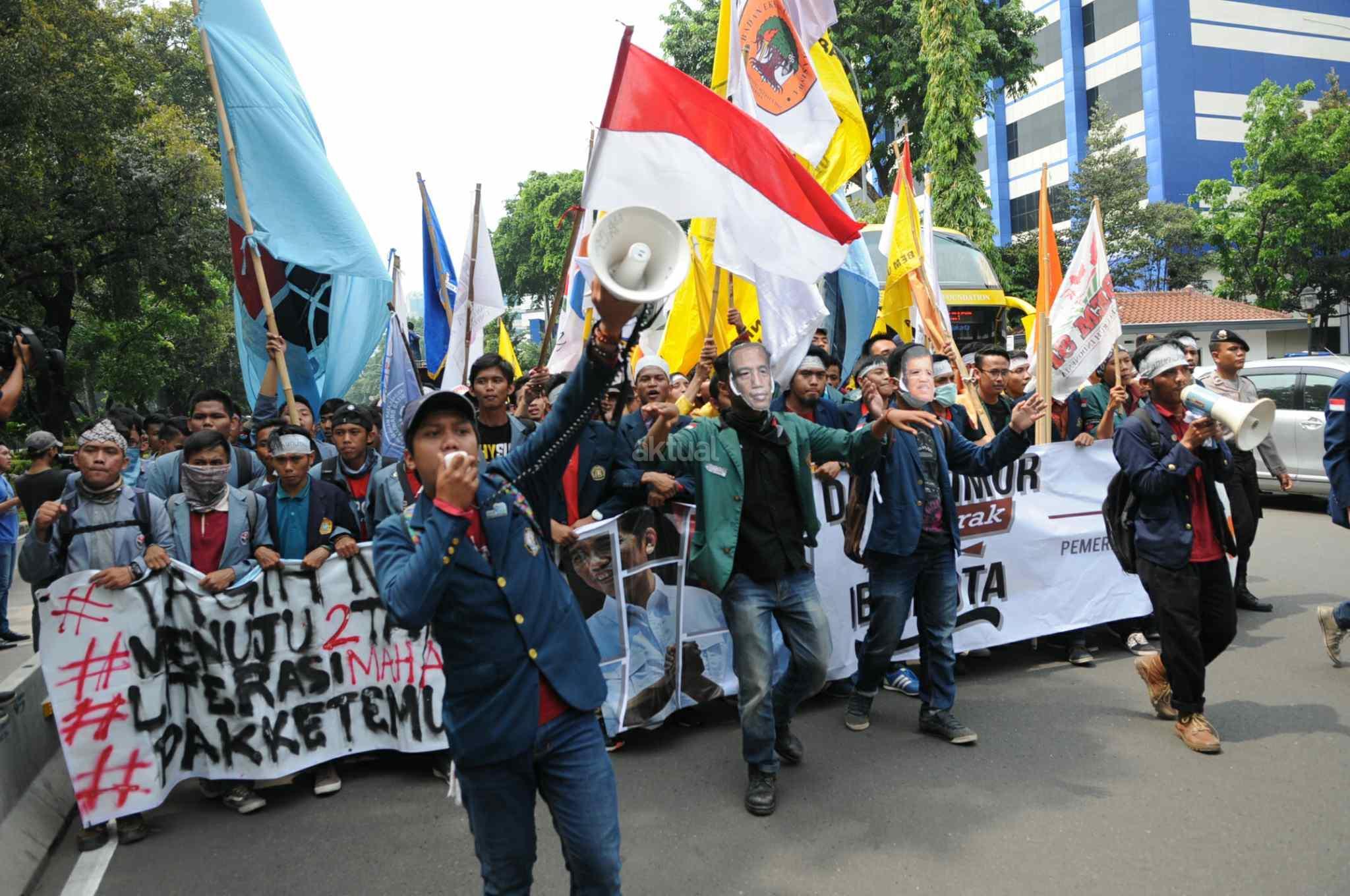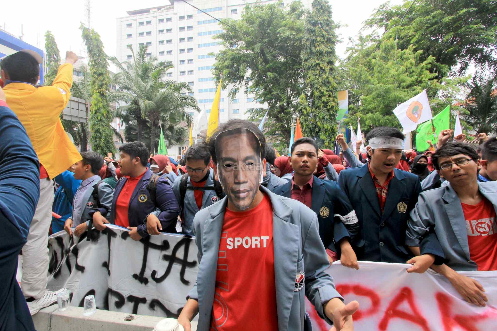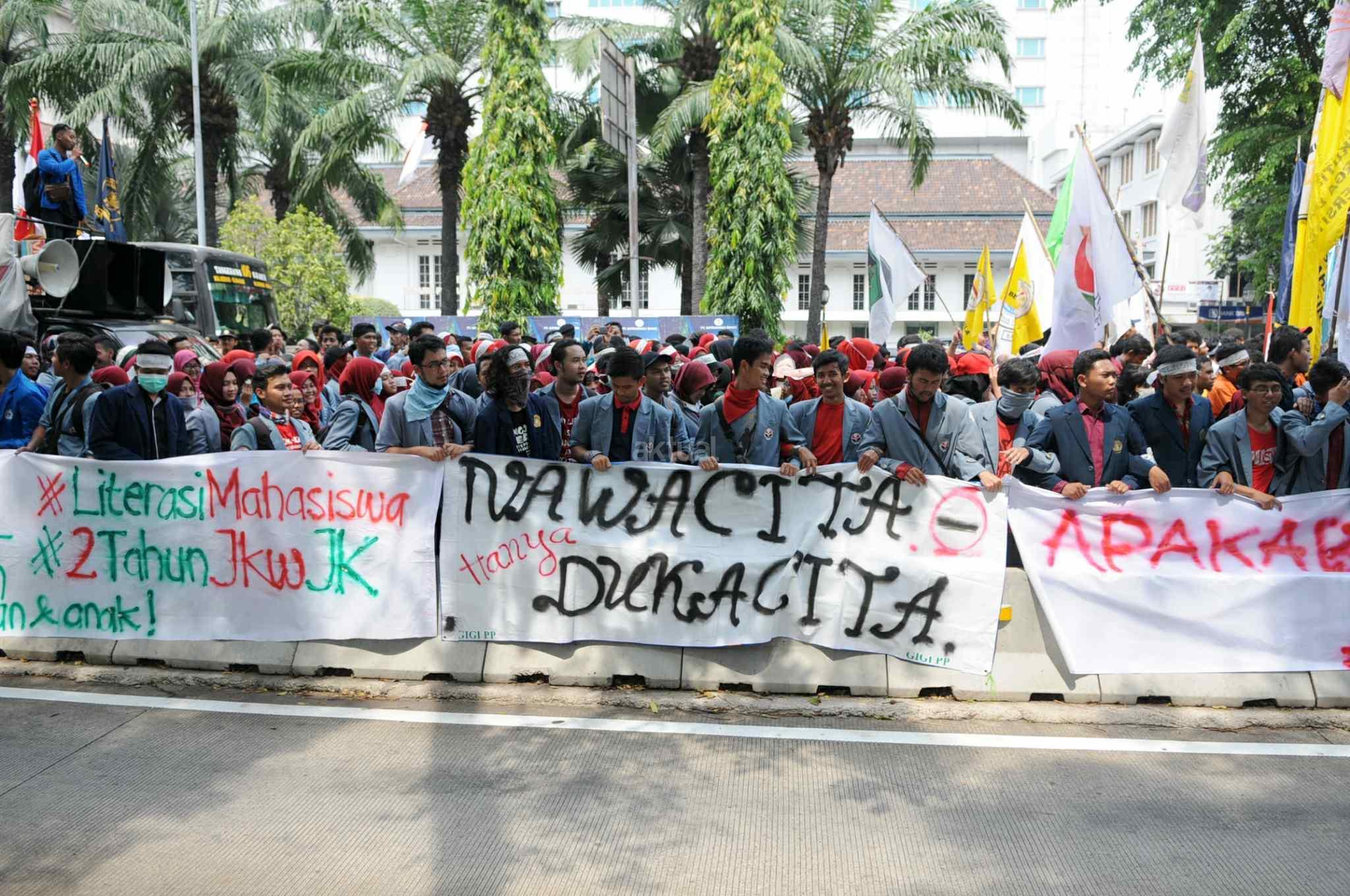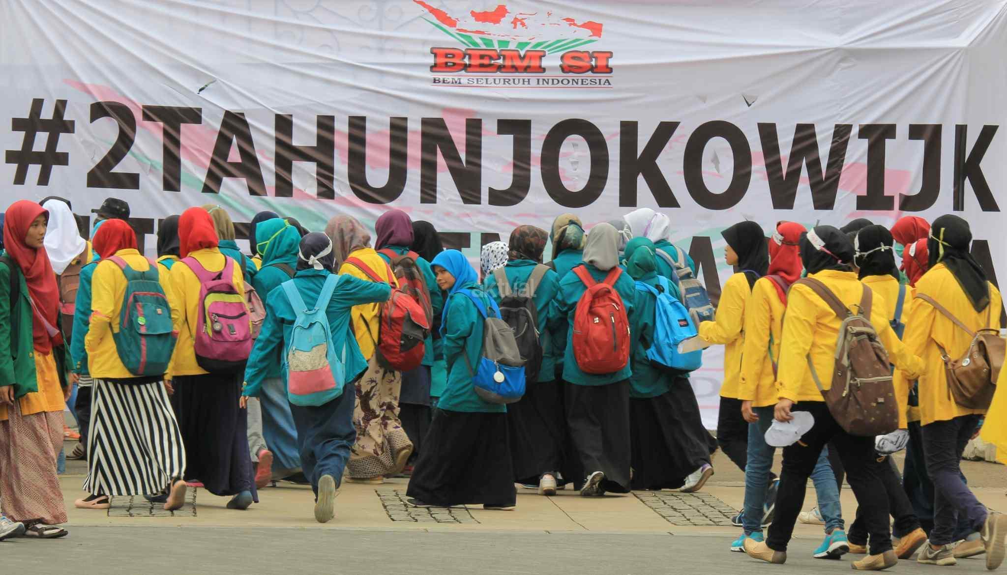 Mahasiswa yang tergabung dalam Aliansi Badan Eksekutif Mahasiswa Seluruh Indonesia (BEM SI) melakukan aksi 2 tahun kepemimpinan Presiden Jokowi-JK di kawasan Istana Negara, Jakarta Pusat, Kamis (20/10). Aksi ini merupakan ajang untuk mengevaluasi, mengkontempelasi, menagih, mendesak, serta menuntut janji-janji pemerintah yang tertuang dalam visi misi serta cita-cita dan tujuan negara itu sendiri. AKTUAL/Tino Oktaviano