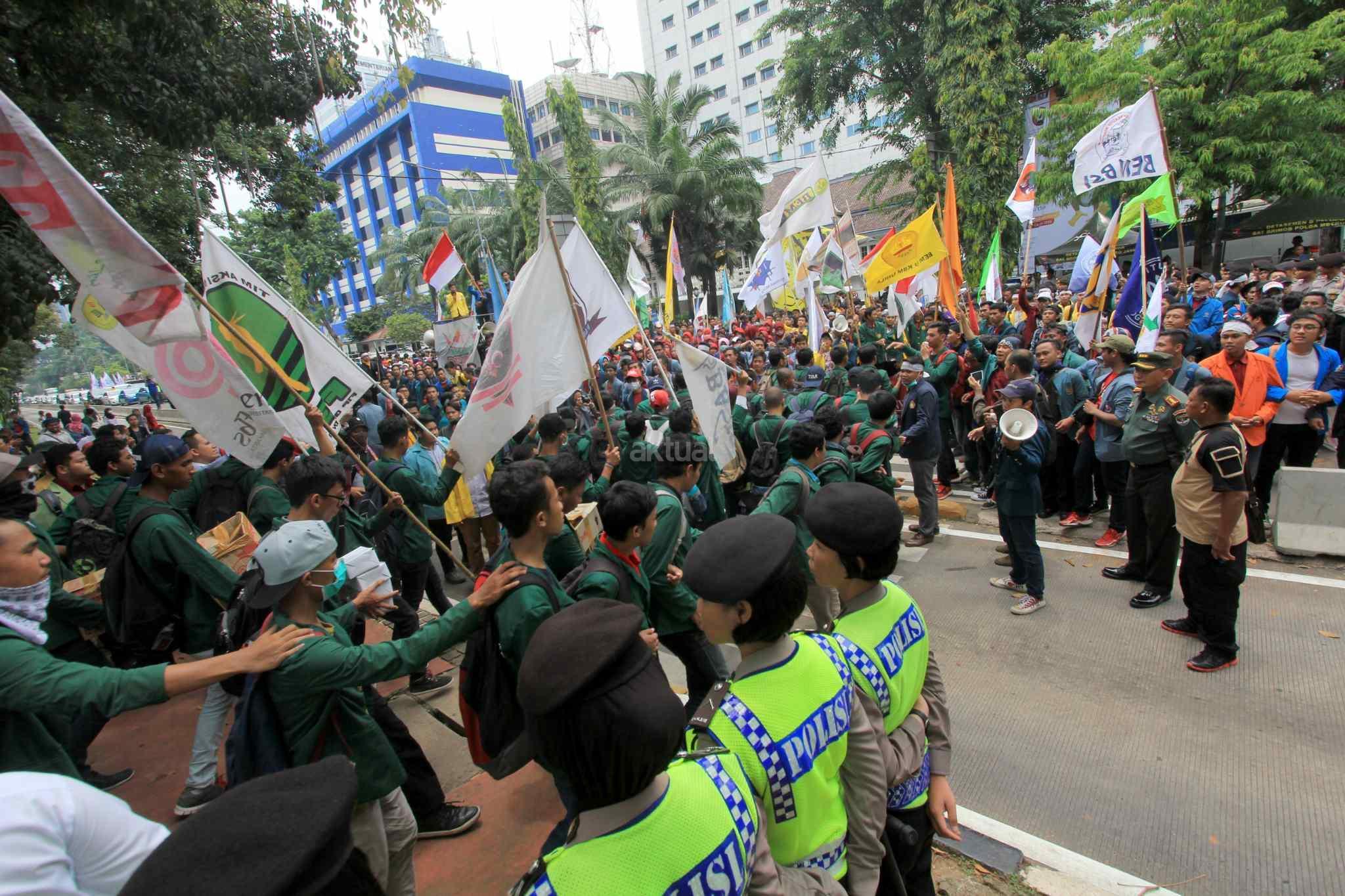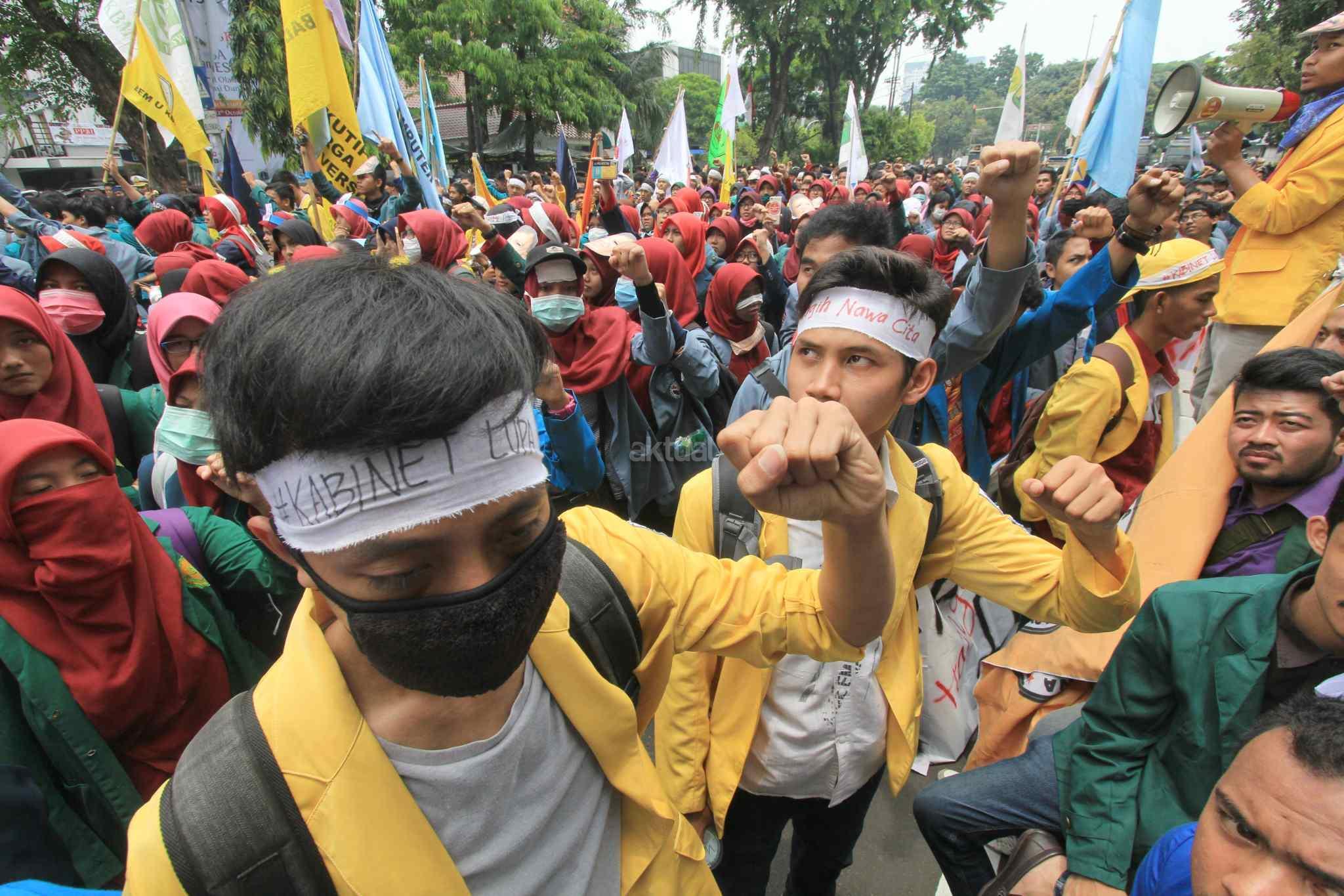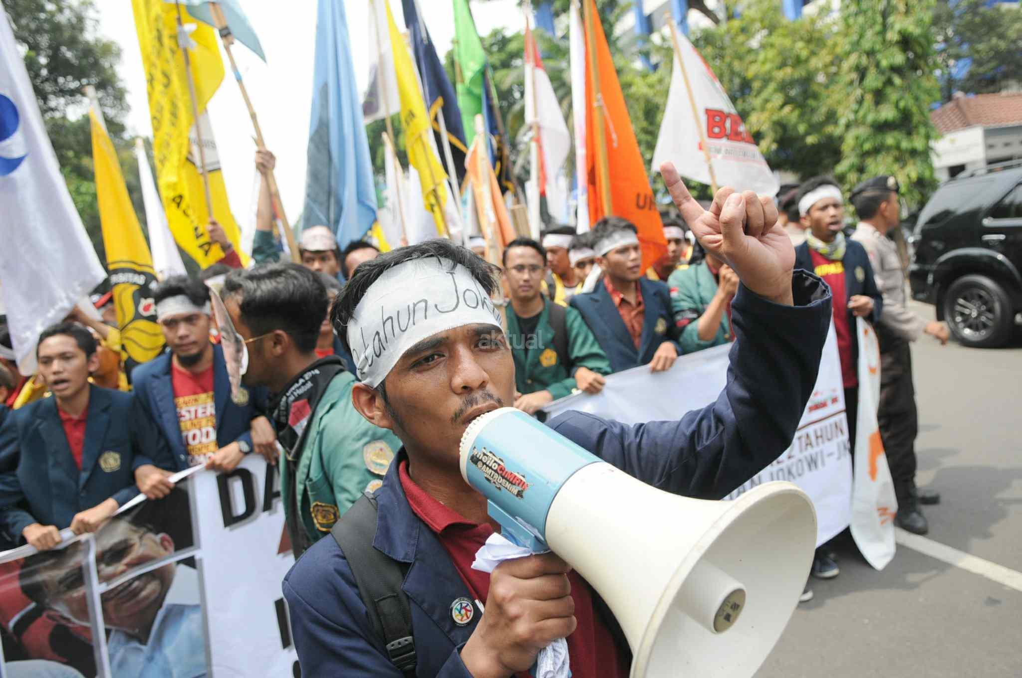Mahasiswa yang tergabung dalam Aliansi Badan Eksekutif Mahasiswa Seluruh Indonesia (BEM SI) melakukan aksi 2 tahun kepemimpinan Presiden Jokowi-JK di kawasan Istana Negara, Jakarta Pusat, Kamis (20/10). Aksi ini merupakan ajang untuk mengevaluasi, mengkontempelasi, menagih, mendesak, serta menuntut janji-janji pemerintah yang tertuang dalam visi misi serta cita-cita dan tujuan negara itu sendiri. AKTUAL/Tino Oktaviano