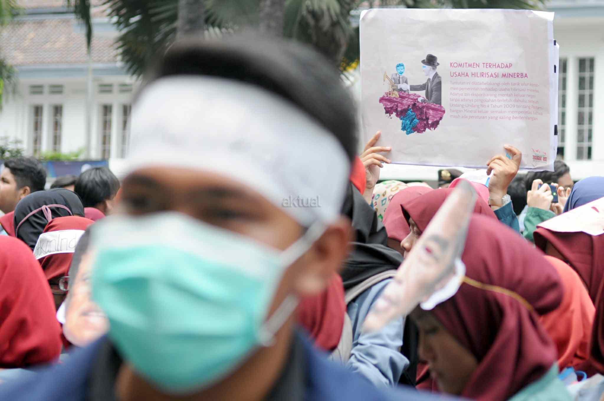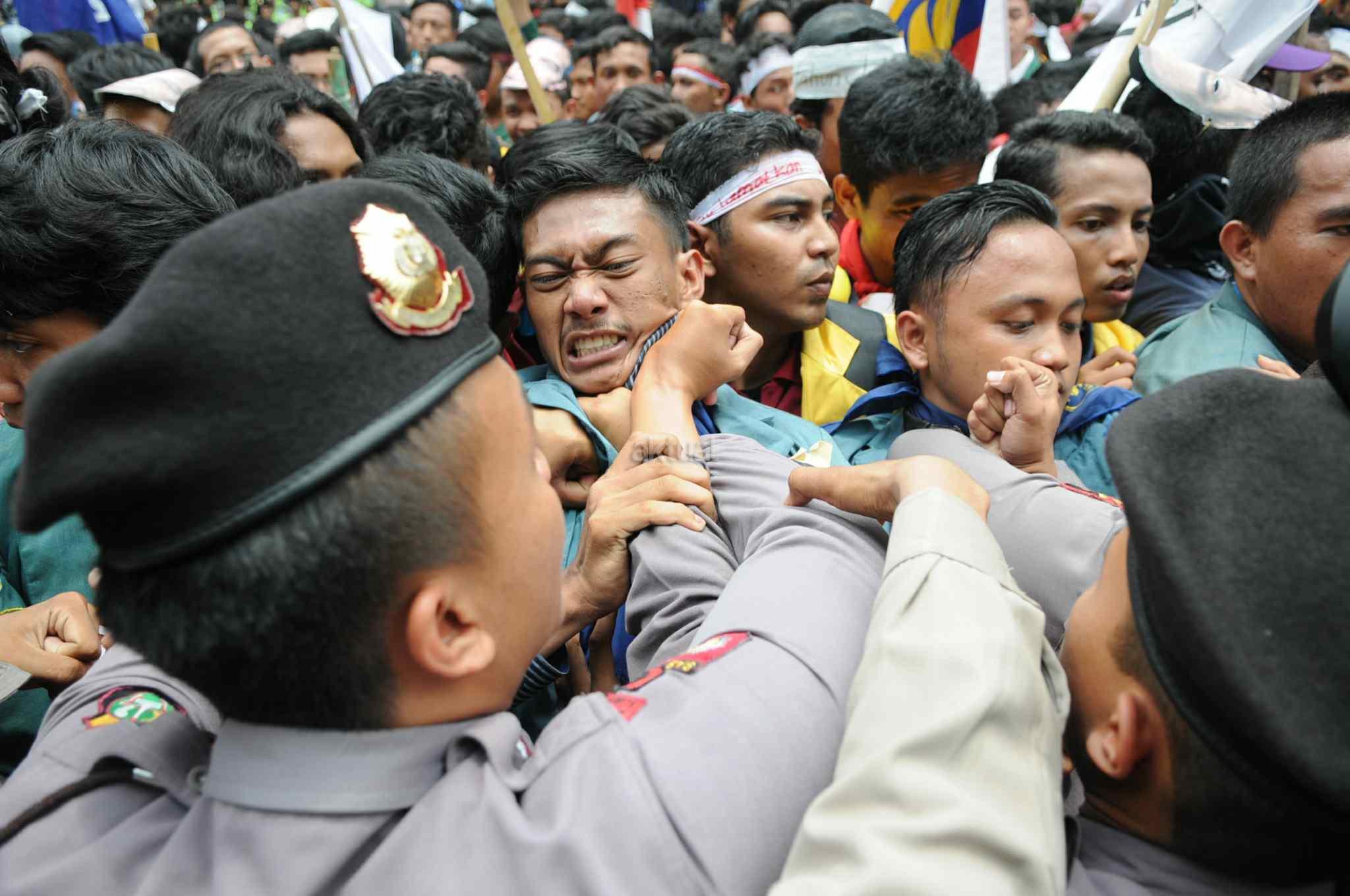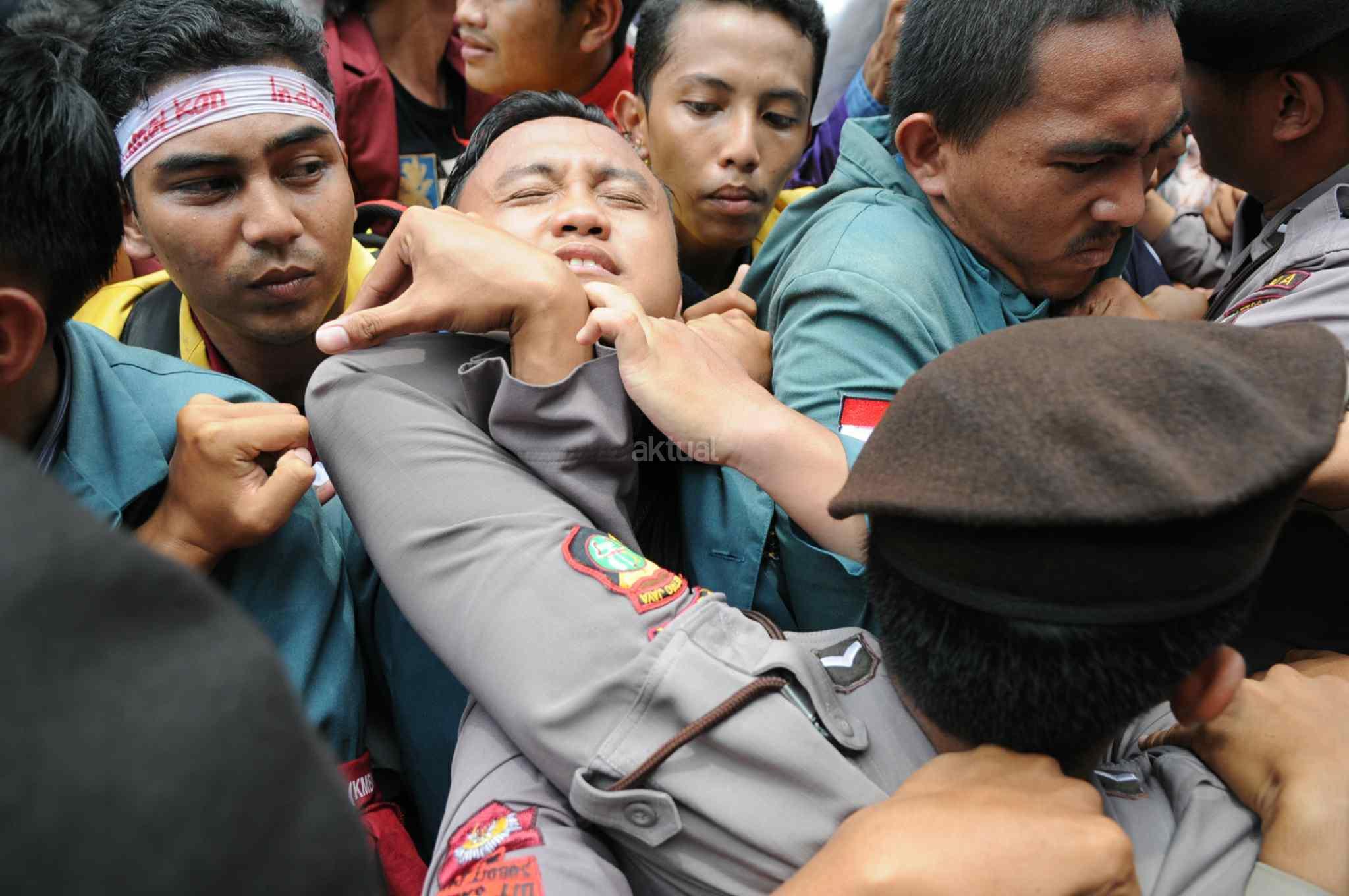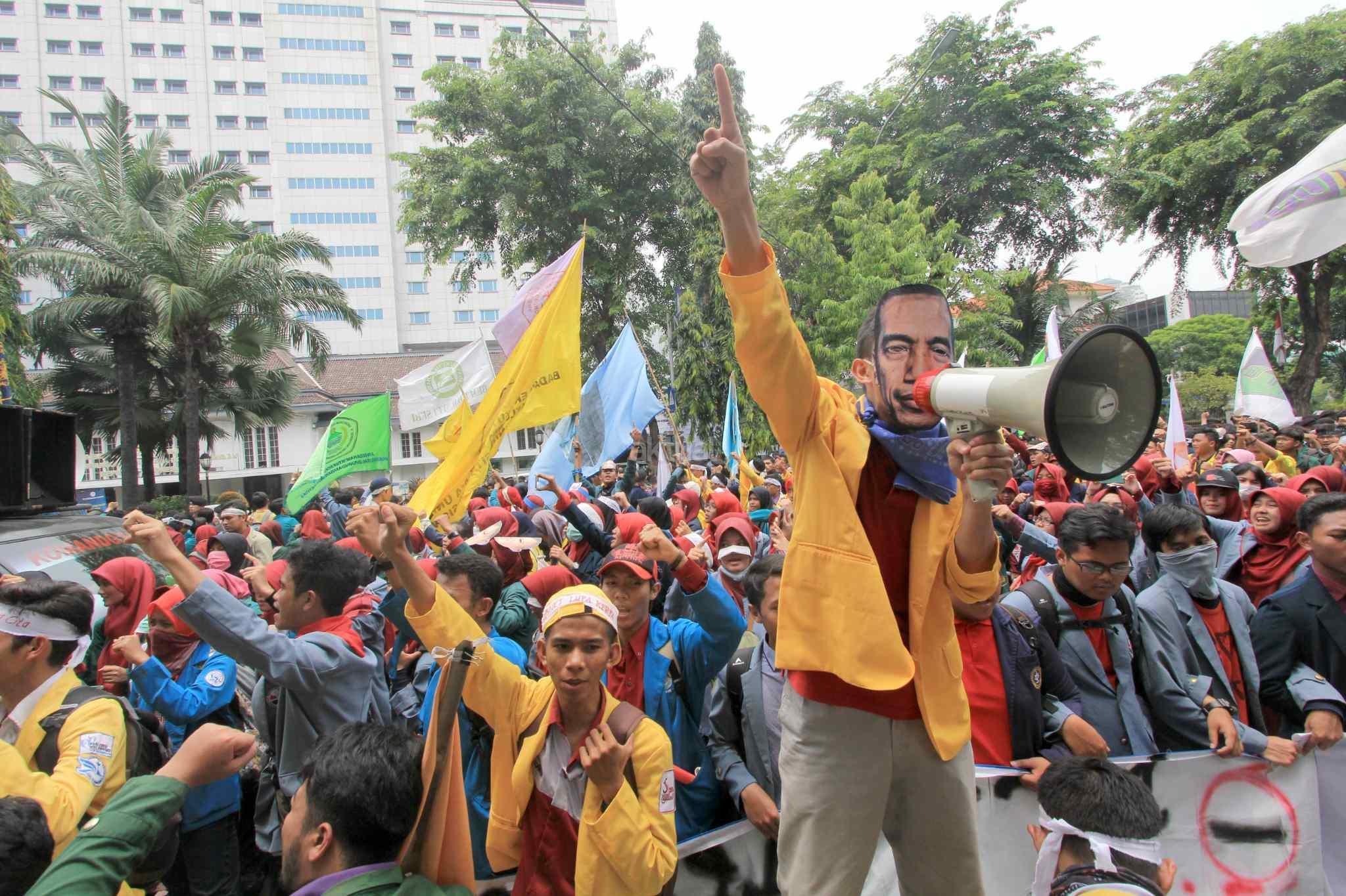 Mahasiswa yang tergabung dalam Aliansi Badan Eksekutif Mahasiswa Seluruh Indonesia (BEM SI) melakukan aksi 2 tahun kepemimpinan Presiden Jokowi-JK di kawasan Istana Negara, Jakarta Pusat, Kamis (20/10). Aksi ini merupakan ajang untuk mengevaluasi, mengkontempelasi, menagih, mendesak, serta menuntut janji-janji pemerintah yang tertuang dalam visi misi serta cita-cita dan tujuan negara itu sendiri. AKTUAL/Tino Oktaviano