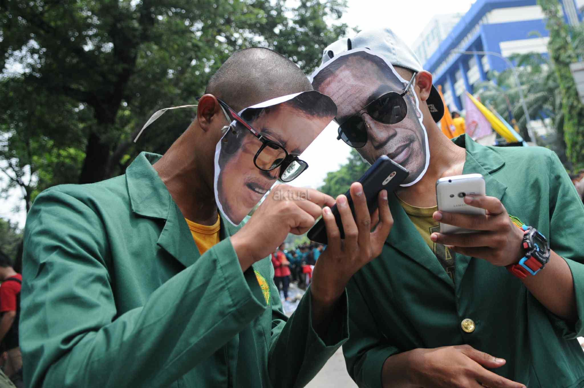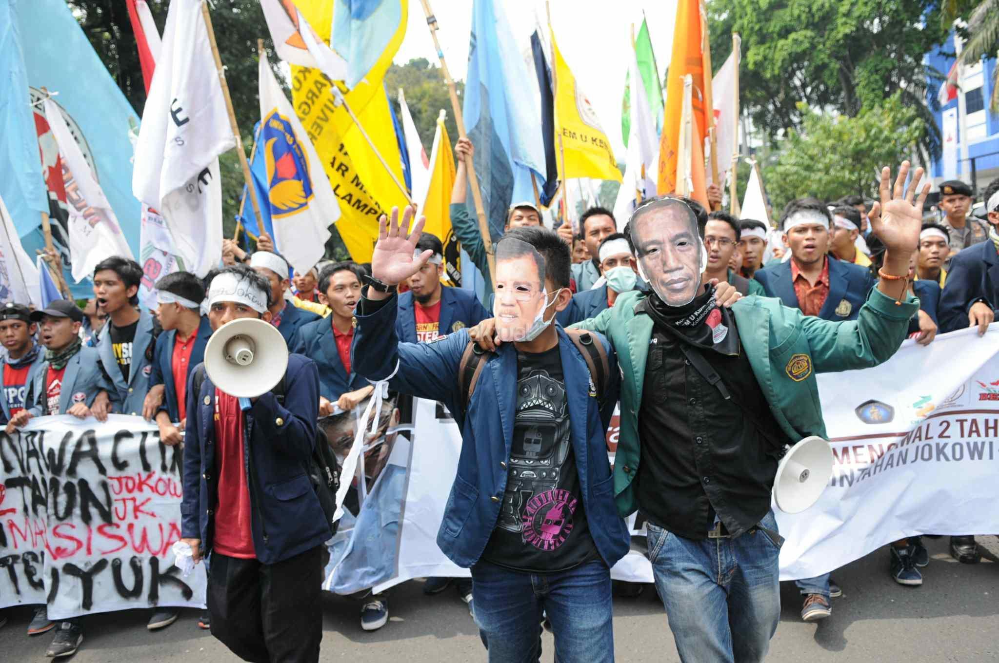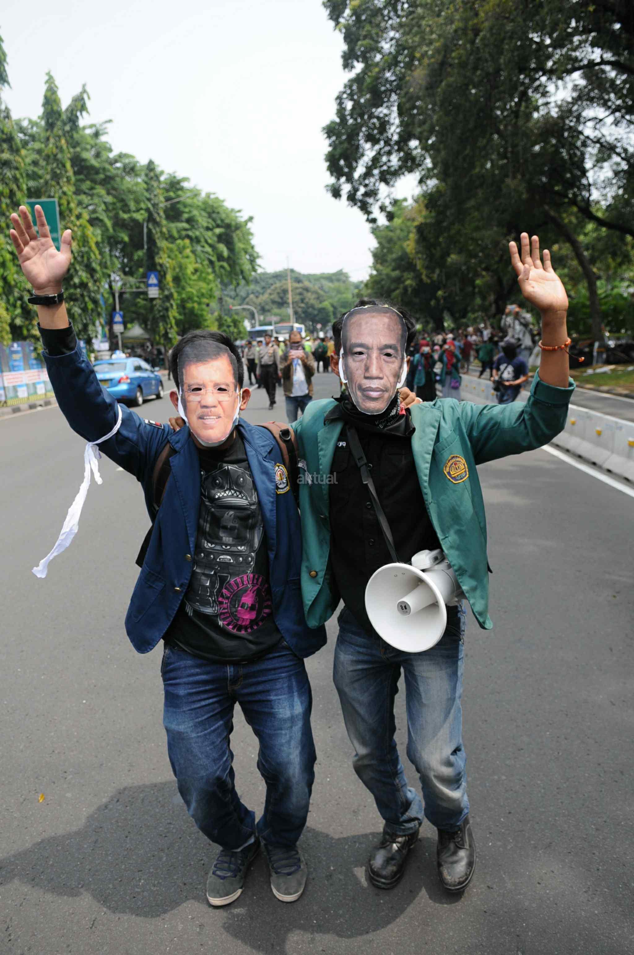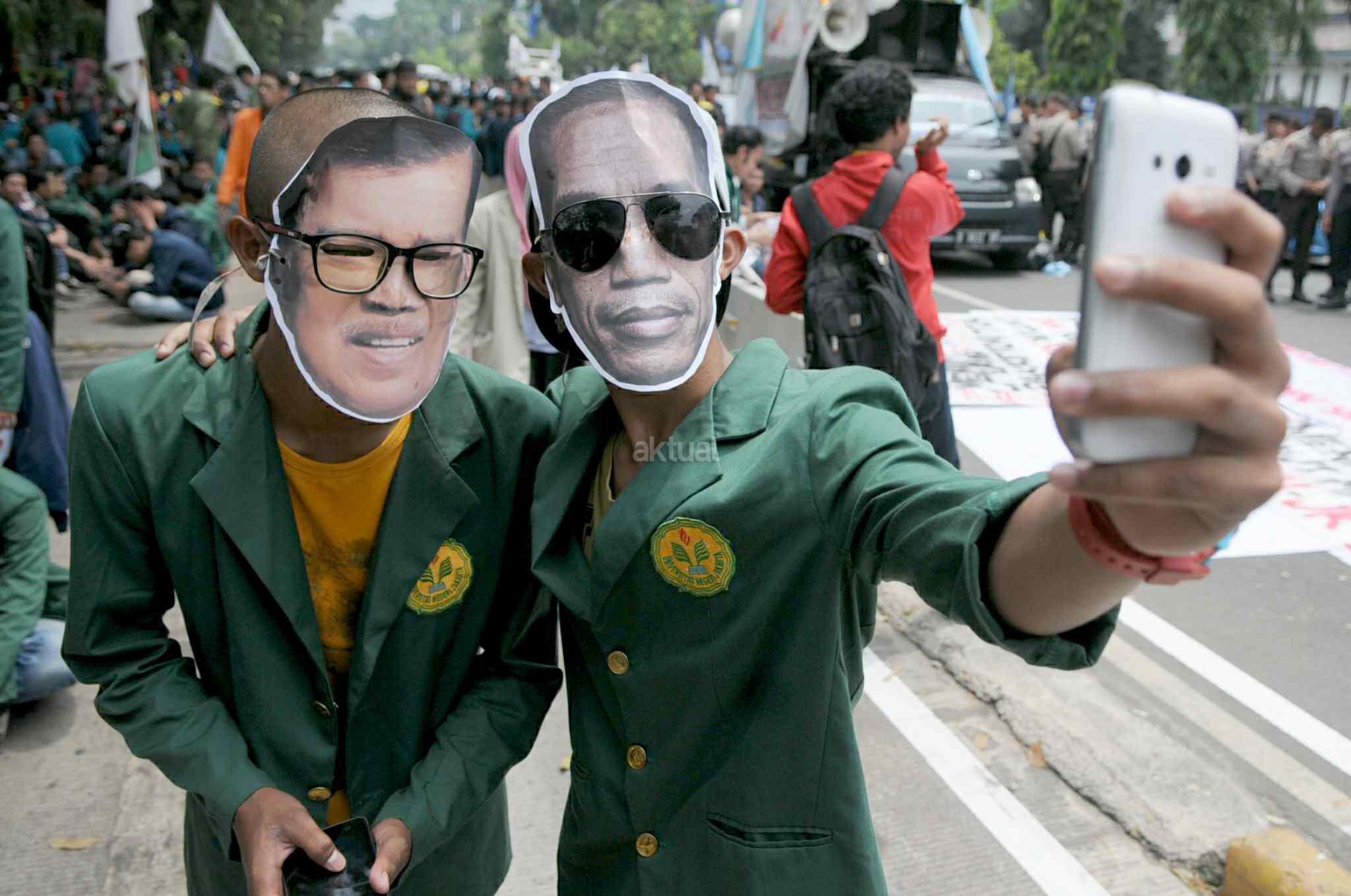 Mahasiswa memakai topeng Jokowi-JK saat melakukan aksi 2 tahun kepemimpinan Presiden Jokowi-JK di kawasan Istana Negara, Jakarta Pusat, Kamis (20/10). Aksi ini merupakan ajang untuk mengevaluasi, mengkontempelasi, menagih, mendesak, serta menuntut janji-janji pemerintah yang tertuang dalam visi misi serta cita-cita dan tujuan negara itu sendiri. AKTUAL/Tino Oktaviano