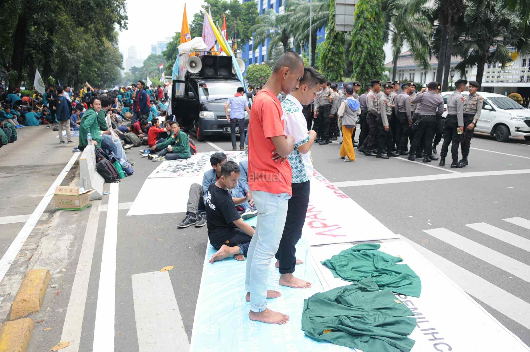 Mahasiswa melaksanakan salat Dzuhur disela aksi 2 tahun Jokowi-JK.
