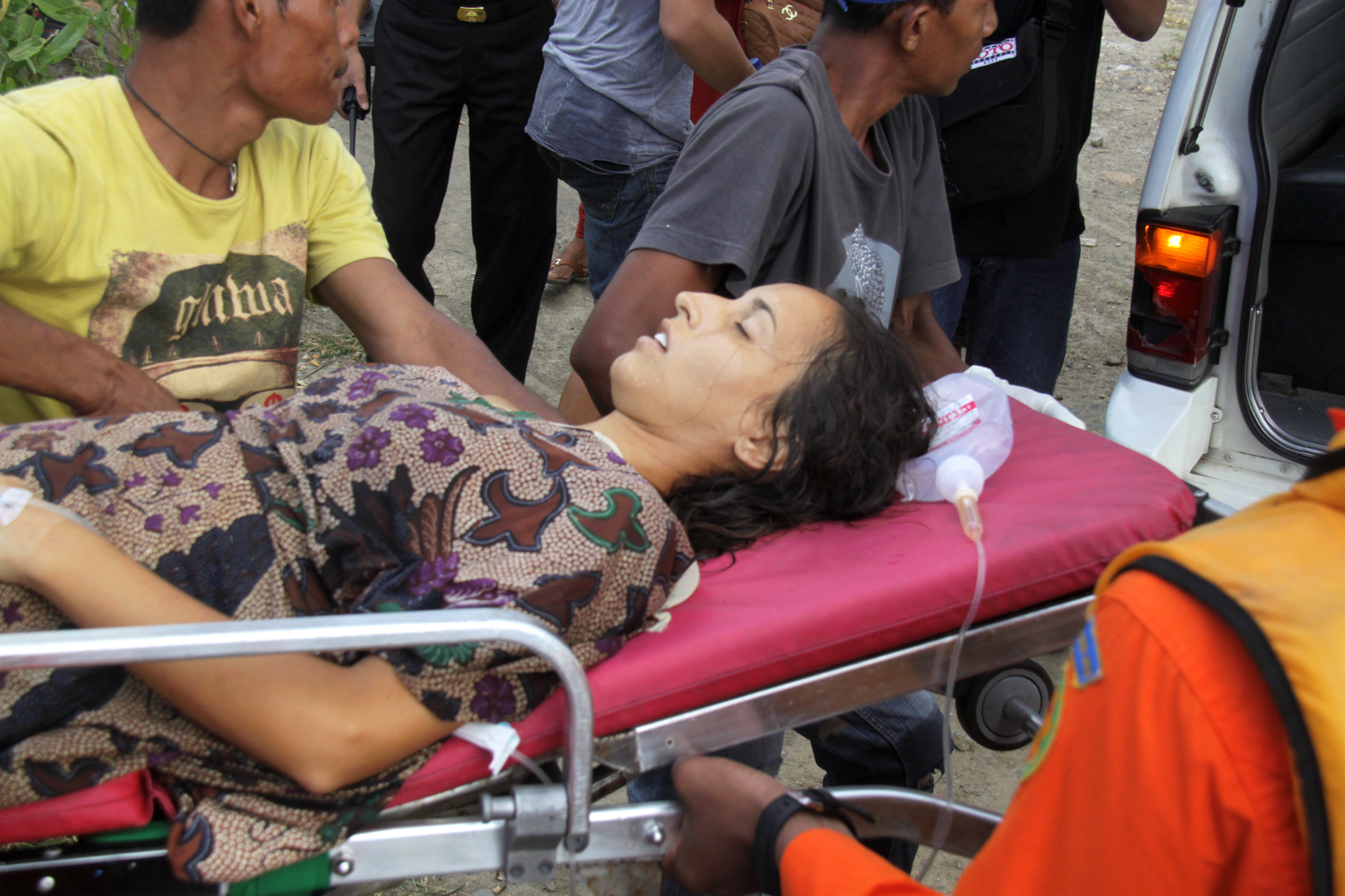 Anggota Basarnas menandu turis Argentina, Lusia (31) korban tabrak kapal motor saat dievakuasi di pelabuhan Ulee Lheue, Banda Aceh, Sabtu (16/7). Wisatawan Argentina, Lusia mengalami luka serius pada kaki akibat ditabrak kapal motor saat melakukan snorkeling di Pulau Ribiah, Sabang, Aceh, ia kemudian dievakuasi ke Banda Aceh untuk mendapat perawatan intensif di Rumah Sakit Umum Zainal Abidin. ANTARA FOTO/Ampelsa/ama/16