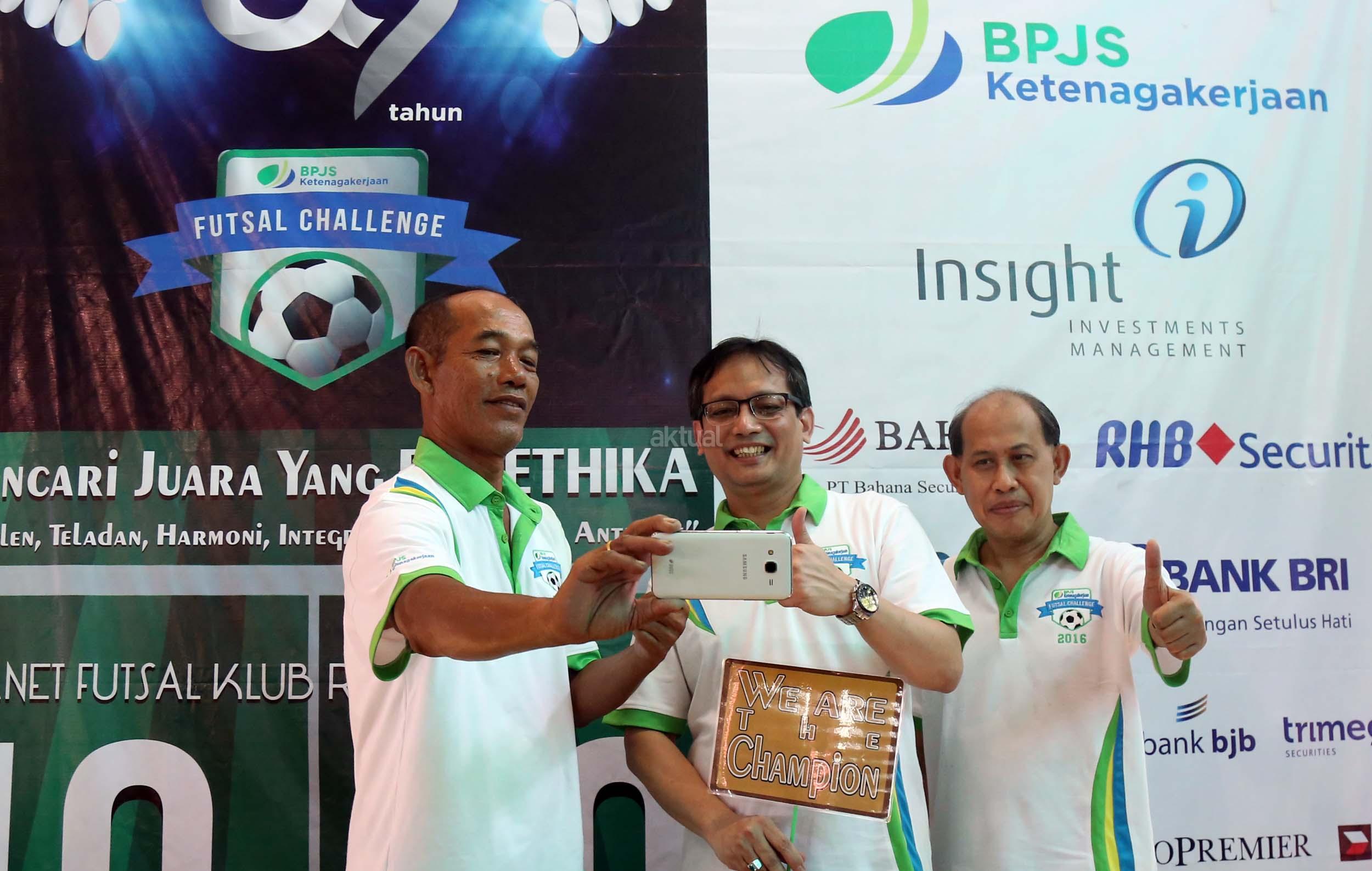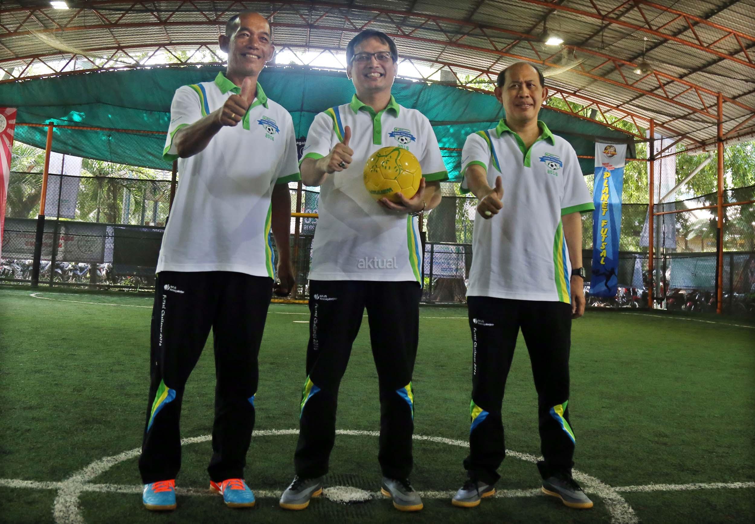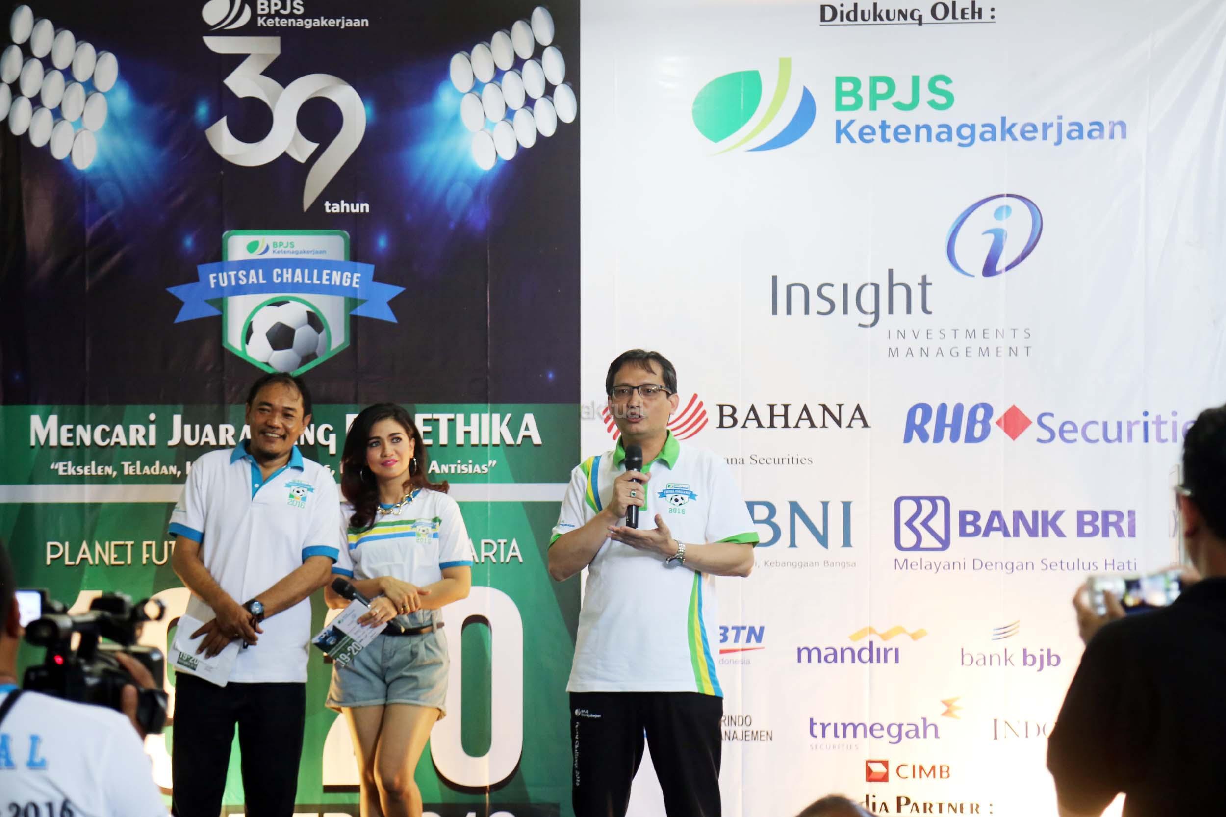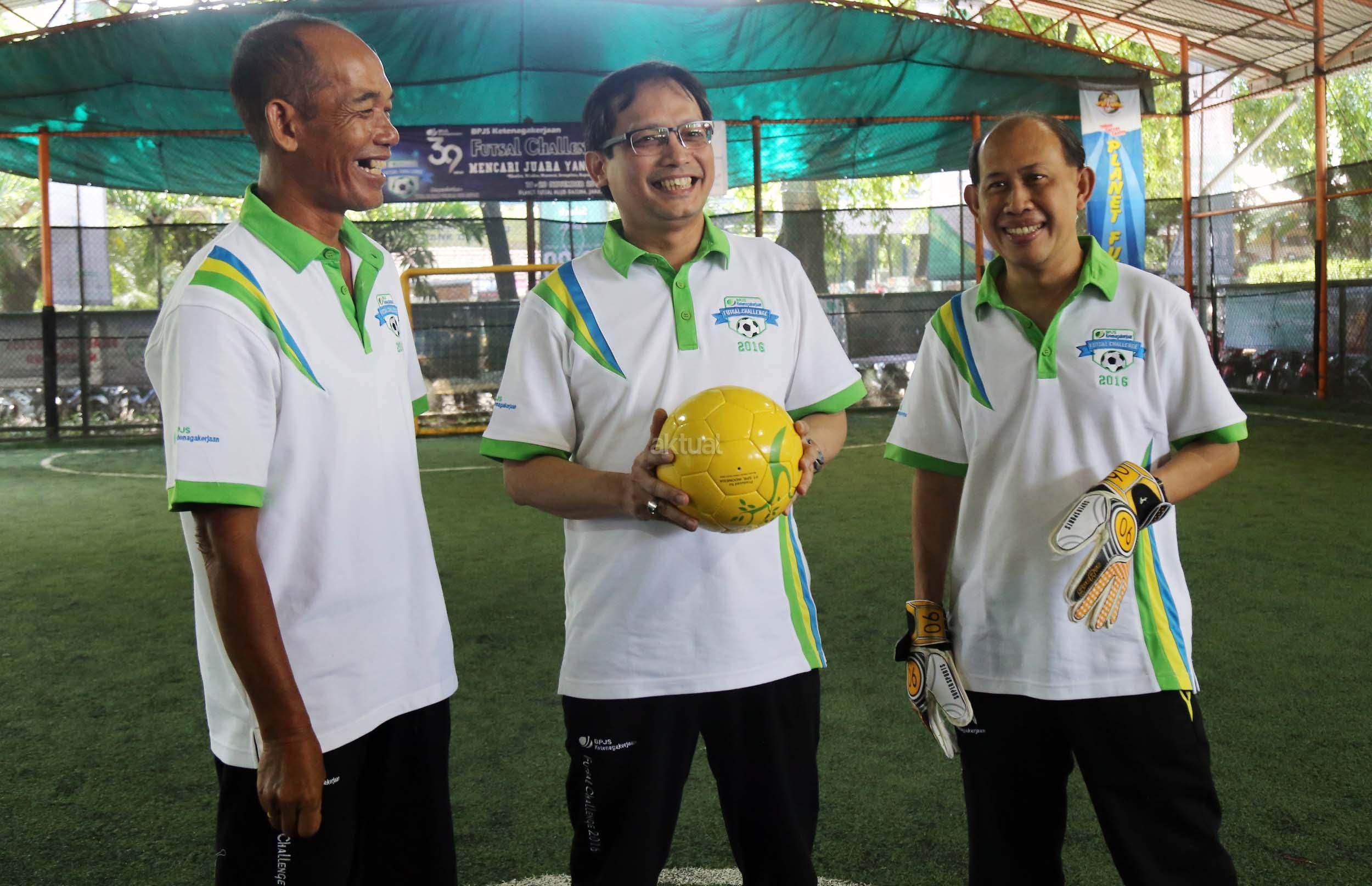 Dari kiri ke kanan, Ketua Badan Penyelenggara Jaminan Sosial (BPJS) Ketenagakerjaan Journalist Club, Ridwan Max Sijabat, Direktur Umum dan SDM BPJS Ketenagakerjaan, Nauval Mahfudz dan Kadiv Komunikasi BPJS Ketenagakerjaan Abdul Latief berbincang saat pembukaan Turnamen Futsal BFC 2016 di Jakarta, Sabtu (19/11). Turnamen dalam rangka memeriahkan ulang tahun BPJS Ketenagakerjaan ke-39 tahun ini merupakan penyelenggaraan turnamen tahun yang ke-7. Puncak acara HUT tersebut akan jatuh pada tanggal 5 Desember mendatang. AKTUAL/Tino Oktaviano