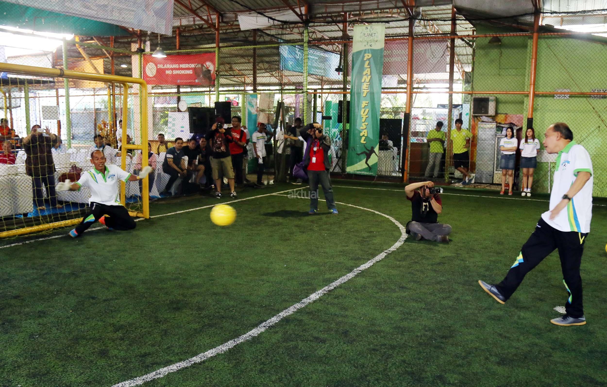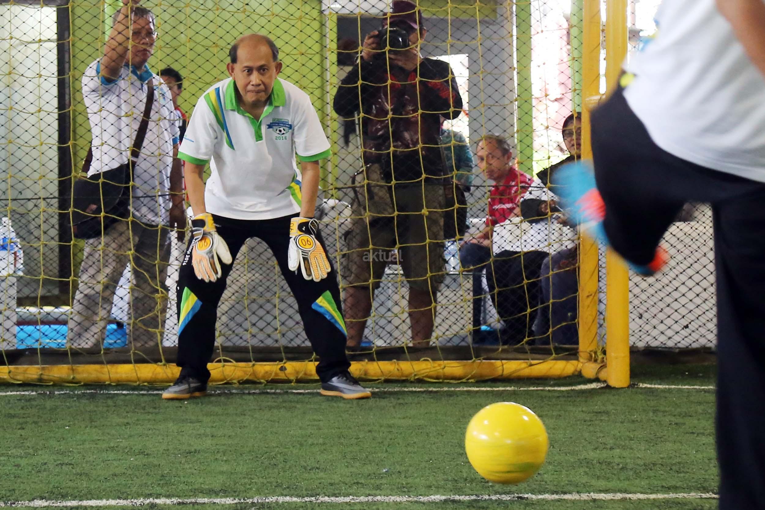 Kadiv Komunikasi BPJS Ketenagakerjaan Abdul Latief menjaga gawang saat prosesi pembukaan Turnamen Futsal BFC 2016 di Jakarta, Sabtu (19/11). Turnamen dalam rangka memeriahkan ulang tahun BPJS Ketenagakerjaan ke-39 tahun ini merupakan penyelenggaraan turnamen tahun yang ke-7. Puncak acara HUT tersebut akan jatuh pada tanggal 5 Desember mendatang. AKTUAL/Tino Oktaviano