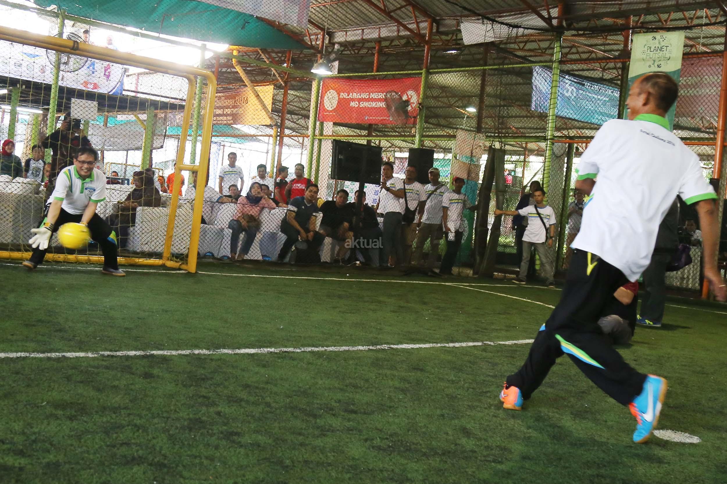 Direktur Umum dan SDM BPJS Ketenagakerjaan, Nauval Mahfudz menjaga gawang saat prosesi pembukaan Turnamen Futsal BFC 2016 di Jakarta, Sabtu (19/11). Turnamen dalam rangka memeriahkan ulang tahun BPJS Ketenagakerjaan ke-39 tahun ini merupakan penyelenggaraan turnamen tahun yang ke-7. Puncak acara HUT tersebut akan jatuh pada tanggal 5 Desember mendatang. AKTUAL/Tino Oktaviano