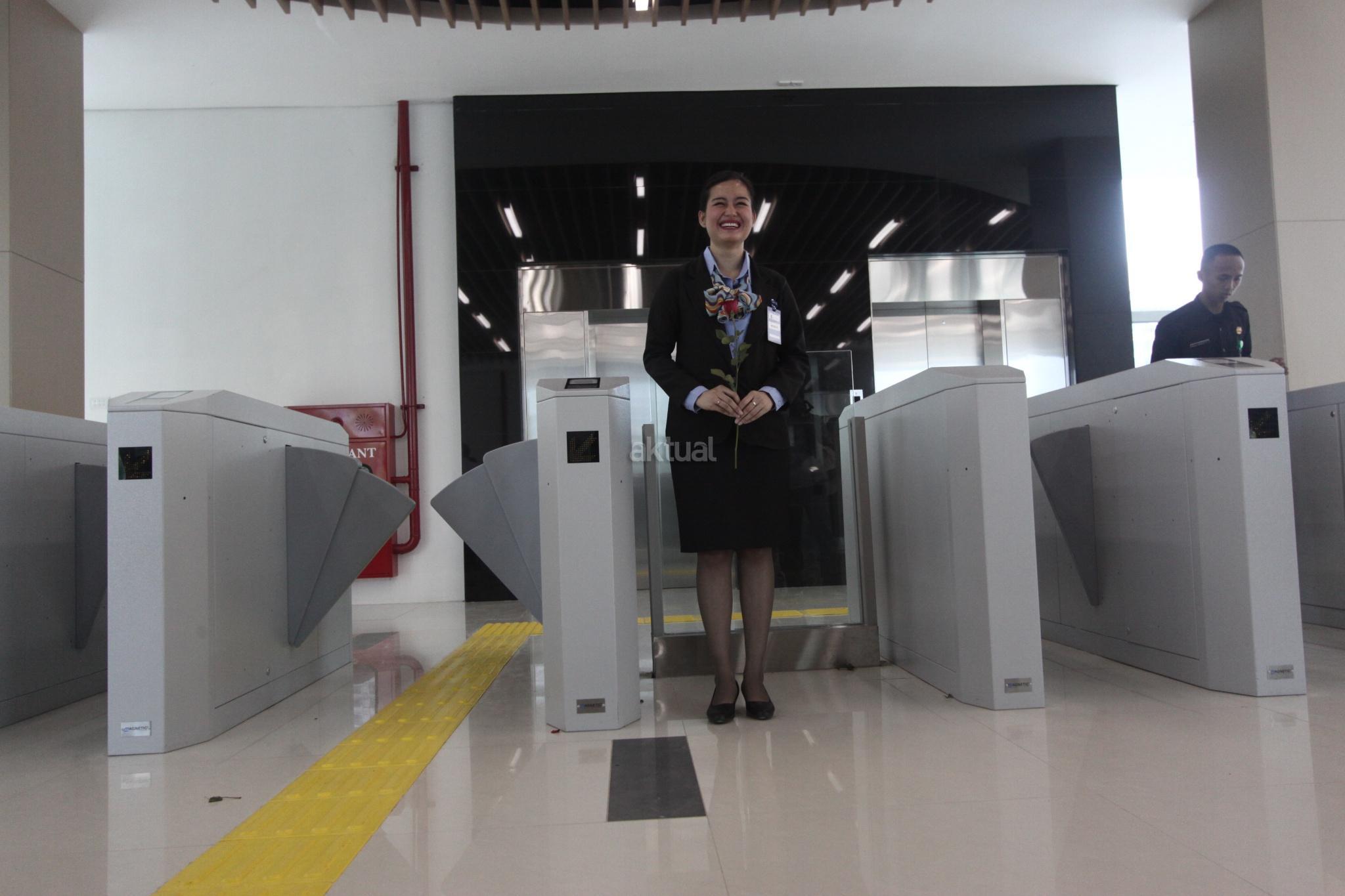 Petugas menunggu di pintu masuk pelayanan tiket masuk ke peron kereta bandara di Stasiun Sudirman Baru, Jakarta Pusat, Selasa (26/12/2017). Uji coba kereta bandara Soekarno-Hatta dibuka hari ini sampai tanggal 1 Januari di jadwalkan beroperasi dari Stasiun Sudirman Baru mulai pukul 03.47 WIB – 21. 47 WIB dan dikenakan tarif Rp 30.000 dengan jarak tempuh sekitar 55 menit untuk setiap 30 menit keberangkatan. AKTUAL/Tino Oktaviano