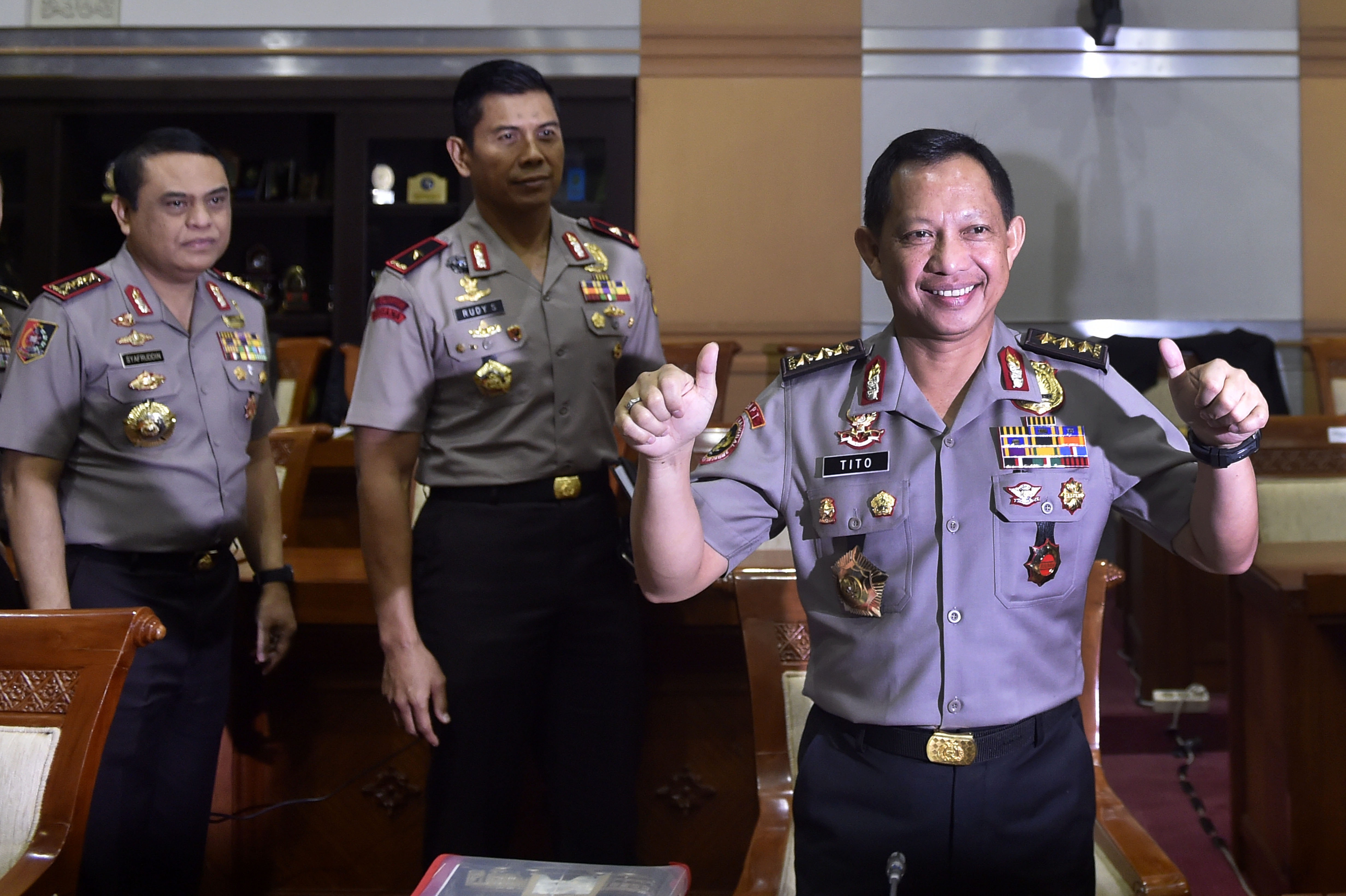 Calon tunggal Kapolri Komjen Pol Tito Karnavian (kanan) bersiap mengikuti uji kelayakan dan kepatutan di ruang rapat Komisi III, Komplek Parlemen Senayan, Jakarta, Kamis (23/6). Kepala Badan Nasional Penanggulangan Terorisme tersebut diajukan oleh Presiden Joko Widodo sebagai calon tunggal Kapolri menggantikan Jenderal Pol Badrodin Haiti. ANTARA FOTO/Puspa Perwitasari/foc/16.