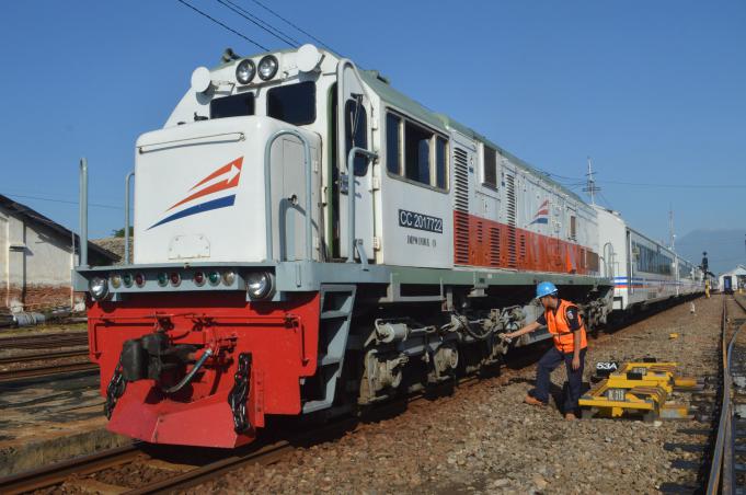 Petugas schowing melakukan pengecekan rangkaian Kereta Api (KA) kelas eksekutif sesaat sebelum berangkat menuju Surabaya guna menjalani uji mekanik dari Stasiun KA Madiun, Jatim, Jumat (13/5). PT Industri Kereta Api (Inka) Madiun bersama PT Kereta Api Indonesia (KAI) melakukan uji mekanik satu dari lima rangkaian KA eksekutif pesanan PT KAI dengan nilai kontrak Rp304 miliar sebelum diserahkan kepada pemesan yang akan mulai dioperasikan mulai pelaksanaan angkutan lebaran 2016. ANTARA FOTO/Siswowidodo/aww/16.